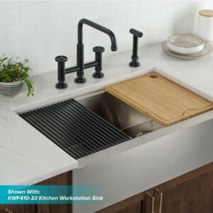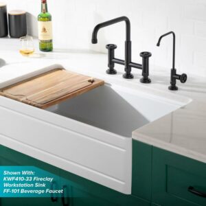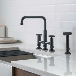 Corrosion-resistant finish will not fade or tarnish over time. Solid brass construction and top of the line components ensure long-lasting leak-free performance. Bridge faucet design with horizontal bar connects hot and cold water handles to the faucet spout for a bold classically-inspired look. Dual-function faucet with side sprayer for extended reach all around the sink. Spout height is vertically adjustable up to 1″ to accommodate large cookware, with locking feature to ensure stability. Non-slip grip diamond-mesh texture on handles makes them easy to turn while adding a touch of industrial style. Faucet comes with flexible pre-attached waterlines and quick connect sprayer hose for easy installation. Adjustable flow rate can be modified from 1.8 GPM to 2.2 GPM. Satisfaction guaranteed with top-rated customer service that puts you first