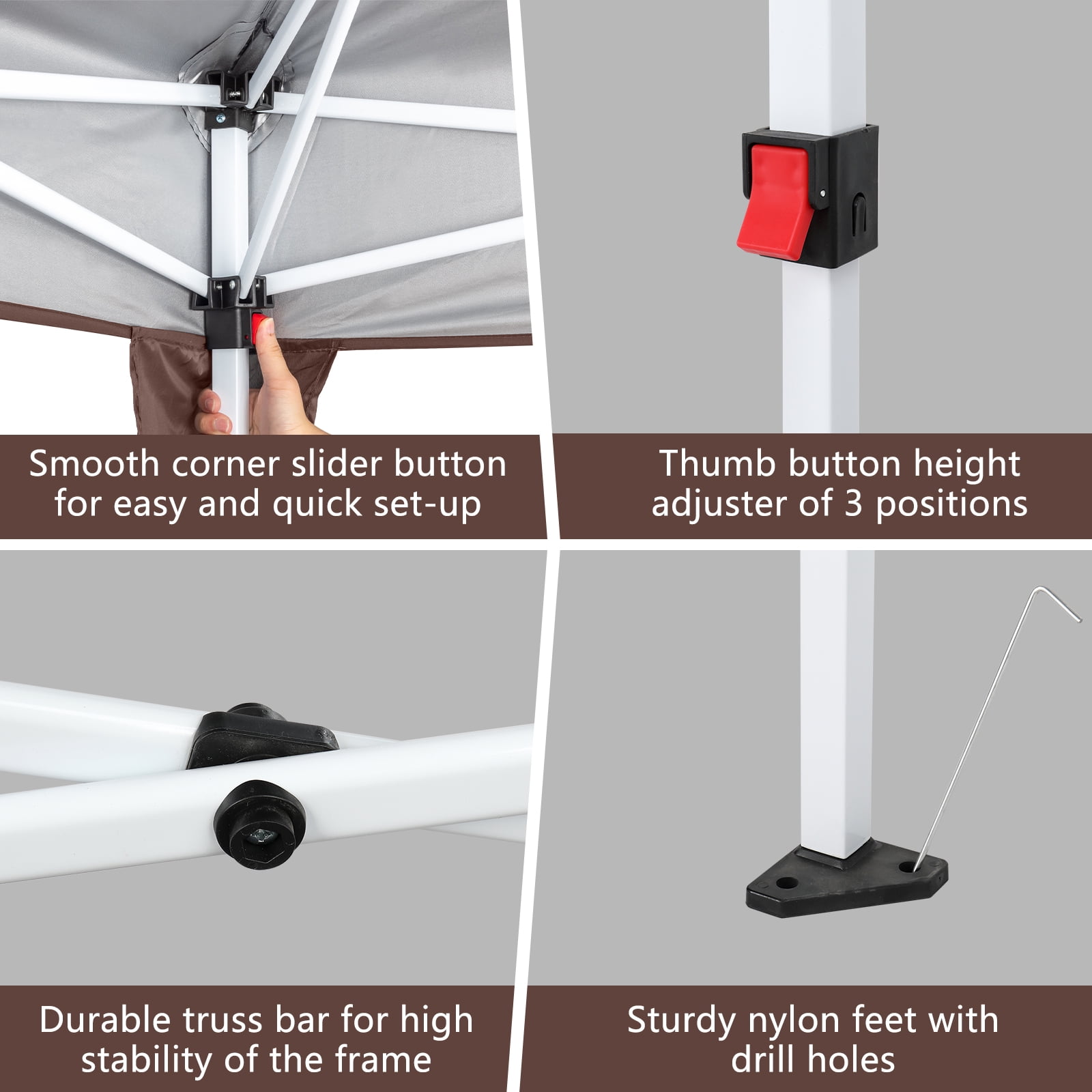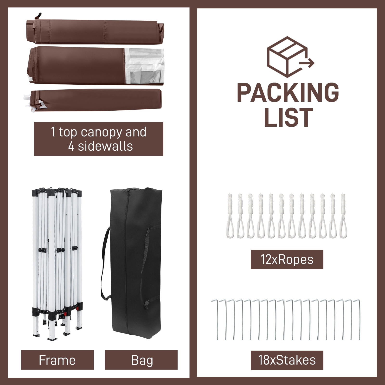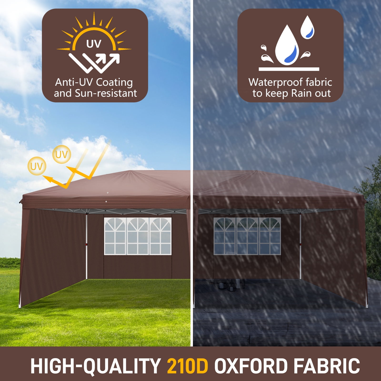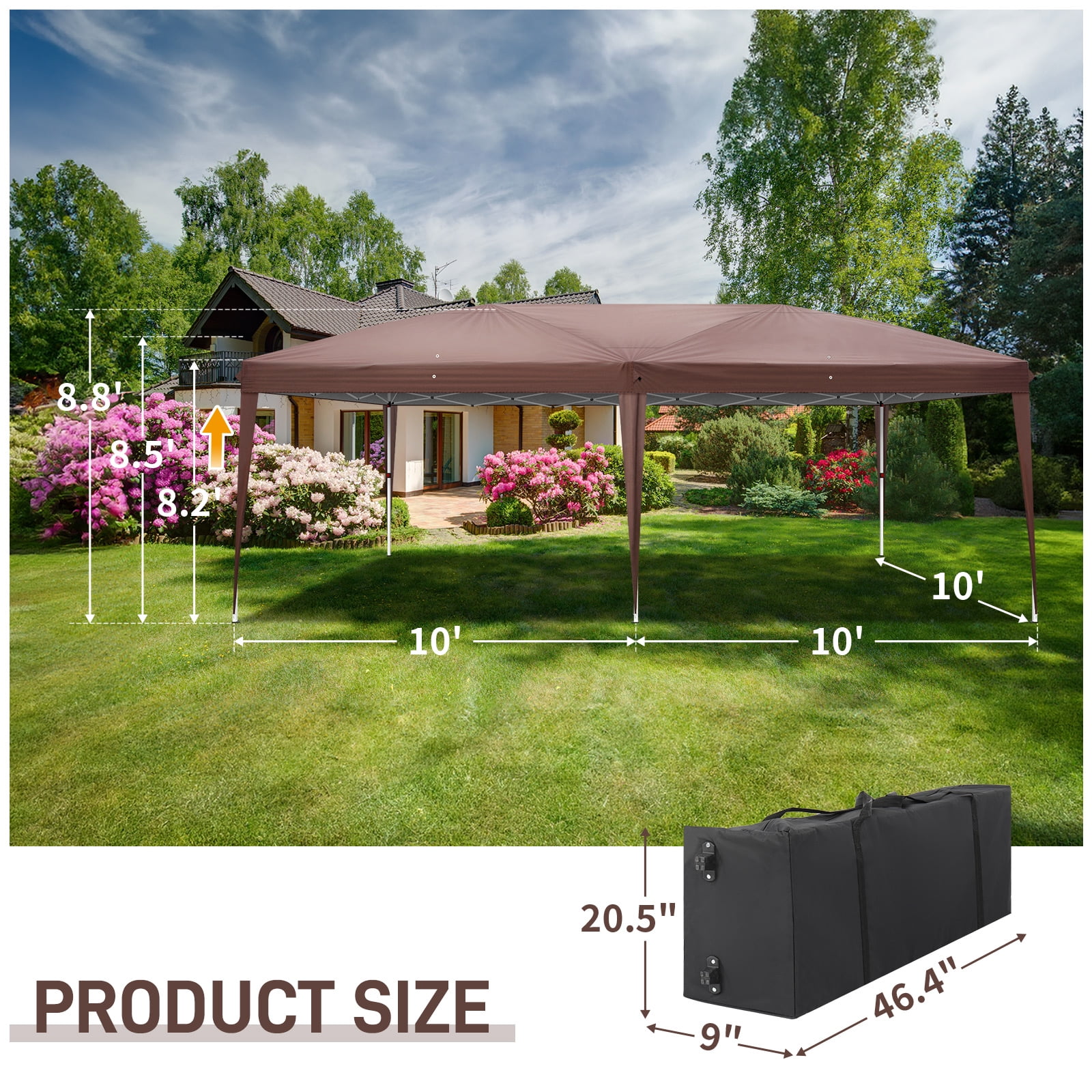 Features: Upgraded Frame: A truss-reinforced roof and powder-coated steel pipe come together, creating a outdoor tent with greater endurance to outdoor conditions. Stakes allow you to mount it to any soft surface outside. Sun Shade Canopy: Stop sunburns and get rid of glare in a structure intended to stay stylish. The top of our instant canopy is made of Oxford fabric with a silver coating to raise its resistance to moisture and UV fading. Grommets prevent rain accumulation, reducing the weight load if not taken down in time. OVERALL DIAMENSION:10’X20′ (3m*6m) outdoor canopy tent with 4 wall sides can hold up to 30 people. 3 heights to adjust. From gound to tent top: 8.2ft/8.5ft/8.8ft MATERIAL:Super quality 210D waterproof canopy fabric can block 90% sunray and offer UV protection. It’s suitable to use at outside no matter when rainy or sunny day. With a waterproof carry bag, ropes and stakes, you can take it out for different activities Specifications: Material: 210D Silver Oxford Fabric & Steel Color: Dark Coffee Dimensions: (118 x 236)” / (300 x 600)cm (L x W) Weight: 51 lbs / 23 kg Waterproof: Yes Suitable for: All Kinds Of Events Height of Sides: 78.74″ / 200cm Height of Roof: 100.39″ / 255cm Steel Pipe Diameter: Small Pipe: (0.98 x 0.98)” / (2.5 x 2.5)cm (L x W) Big Pipe: (1.18 x 1.18)” / (3.0 x 3.0)cm (L x W) Crossed Pipe/Top Pipe Diameter: (0.39 x 0.71)” / (1.0 x 1.8)cm (L x W) Door Quantity: 2 Pcs WindQuantity:2Pcs With Periphery Cloth: YES Package Includes: 1 x Tent 1 x Carry Bag 1 x Instruction