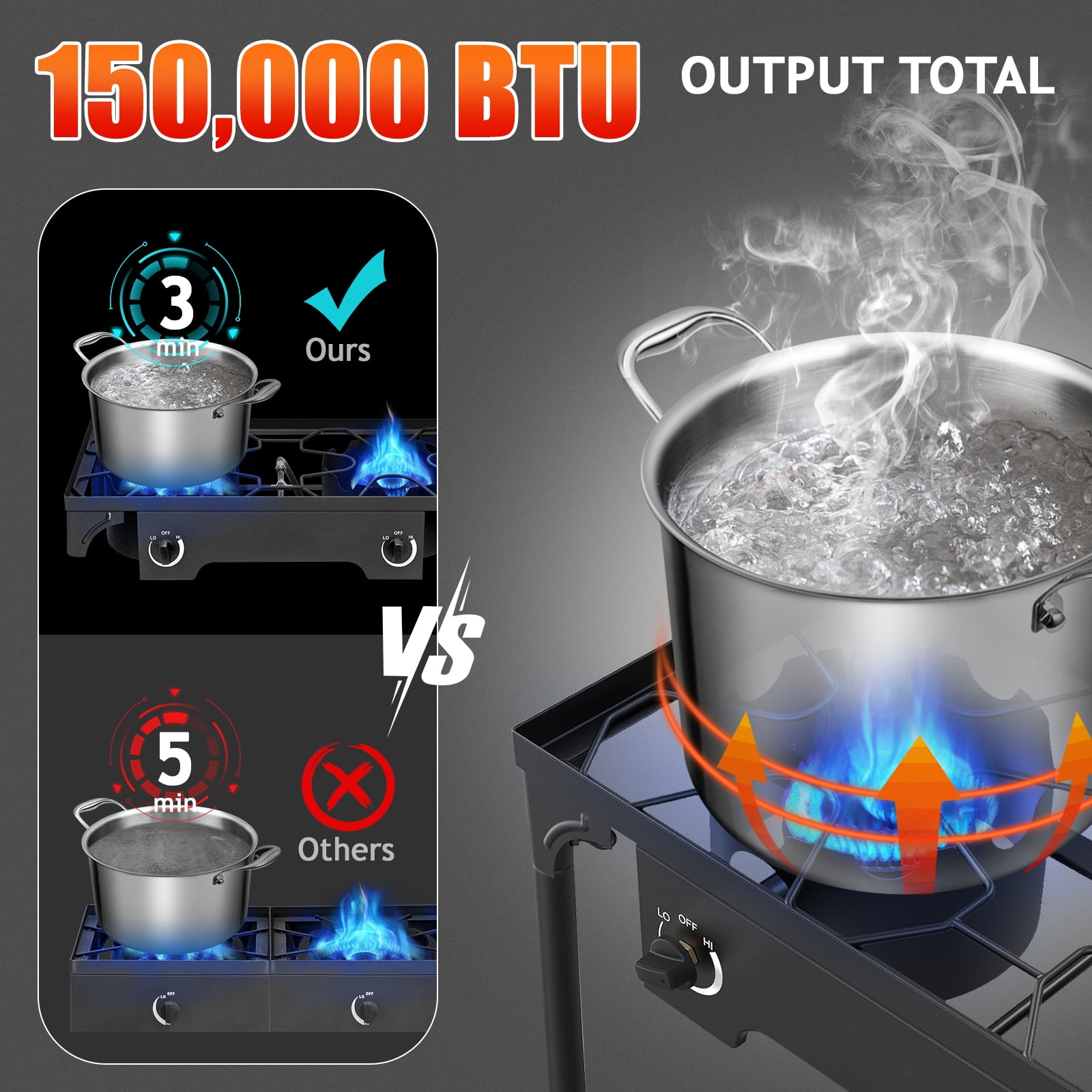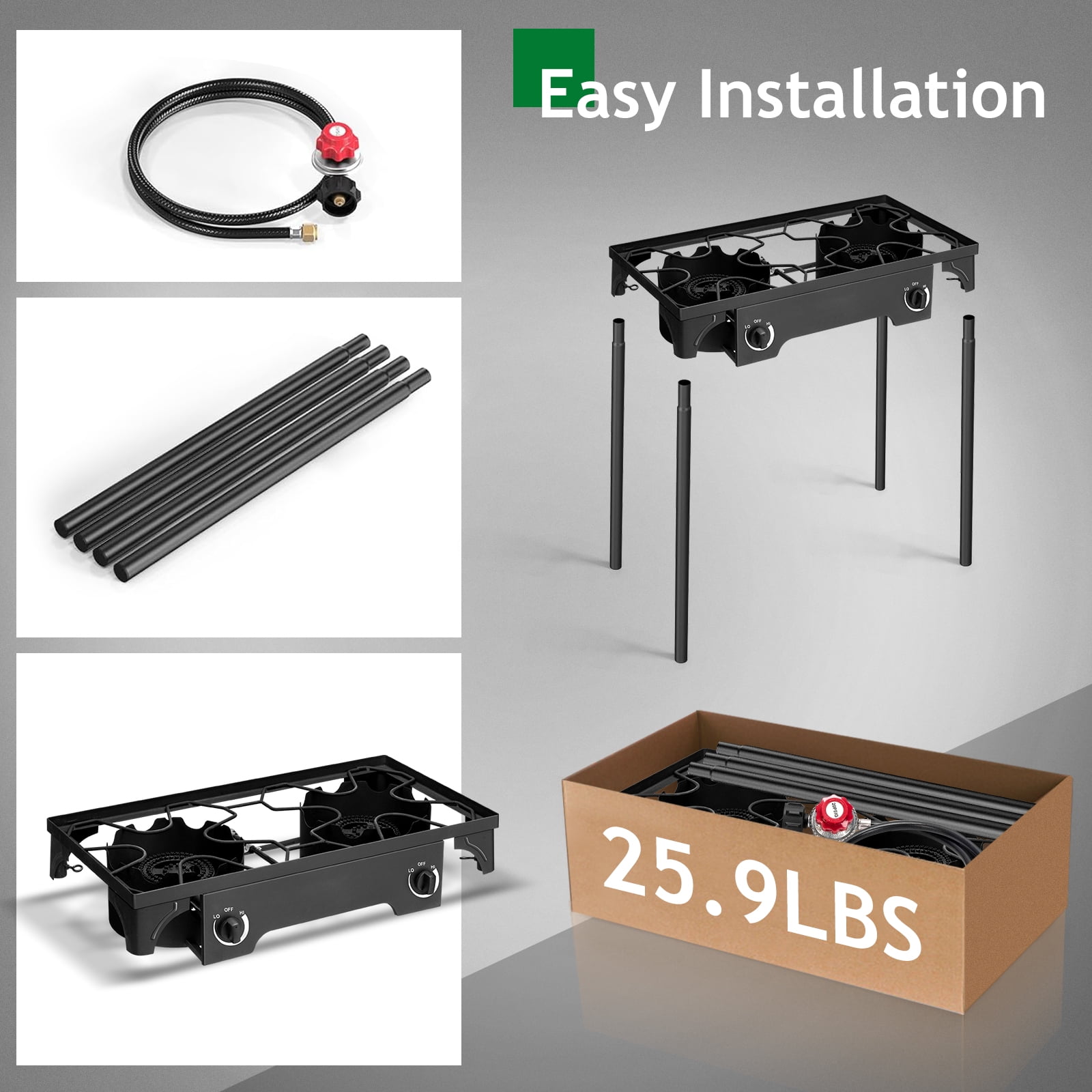Introductions: High-pressure double burner camp stove, sturdy and durable design, made of cast iron long lasting and good for projects 150000 BTU of cooking power Ultra-portable with removable legs 0-20 psi adjustable make cook faster and cleaner than other standard propane burners Perfect for camping, fishing, parties, tailgates hunting and home brewing Package Includes: 1 x Double Burner Stove 1 x 0-20 Psi Regulator 1 x Instruction