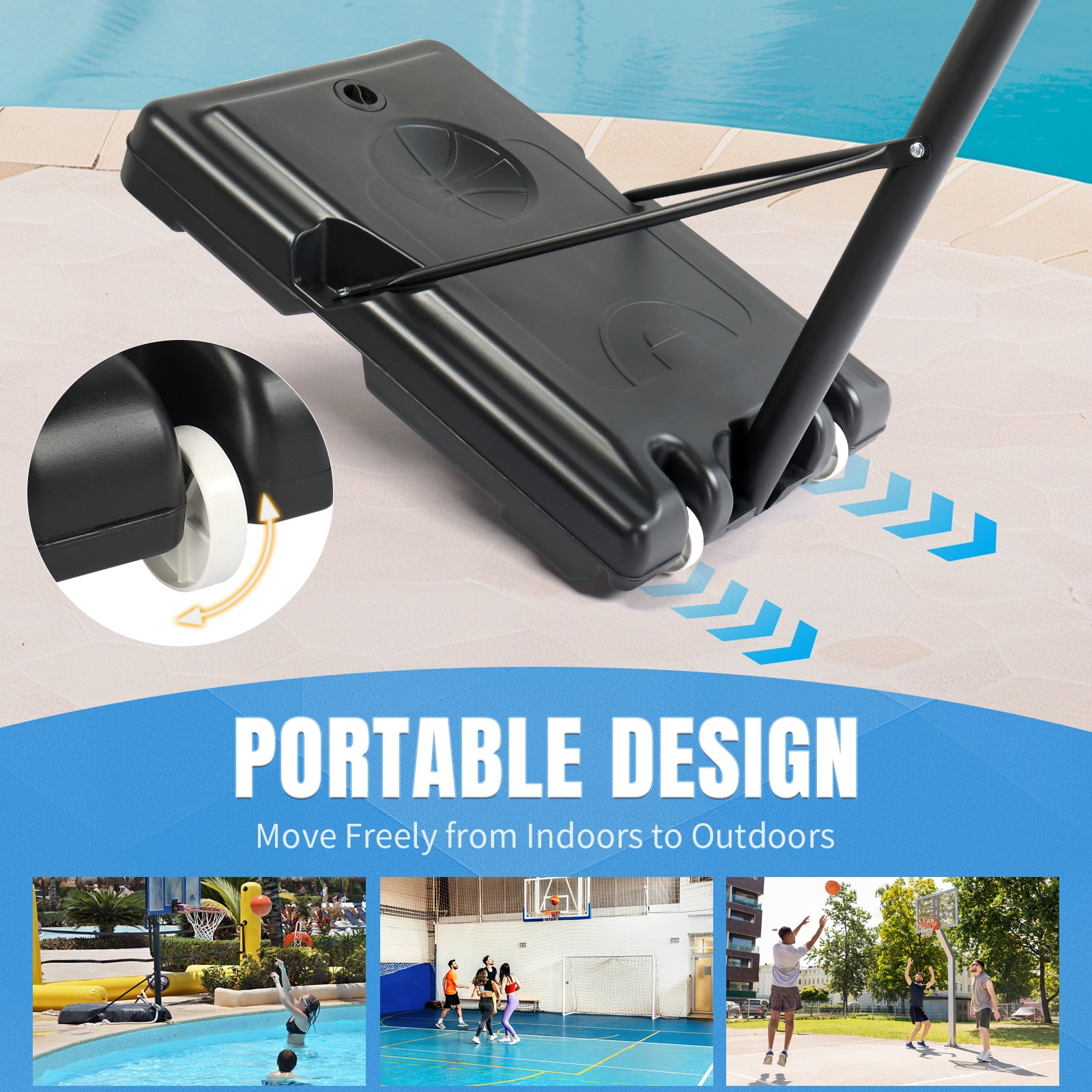 A 44in shatterproof PC backboard encourages high-rebound action and is weather-resistant to handle the most intense outdoor competitions Its superior stability diminishes wobbling, which can interfere with your aim, thus ensuring that your shots remain accurate. The design of the shock-absorbing bumper of the basket can reduce the impact force caused by the collision. The product adopts a new base design, which can only be filled with water, or just place heavy objects in the grooves, or it can be filled with water and then placed with heavy objects to make its support more stable. This is not a ordinary basketball hoop toy, but the PROFESSIONAL basketball starter training set.