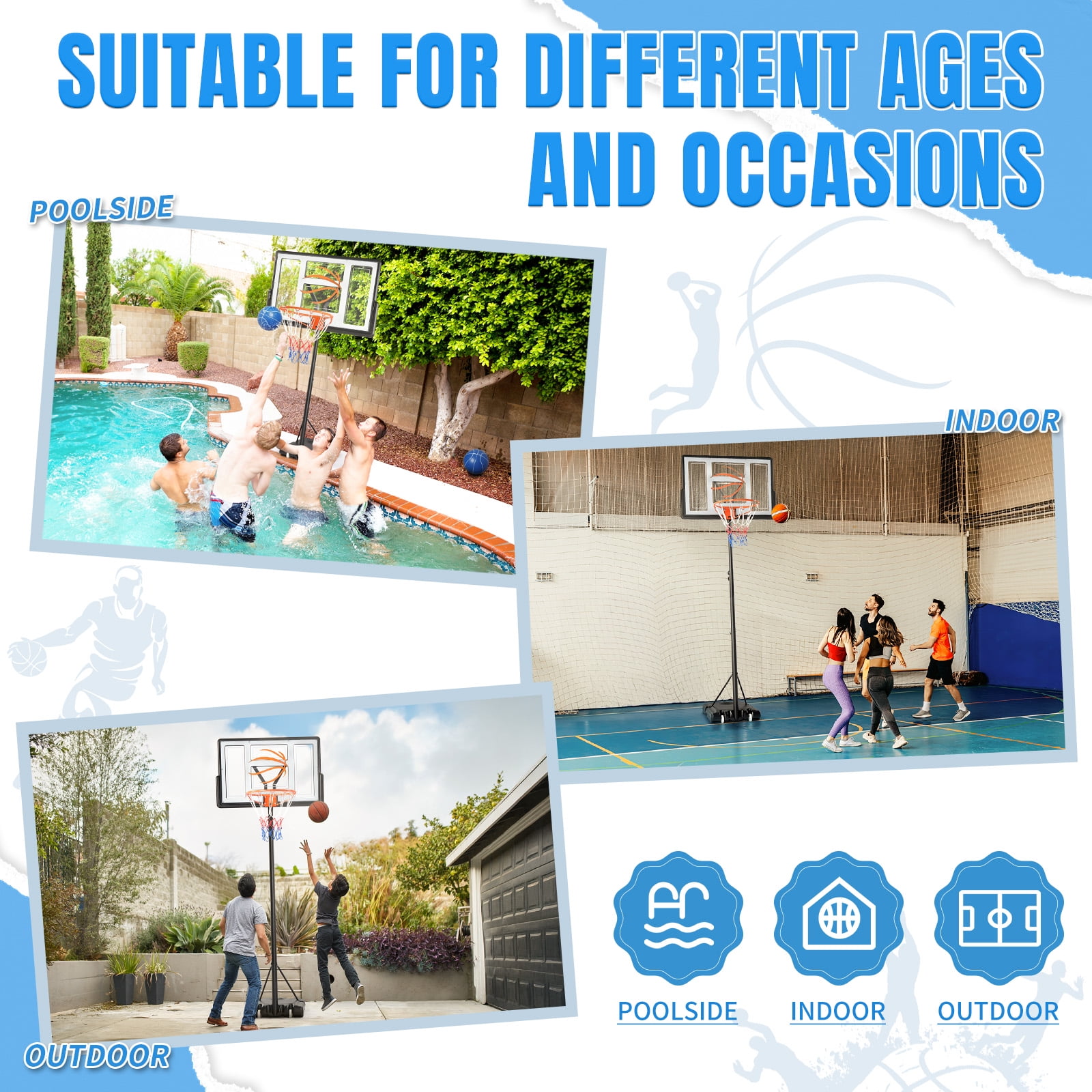 ★【EXCLUSIVE MOLDED LARGER BASE】 Our basketball hoop system boasts a robust, larger base measuring 44”L x 28”W, compared to the standard 36”L x 24”W. This design ensures greater load-bearing capacity and can withstand strong winds. The base can be filled with water or sand to guarantee excellent stability and safety for every shot. ★【HEIGHT ADJUSTABLE FROM 4.4FT TO 10FT】 The adjustable lift system of our basketball hoop indoor features 11 height levels, providing versatility for various settings. It can be installed both indoors and outdoors, including driveways, backyards, front yards, parks, playgrounds, garages, gyms, etc. The height ranges from 7.55ft to 10ft with three poles, and from 4.43ft to 6.4ft with two poles. ★【PREMIUM DURABILITY】 Our outdoor basketball hoop is built to last with high-quality materials. It includes a shatterproof backboard, shock-absorbing hoop, thick solid PE net, and anti-rust steel poles and hardware, ensuring long-term durability and reliability. ★【ENTERTAINMENT FOR ALL AGES】 With its adjustable height feature, our basketball hoop is perfect for all age groups. It provides a fun activity for kids after school, encouraging them to stay active, and offers a relaxing pastime for adults after work. This basketball hoop is ideal for promoting family and friends’ bonding. ★【SIMPLE INSTALLATION】 Assembling our portable basketball hoop is straightforward with labeled parts and clear, easy-to-follow instructions. Additionally, an online assembly video is available to assist you further.