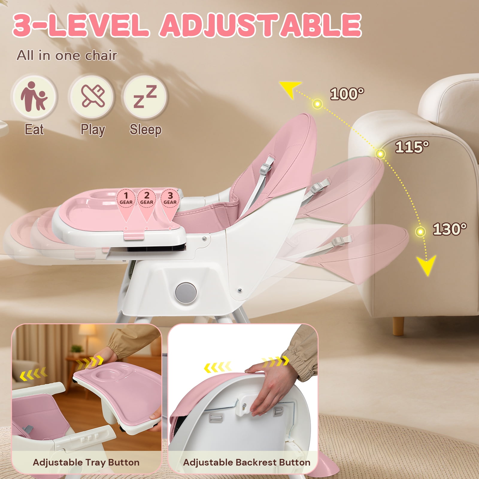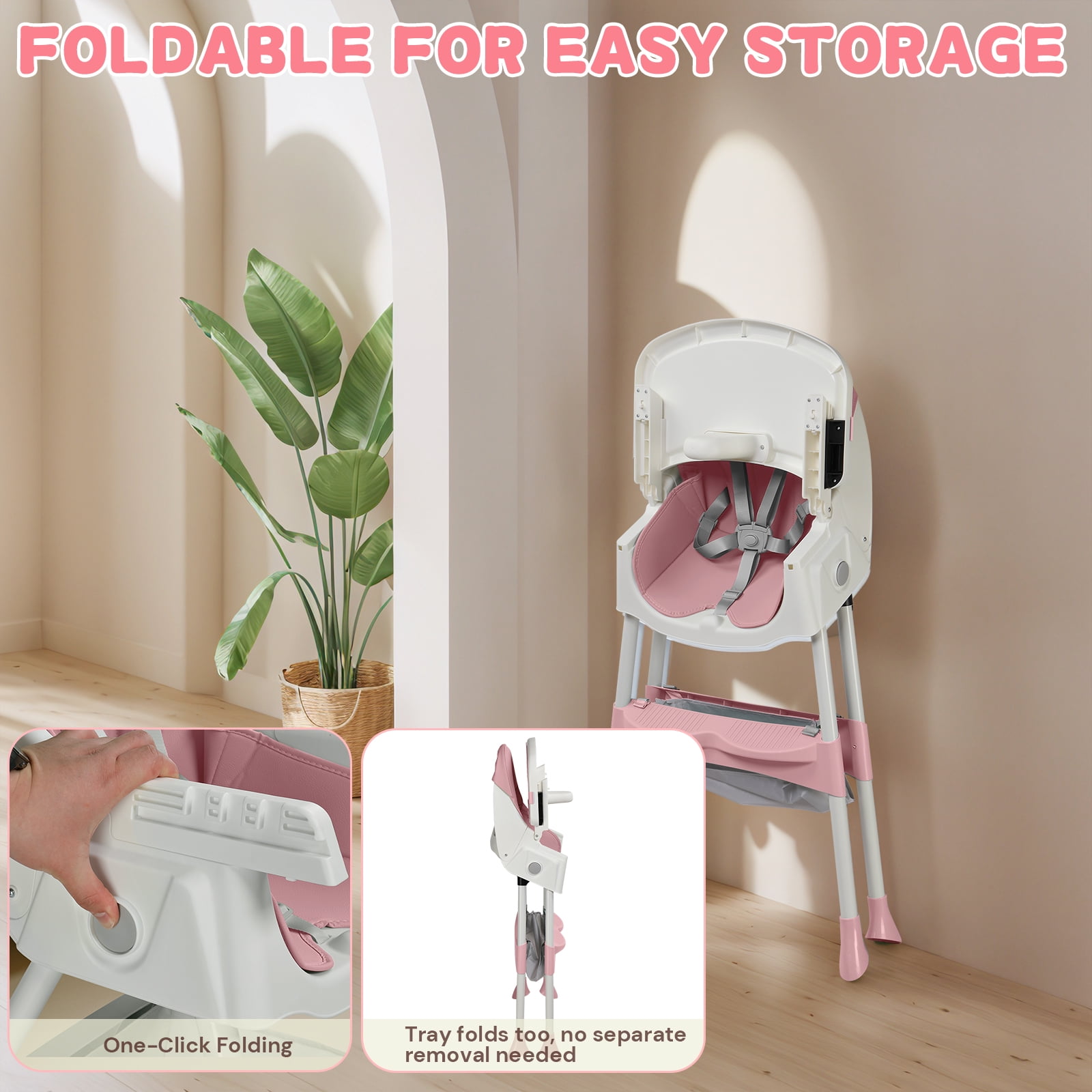 Ktaxon Baby High Chair, Convertible 6 in 1 High Chairs for Babies and Toddlers, Foldable Baby Highchair with 5-Point Safety Harness, Adjustable Dining Tray, Backrest & Height, Pink