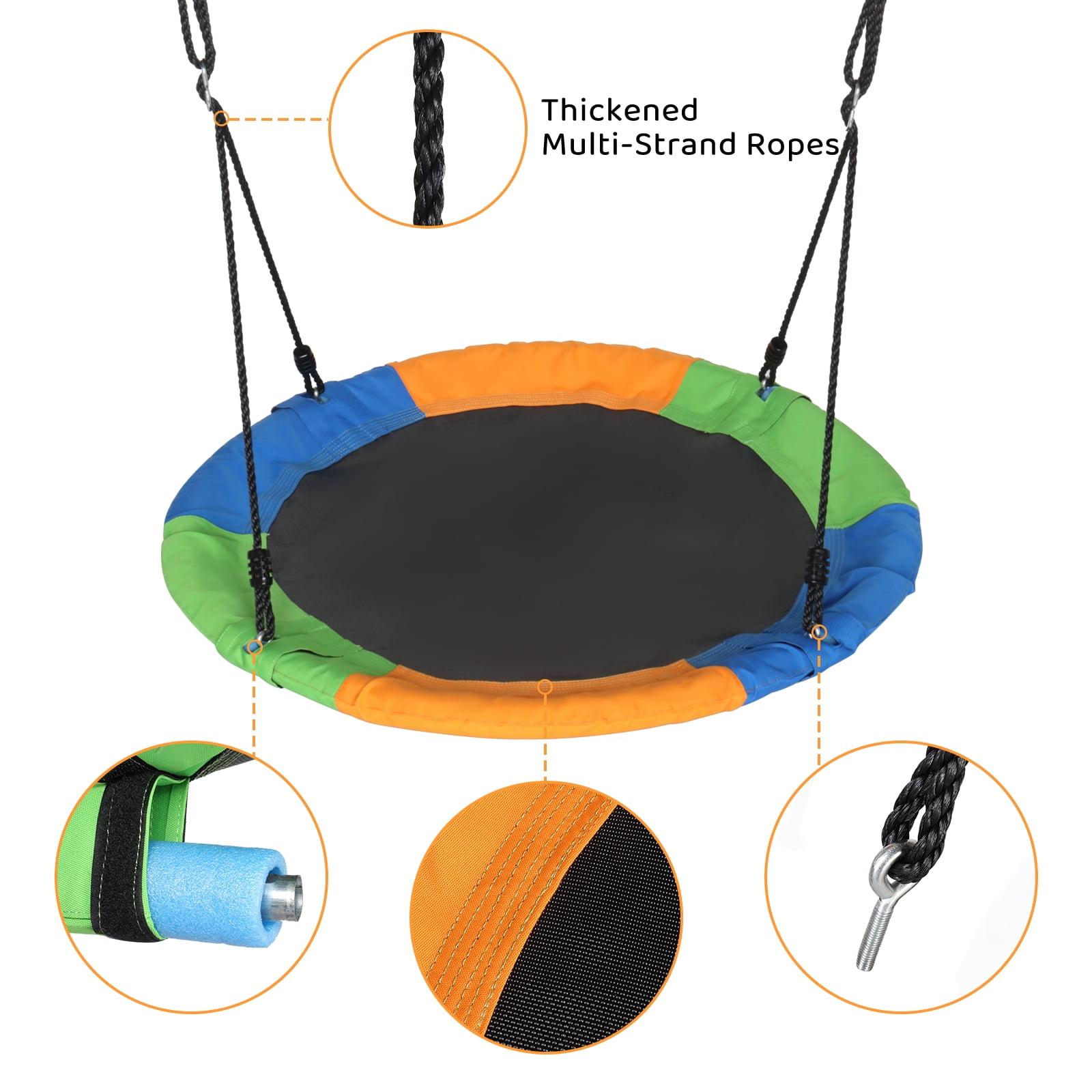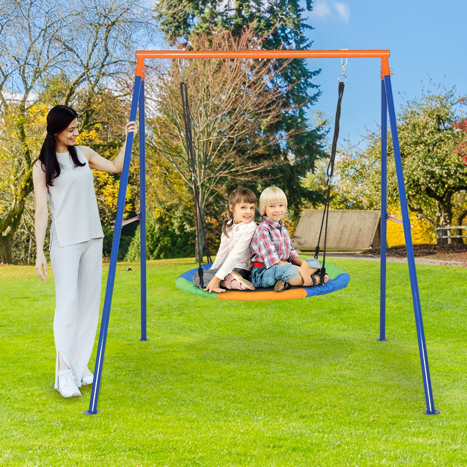 Sturdy Swing Frame – The swing’s A-frame design offers exceptional stability and support, ensuring a safe user experience. With a weight capacity of 440 lbs, this sturdy swing stand features a paint-coated surface that is both smooth and rust-resistant. Easy to Assemble – This set of swing and stand is designed to be assembled effortlessly. The set includes pre-punched components and a comprehensive instruction manual, allowing you to complete the installation quickly and easily without any hassle. For Outdoor Play – The swing stand is perfectly sized for your backyard. It provides an exciting play area for your children and accommodates various swing types, such as the flying saucer swing, baby swing, swing chair, and more. Saucer Swing Included – This swing set comes with a 40-inch saucer swing that offers excellent support (up to 660 lbs), exceeding other kids’ swings. Perfect Gift Choice – The saucer swing set is a perfect gift for children to enjoy on birthdays, holidays, weekends, and other special occasions. Your kids or grandchildren can spend hours of fun on this swing, sitting or lying on the large circle seat, and swaying their legs happily in the backyard or public parks. Specifications: Material: Iron Weight Capacity: 550lbs Round swing diameter: 40inch Swing Frame Size:194*180*185cm Package Size:105*26*18cm Gross/Net weight:17/19.5kg Package Included: Swing frame*1 Round Swing*1 Instruction *1 Ground Nail*4