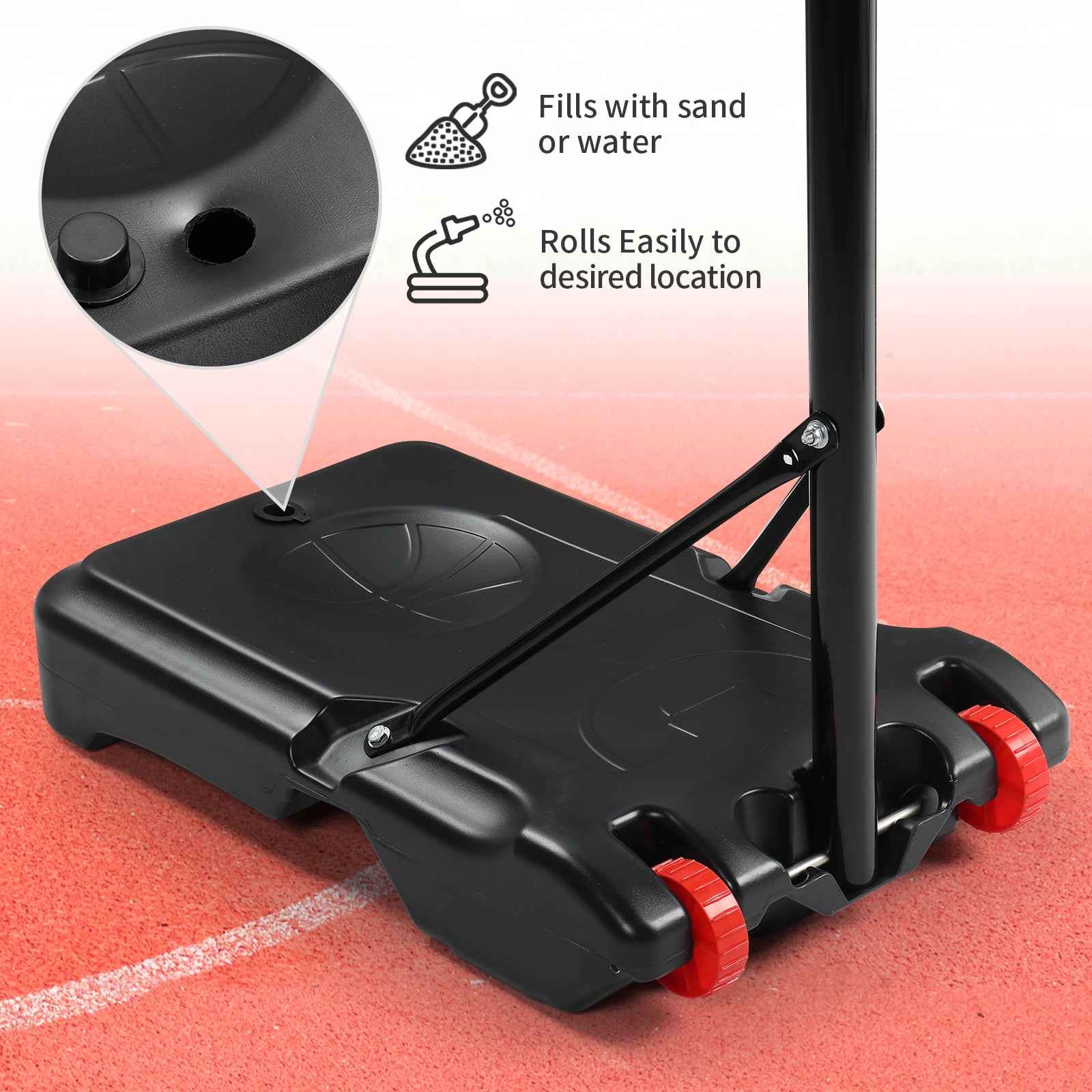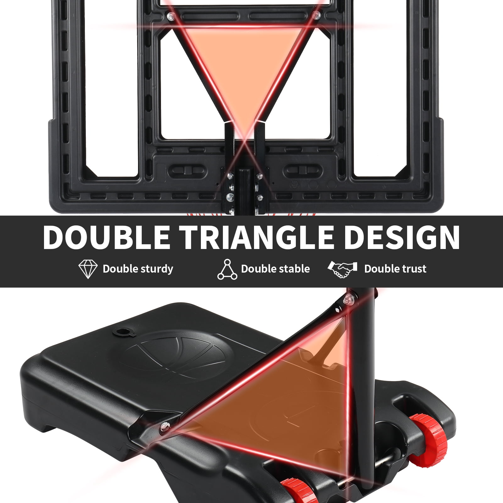 Height Adjustable — Easily adjust the hoop’s height from 6.5 to 8 feet to accommodate players of all ages and skill levels. Sturdy Triangular Design — Upgraded backboard support poles provide enhanced stability, while both the base and backboard form stable triangular structures. Complete Set — This basketball hoop comes with a standard Size 5 basketball and an air pump, so you’ll be ready to play right away. Easy Installation — We provide a detailed instruction manual and installation video for a hassle-free setup. If you encounter any issues, don’t hesitate to contact us for support. Durable Weather-Resistant Backboard — The 33-inch shatterproof backboard is built to withstand tough play and can be used in any weather conditions. Spacious Base Water Tank — The base water tank measures (76 x 46 x 13)cm / (30 x 18 x 5)”, providing stability and peace of mind during intense games.