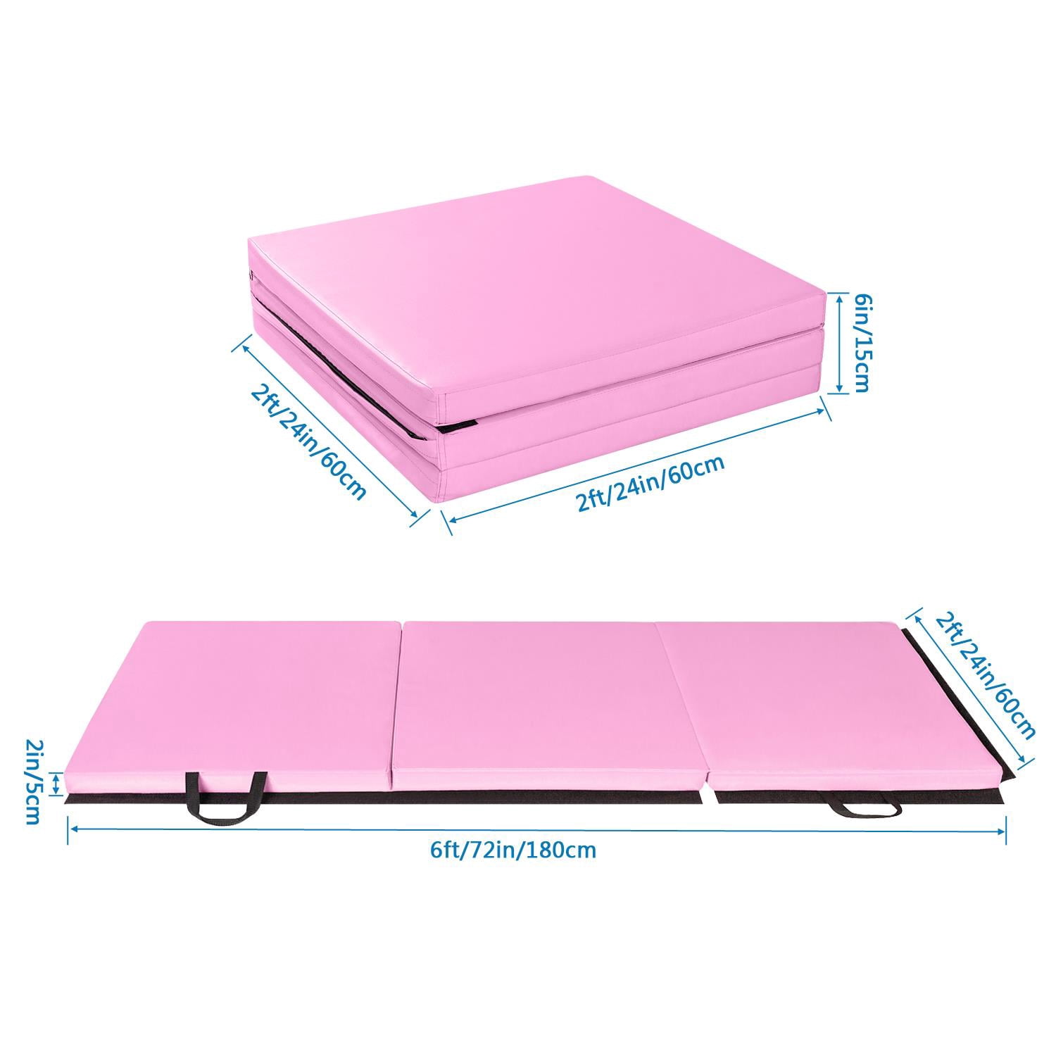 Foldable and handle design Yoga mat adopts a three-fold design, which can be folded to the smallest size of 24×24×6inches, which is convenient for storage and saves space. The portable handle is designed on the side. After folding the yoga mat, you can place it in the corner of a closet or room, or you can easily transfer it to any place you want by driving. Safe, non-toxic, environmentally friendly material Gymnastics Mat surface is made of PU leather that is tear-resistant,puncture-proof, non-toxic and waterproof.When you use it,You don’t need worry about sweat dripping on the gym mat during use.just wipe it with paper or cloth, easy clean.Mat inside is filled with EPE high-density foam,which has better elasticity and more durabl quality than other materials, give you a more comfortable experience. Thickened design,Great size Folding gym mat thickness is increased to 2in, which has more elasticity and comfort.mat can be placed on a hard floor, The thick and soft EPE material ensures that if you accidentally fall during exercise, you don’t have to worry about getting injured.Protect knee joints, elbow joints.The unfolded size of the gymnastic mat is 6ft×2ft×2in , which is suitable for professional gymnasts, but also very suitable for you or your children, grandchildren and grandchildren practice some gymnastic actions at home, improve physical flexibility. Zipper and Magic Tape design Tumbling mats are equipped with a zipper on the outer surface. When you use it for a period of time, if you want to clean it, you can easily remove it.A single cushion is suitable for people height under 5’9″ , if you think one mat is too small,We design Magic Tape on the side of gymnastic mat,you can buy more of our same mat, put these mat together, increase the size, Reach your satisfied size, humanized design, convenient to use. Multifunctional use Our gymnastic mat allows you to do cartwheel, somersault, handspring and other gymnastics actions at home.Or you can use it as a yoga mat,also you can fold it up as a floor mat, even you can also use it as a baby crawling mat, with multiple functions waiting for you find. Specifications 1. Material: PU;EPE 2. Color: Pink 3. Unfolding Dimensions: 72x24x2″ / (180 x 60 x 5)cm 4. Folding Dimensions: 24x24x6″ / (60 x 60 x 15)cm 5. Weight: 2.4kg / 5.29lbs 6. Type: Three Folds 7. Conditon: New Package Includes 1 x home gym mat