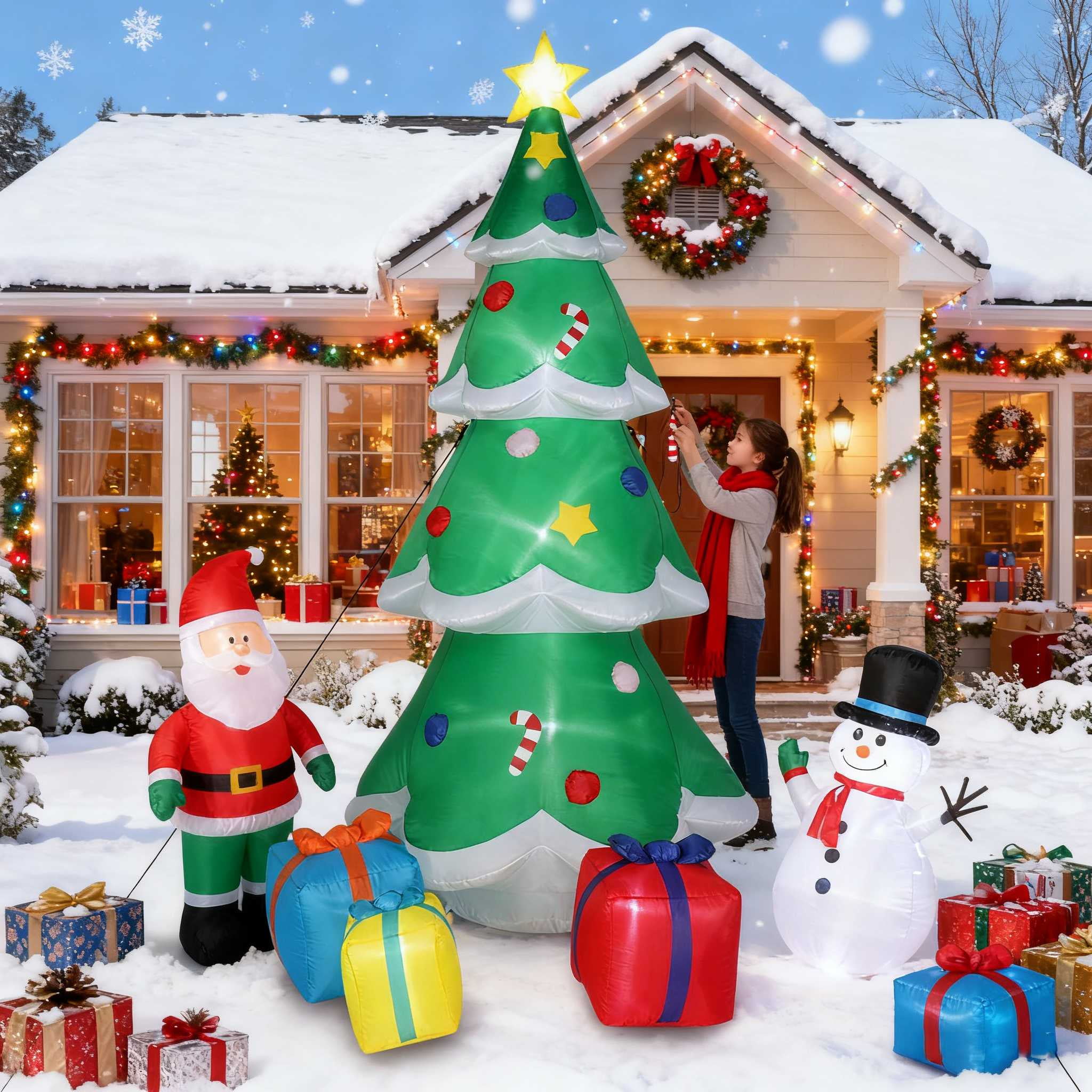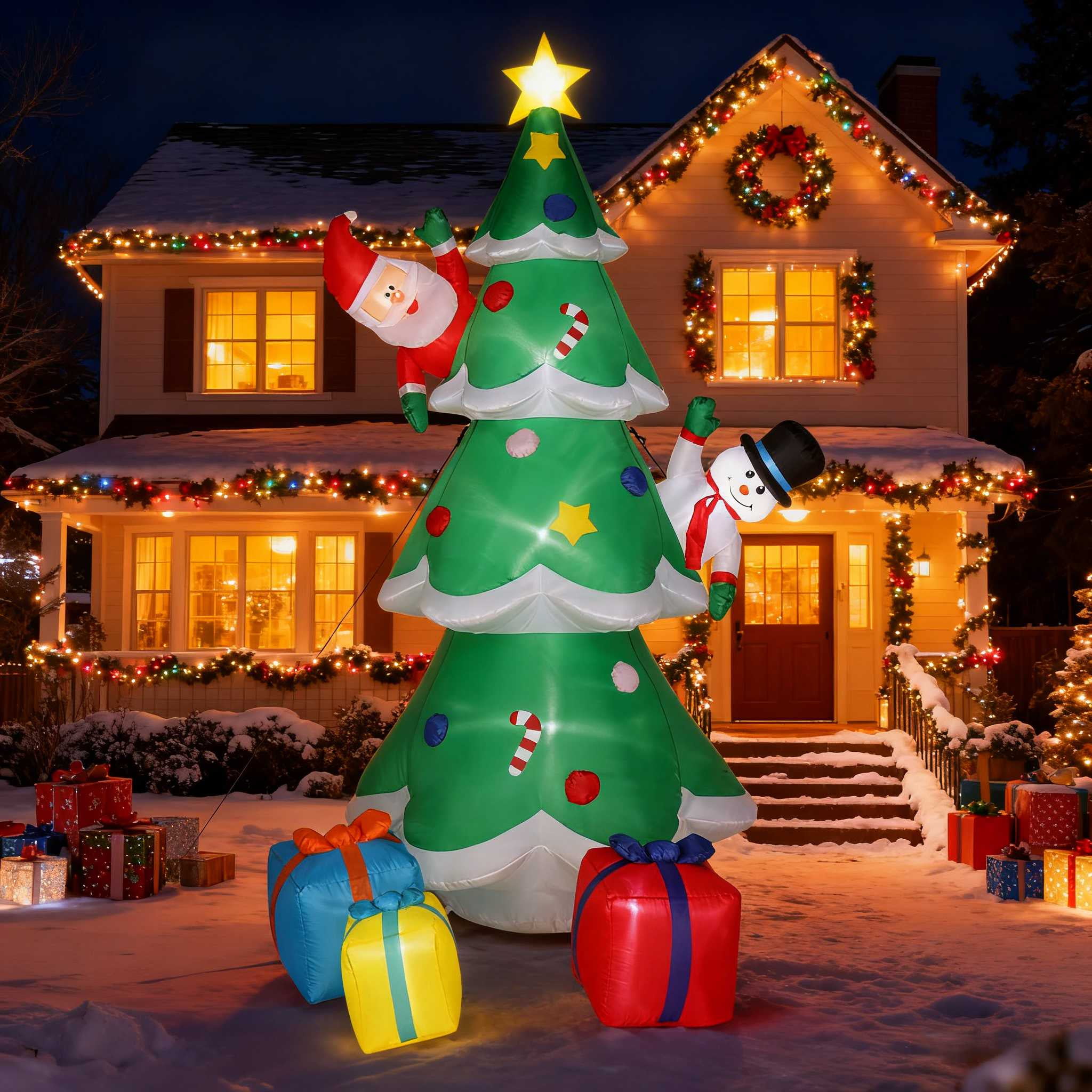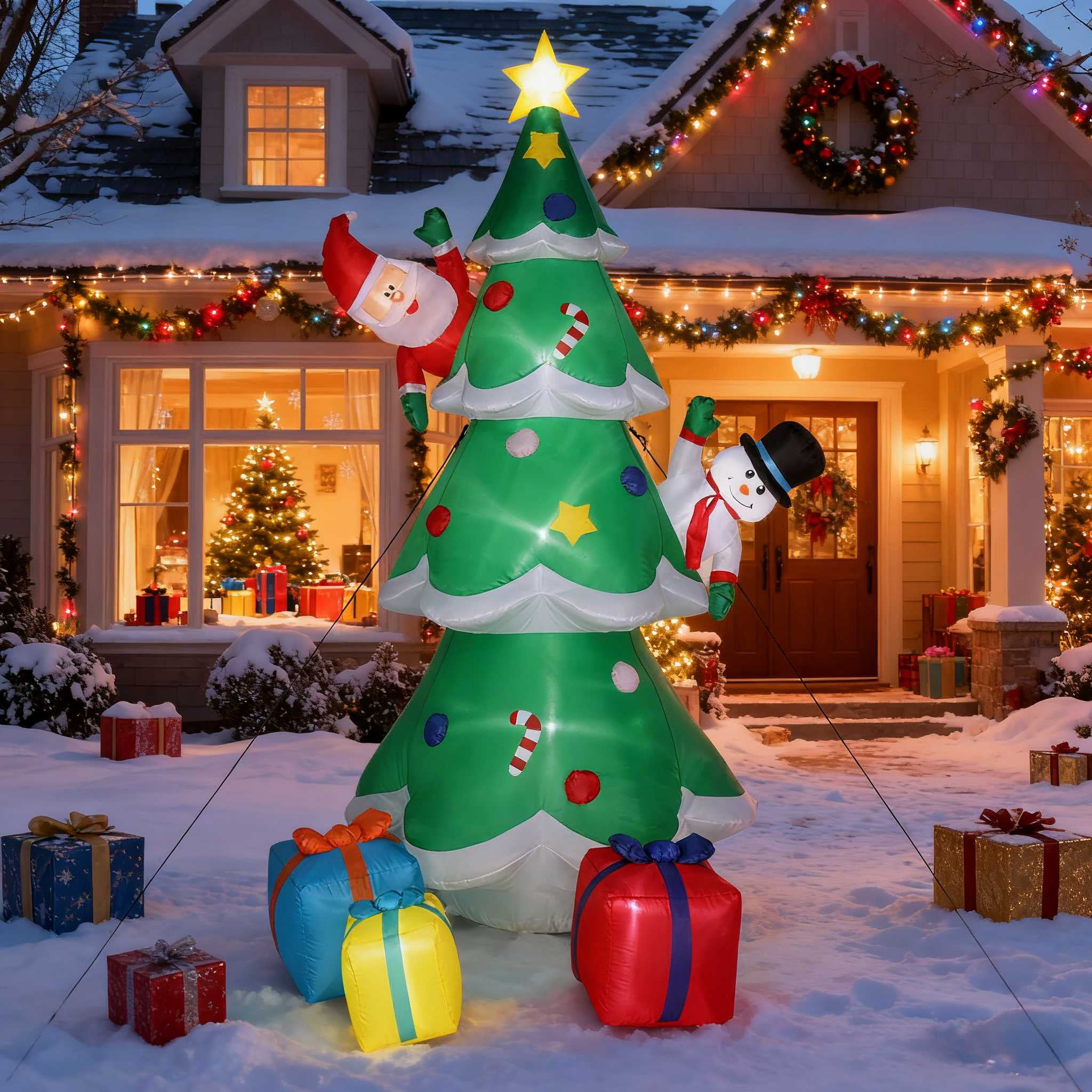 Introductions: 8FT Christmas inflatable tree with 3 multicolor gift boxes and star perfect for indoor and outdoor, yard, garden, lawn. Inflatable Christmas tree decorations with small Santa and snowmen will make your yard more interesting and funny, delight all your neighbors and guests, and create a Christmas festive. You will get one 8ft outdoor Christmas inflatable tree decorations with6 x Plastic Plug ,6 x Webbing ,1 x 2*2M Drawstring. Christmas outdoor inflatable garden decorations to add a festive atmosphere to Christmas, perfect for decorating homes, offices, yards, shopping malls, or even classrooms. Specifications: 1. Dimensions: (96.06 x 40.16 x 59.06)” / (244 x 102 x 150)cm(L x W x H) 2. Height: 8ft 3. Net Weight: 4.85lbs / 2.2kg 4. Fan Specification: 12V/1A Package Includes: 6 x Plastic Plug 6 x Webbing 1 x 2*2M Drawstring