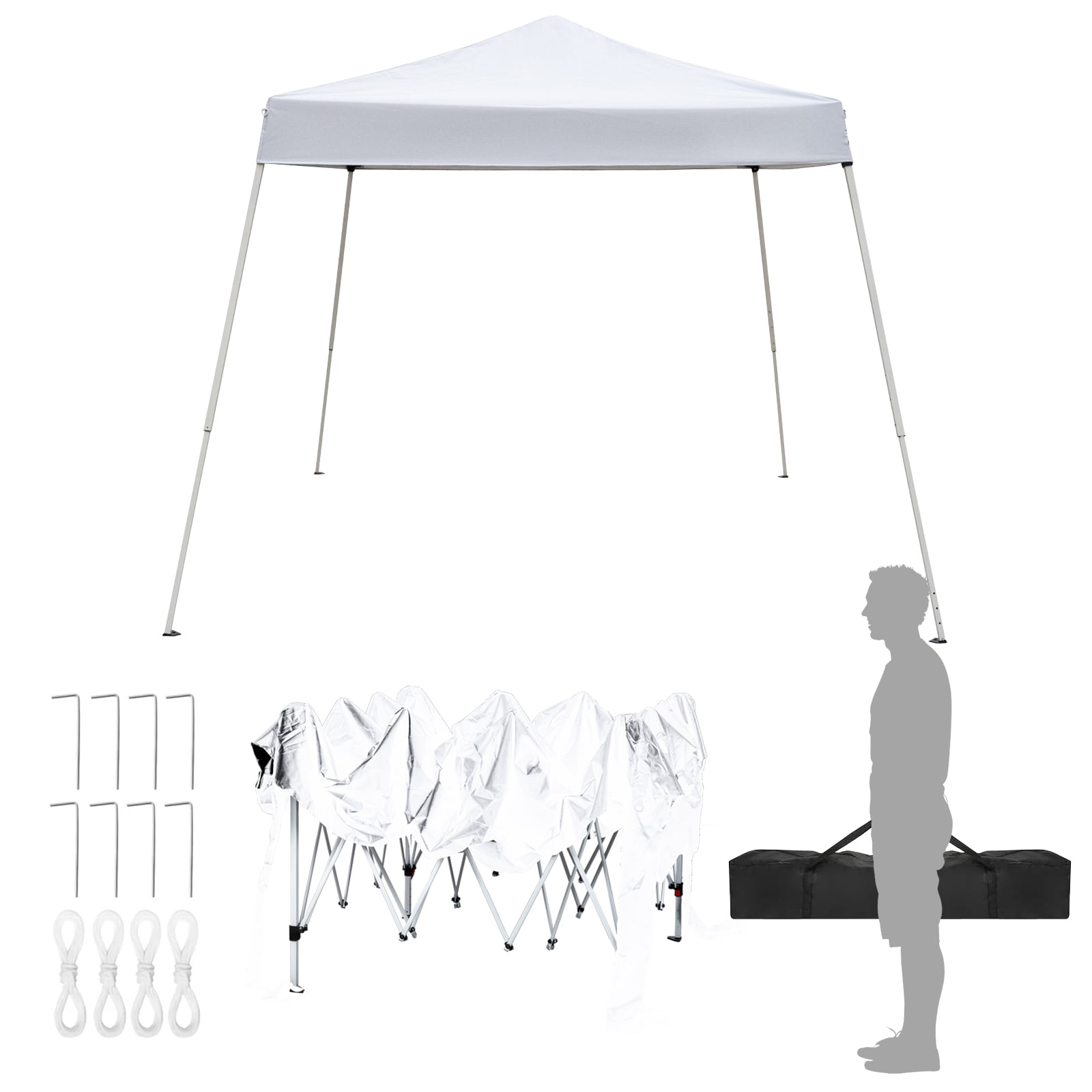 FEATURES: Lightweight & portable – weighing only 22 pounds This lightweight canopy is one of our lightest and most portable models. One minute setup – takes only a minute to set up. Folding steel frame with no loose parts. No tools required. Setup and breakdown is quick and easy with the push button toggle Leg adjustments and the oversize easy grab pull Pins at the top corners. Angle leg design – Stable base with an extra wide 10’x10′ Footprint and 8’x8′ At top. Weight: 22 lbs. Take anywhere – this canopy is ready for anything and anywhere. Take this to the beach one day and a family BBQ The next. This lightweight canopy is easy to transport from place to place. SPECIFICATIONS: 1. Roof Material: 210D Silver-coated Fabric 2. Cloth Process: Powder Coating 3. Tube Material: Iron 4. Color: White 5. Dimensions: 118.1″ x 118.1″ (L x W) 6. Weight: 25.53 lbs 7. Waterproof: Yes 8. Suitable for: Parties,BBQs,Markets,Sporting Events,Camping,Yard School Events and Trade Shows 9. Crossed Tube and Roof Tube Size: 10 x 18 x 0.45mm (Oval Tube) 10. Foot Tube Size: 25 x 25 x 0.6mm / 20 x 20 x 0.6mm 11. Height of Side: 79″ 12. Height of Top: 100.39″ 13. Tent Structure: Single Tent 14. with Foot Cloth: Yes 15. with Surrounding Cloth: No PACKAGE INCLUDES: 1 x Tent 1 x Carry Bag 1 x Instruction