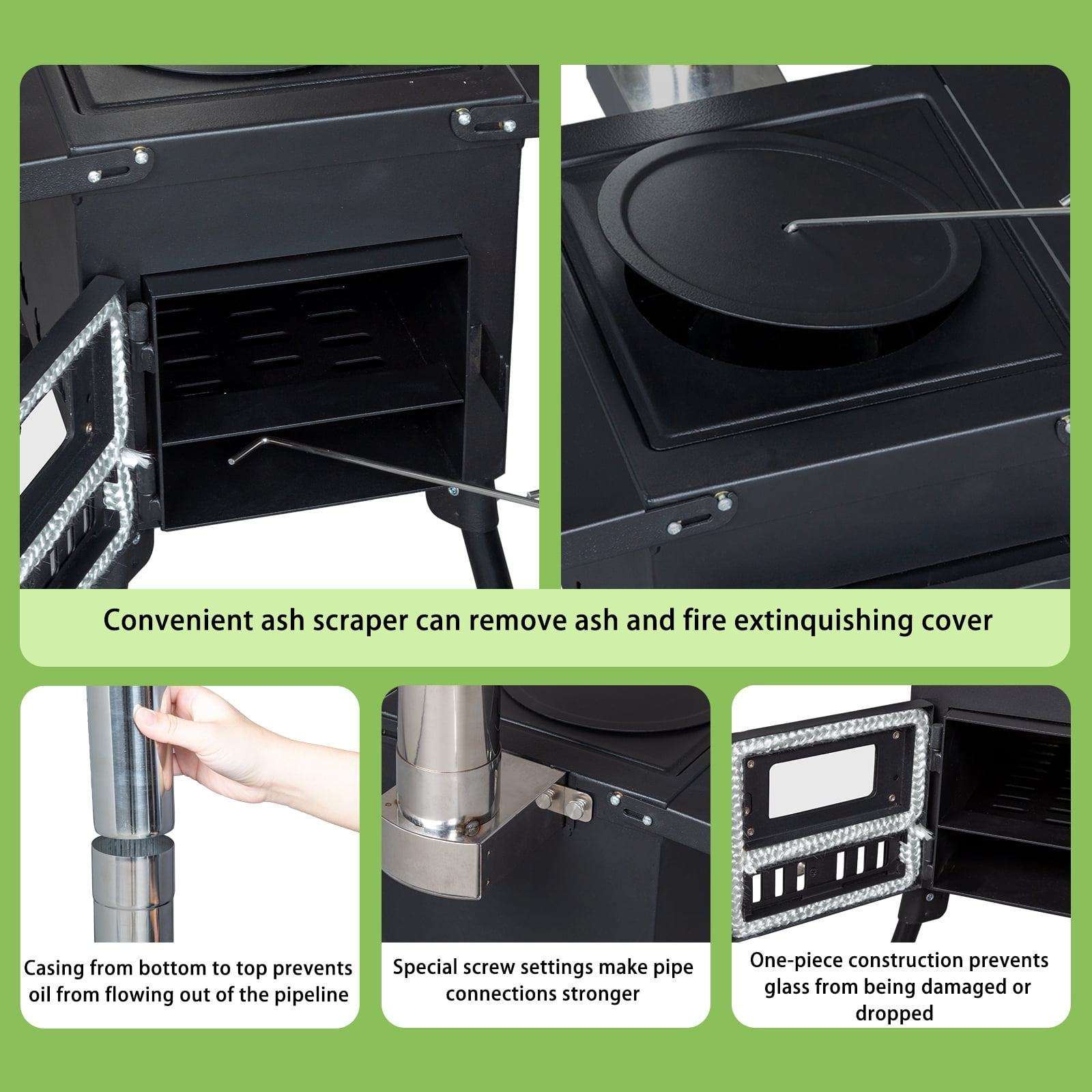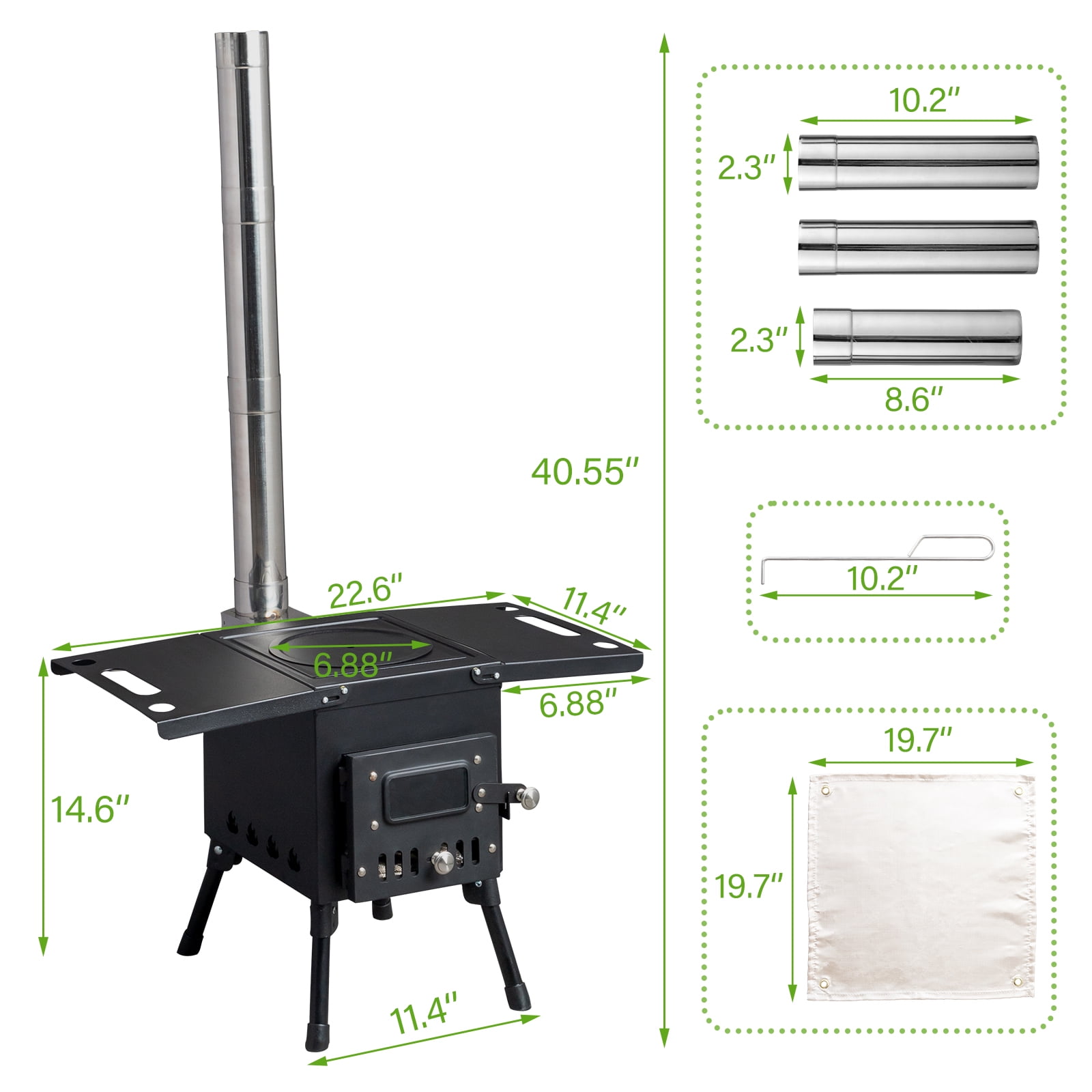 Features: Complete Accessories, No Need to Buy Other–The Camping stove is made of stainless steel, suitable for years of use. Equipped with chimney pipes, can be adjusted according to the height of your tent to ensure correct ventilation; A mat was presented to prevent smoke from entering your tent; A rod for scraping ash; Combustion Supporting Iron Frame. Refer to the picture for more accessories. Easy to Carry and Clean–Tent stove made of stainless steel and metal, only 15lbs. The black high-temperature resistant coating protects the stove and eliminates the influence of the weather, The folding frames on both sides of the stove can be combined as a carrying handle and unfolded as a sundry shelf. When traveling, all chimneys and accessories can be placed on the stove for transportation. The complimentary stove hook is easy to clean the bottom ash. Flame Temperature Can be Adjusted–One of the chimneys has a rotary iron switch inside, and the fan-shaped door also has a rotary adjustment to control the entry of air, which can easily extinguish the flame or make the firewood burn faster. The round hole under the top cover can also adjust the size of the flame. The heat-resistant glass in front can let you pay attention to the internal combustion at any time, This is a portable camping stove with adjustable heat. Suitable for Different Scenarion–Whether you are in the home, courtyard, outdoor camping, or traveling, barbecue, adventure, and picnic, the wood-burning stove can provide you with full warmth in the cold winter, very convenient. Our woodstove is also an excellent choice for warm water or boiling water. Specifications: 1. Material: Stainless Steel, Alloy Steel 2. Product Dimensions:22.6″D x 11.4″W x 14.6″H 3. Color: Black 4. Item Weight: 17.6lbs / 8kg 5. Fuel Type:Wood and Charcoal 6. Assembly Required: a small part of Package Includes: 1 x Camping stove 3 x chimney pipe 1 x Chimney horizontal intubation 1x firewood hook 1 pair of gloves 1x fire blanket