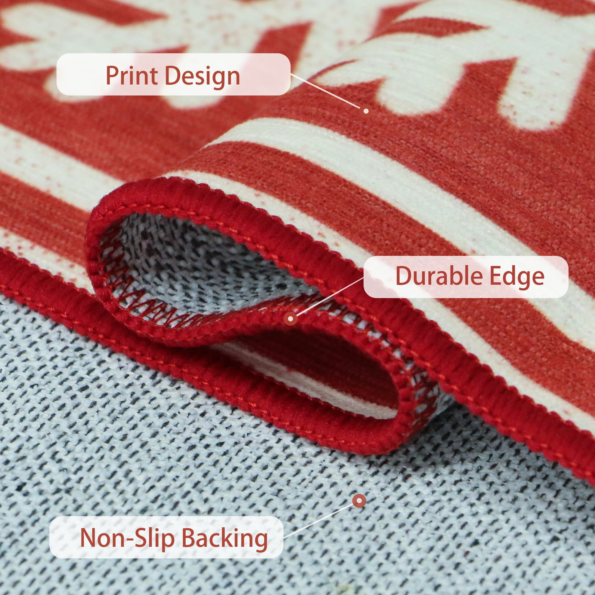 【Lightweight&Durable Rug】: Enjoy the durability of our long-lasting ultra-thin rugs, designed for high-traffic areas with dense machine weaving. Its stain-resistant surface makes cleaning easy, while sturdy edges prevent unraveling. Invest in style and longevity. 【Christmas Pattern Design】: Decorate your space with our machine-made red and white Christmas striped pattern area rugs. During this special holiday season, they not only fill your home with Christmas but also offer a unique bright-colored experience. 【Easy Care】: Benefit from low-maintenance care with our machine washable rugs, designed to withstand washing without shedding or tearing. Regular vacuuming and spot cleaning keep them fresh, while fade-resistant colors maintain vibrancy.Ultra-thin design is ideal for robotic vacuuming. 【Secure Non-Slip Backing】: Our washable rugs feature non-slip TPR latex backing, effectively securing the rug and preventing slips. No additional padding necessary, ensuring a safe environment for children, pets, and the elderly during everyday use. 【Multiple Scenes】: Explore the adaptability of our rugs, available in a variety of sizes, including compact 3×5 and 2×10 options, and larger 8×10 and 6×23 options.These rugs blend seamlessly into doorways, porches, bedrooms, dining rooms or home decor.Whether your goal is to inject cozy charm into your living room or create a cozy atmosphere in your hallway or kitchen passage, our rugs are perfect for your changing preferences.