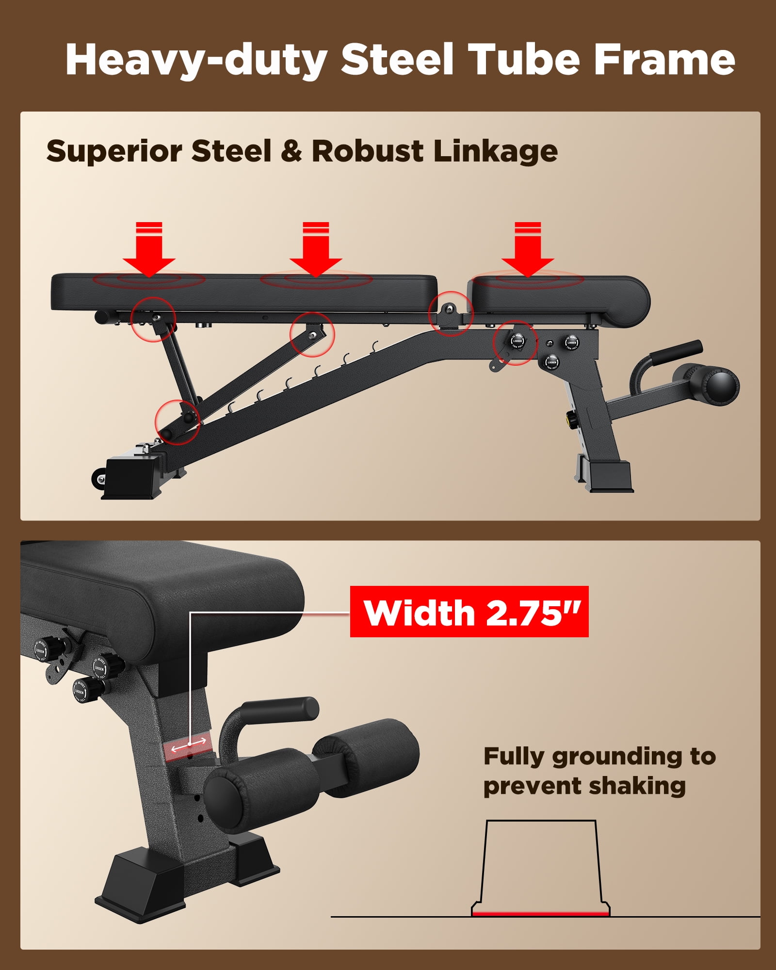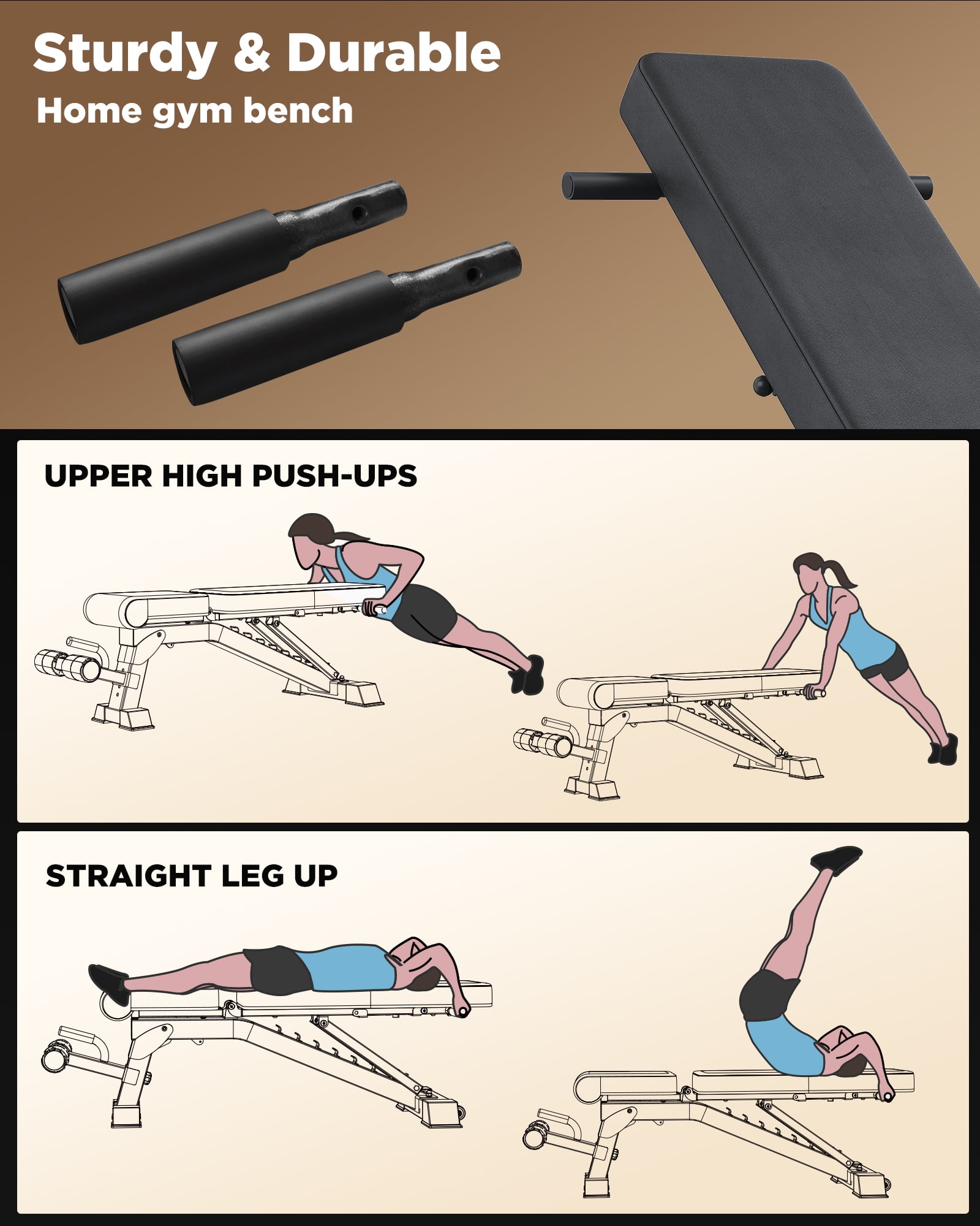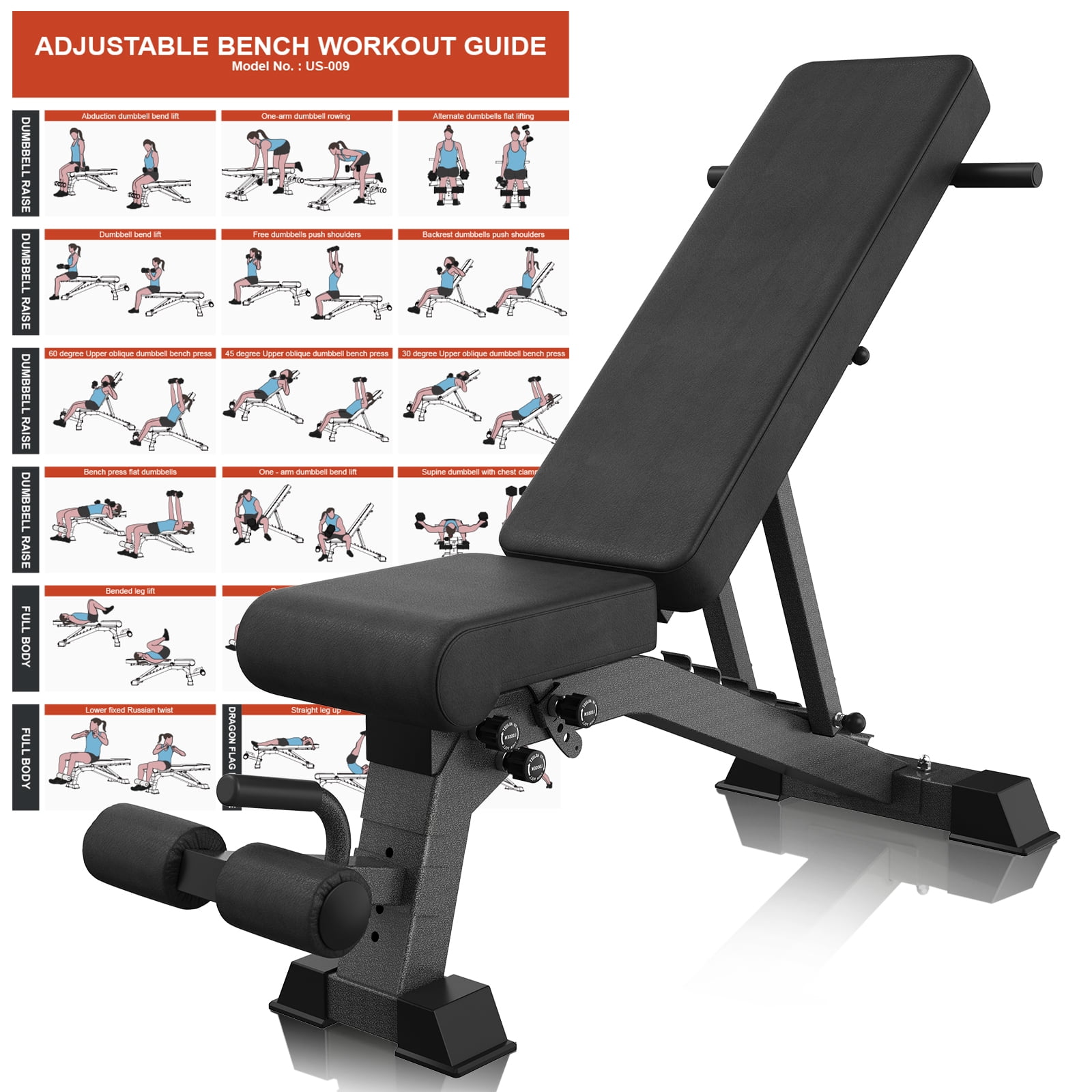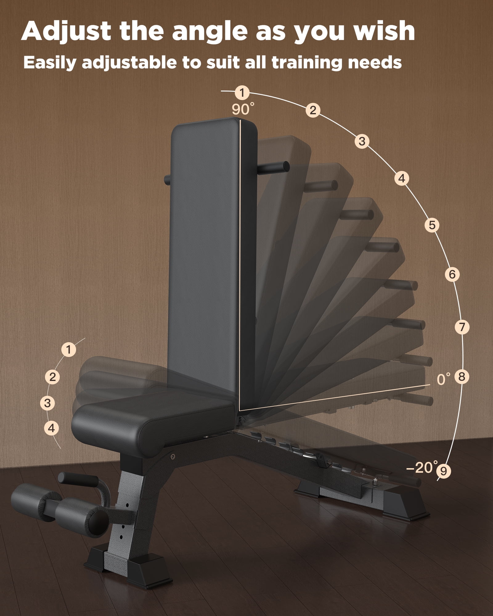 【2023 New Version Weight Bench】Designed for a combination of versatility and comfort. The adjustable angle expands up to 90 degrees, accommodating a plethora of workouts. KURONO Adjustable Weight Bench* The KURONO adjustable weight bench offers an extensive range of customization for your workout routines. It showcases 9 backrest, 4 seat, and 4 leg-hold-bar position adjustments. This variety, coupled with the included workout chart poster, lets this bench serves as a platform for a more comfortable, free-flowing workout, shaping your body, burning calories, and strengthening muscles at your pace. 1000 LB: The workout bench boasts an exceptional weight capacity of up to 1000 LB! Constructed with superior heavy-duty commercial-grade steel from our 2023 upgrade and featuring a unique triangular support structure with a widened base, this bench ensures the utmost safety of users. The build quality not only adds to its durability but also ensures impressive stability, minimizing wobbling during workouts. 1-Year Warranty: We pledge to respond to all inquiries within a 12-hour time frame. Furthermore, we confidently offer a 1-year warranty on the frame, and a 90-day warranty on the pad. Any problems during use, please contact us directly; we will continue to assist you until you are completely satisfied. 10-Minute Assembly: Experience simplicity with our 10-minute assembly! On average, our product can be fully assembled, from unpackaging to completion, in a swift 10 minutes. With minimal steps, such as opening the product and securing a few screws as per the provided instructions, it’s simplicity personified. A measure often overlooked but crucial for stability is ensuring all screws are sufficiently tightened, preventing any unnecessary shaking of the product. Stability: Don’t fret over uneven flooring! Our bench is equipped with adjustable screws on the front and rear stabilizers. Altering these can adjust the bench’s height at all four corners, ensuring its stability on any surface. Foldable Design: Experience convenience with our foldable weight bench. Its compact folding design allows for easy and space-efficient storage. Additionally, we’ve incorporated transport wheels for effortless relocation within your home gym. Dragon Flag Dandle Design: Our incline bench features an exclusive dragon flag handle design, offering a unique way to target your abdominal and arm muscles further enhancing your workout. This feature adds remarkable value to our press bench.