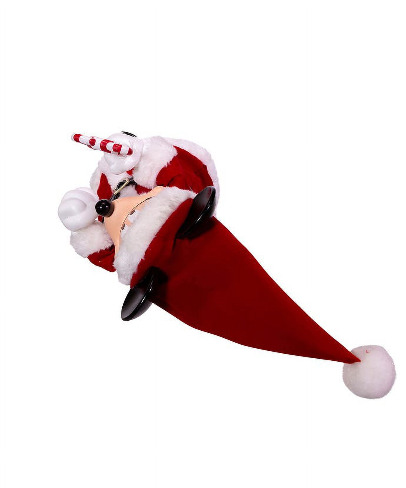 Disney’s MICKEY MOUSE Christmas Tree Topper by Kurt Adler This Mickey Mouse treetop figure from Kurt Adler is a fun and festive addition to any holiday decor! Perfect for Disney© fans of every age! This piece can be used either as a treetop or tabletop decoration. Features Mickey Mouse festively dressed as Santa Claus, holding a pair of candy canes in one hand. The arms are bendable so you can set Mickey in any merry pose you like! Made of plastic and polyester, this officially licensed Disney tree topper measures 10 inches tall.