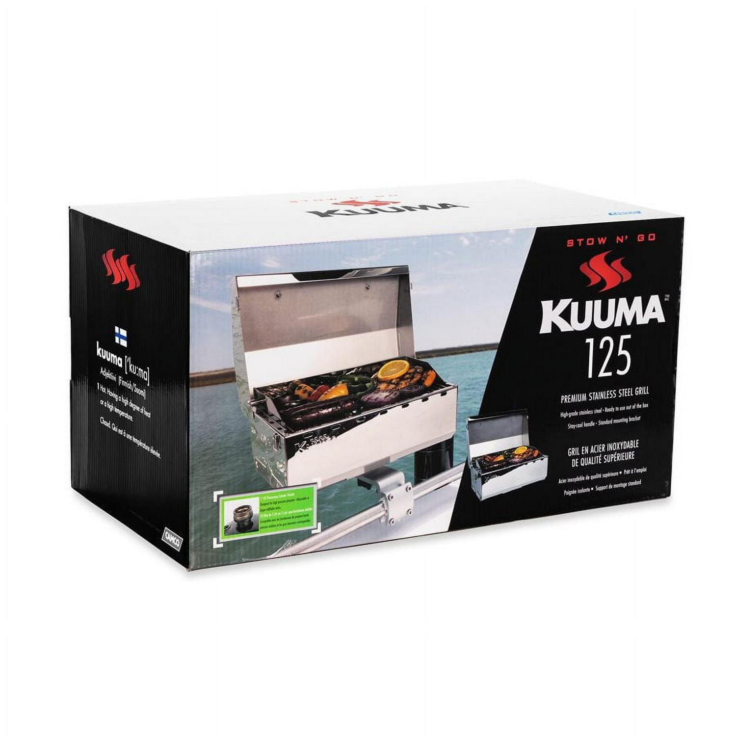 Kuuma Products Stow & Go 125All-purpose, portable bbq. Features integral folding legs, locking sides, removable grease tray for easy cleaning, & stowaway handle. Made from 100% stainless steel. Heat output of 9000 BTU. 125 square inches of cooking surface. Designed for high pressure propane. No assembly required. MFG# 58140 UPC# 014717581400