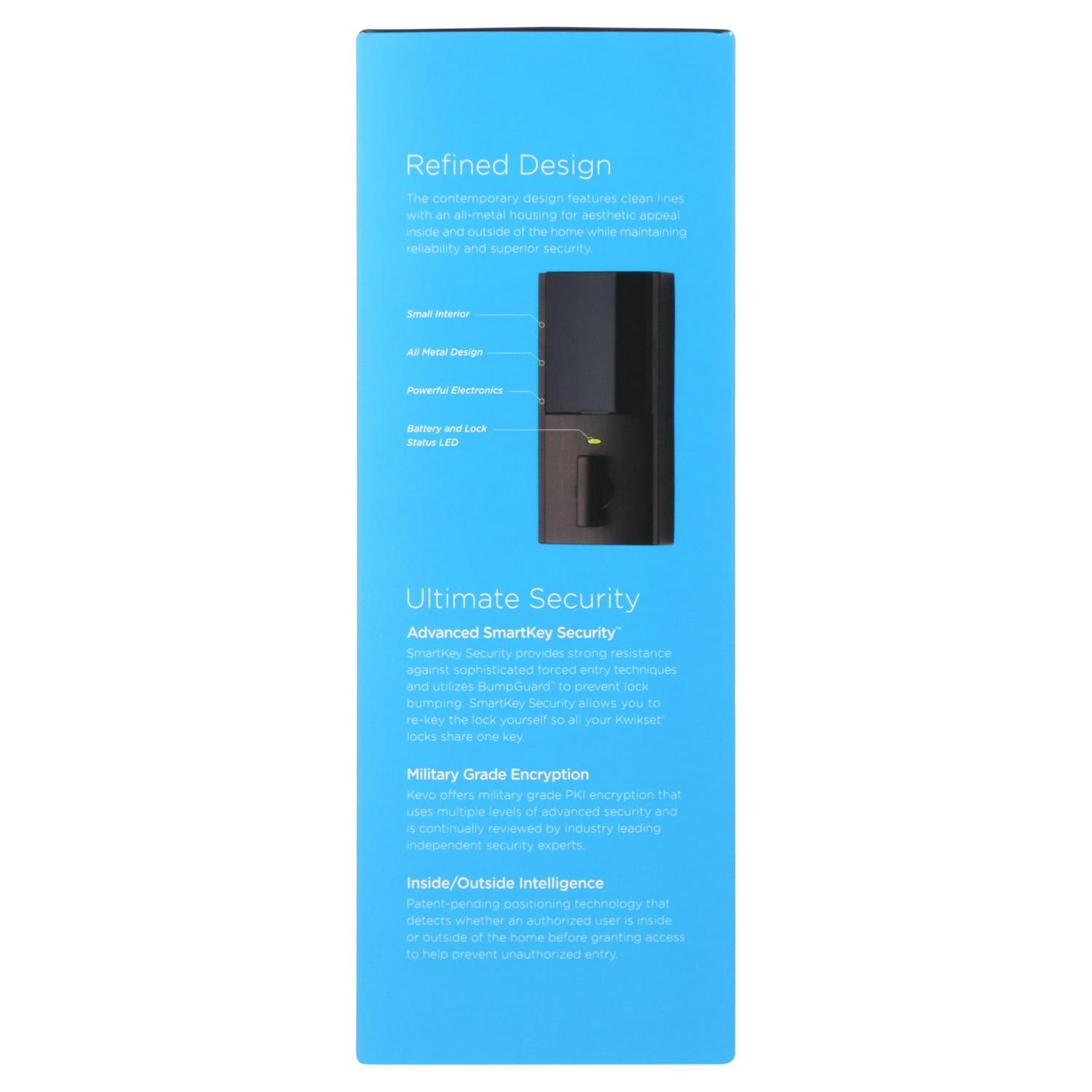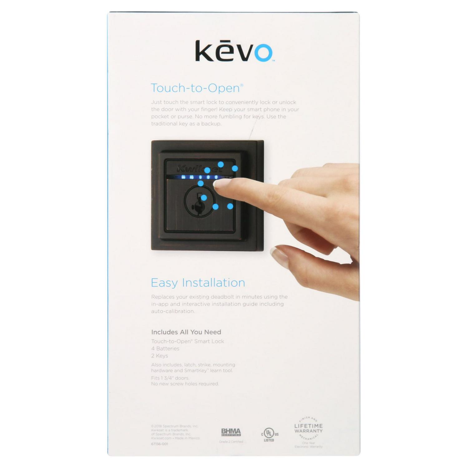 Open your world with the Kevo Touch-to-Open Smart Lock powered by your smartphone and Bluetooth. Fumbling with your keys is now a thing of the past. Kevo 2nd Gen provides the same trusted touch-to-open smart lock experience available in Kevo 1st Gen teamed with a refined user experience, sleeker design and added security features. Kevo 2nd Gen features the latest version of the Kwikset patented SmartKey security. This single cylinder Bluetooth-enabled deadbolt can be locked or unlocked by touching the exterior side of the deadbolt, or with a key from the outside, as well as the turnpiece from the inside. Kevo (2nd Gen) also comes with InHome Locking & Unlocking from your smart device within Bluetooth range of the lock. The Venetian Bronze finish is hand-rubbed to reveal unique bronze highlights and provides a rich and warm complement to the product’s style.