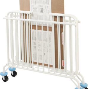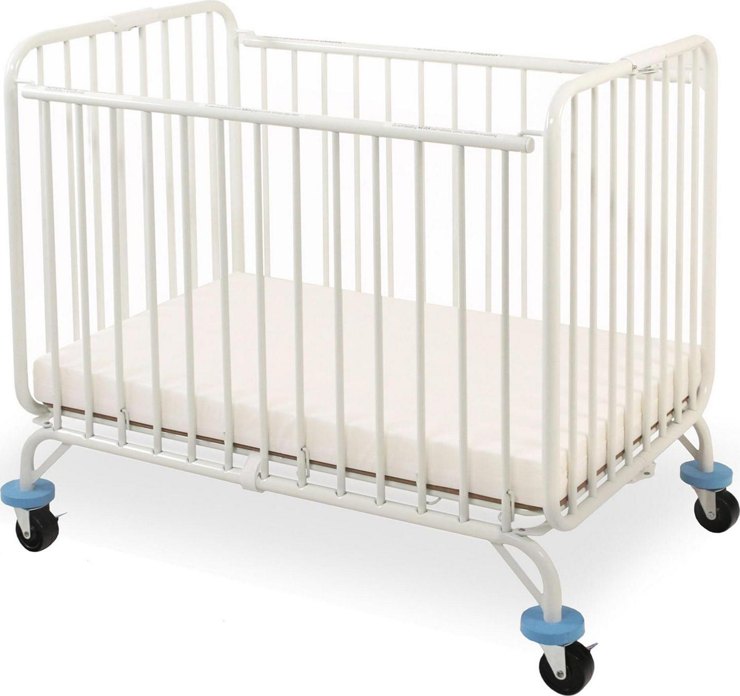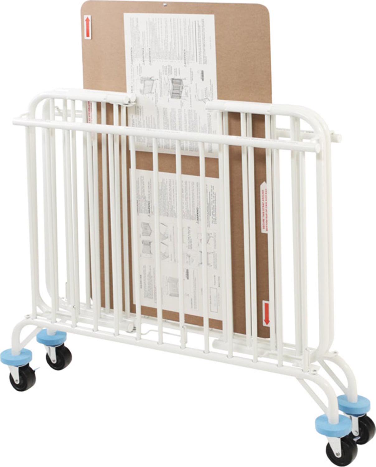 Compact Folding Metal Crib Institutional Quality folding (24″ x 38) metal crib. Comes fully assembled and folds away for easy storage. Easy to clean and scratch resistant non-toxic powder coat finish in white. Includes a deluxe 24″ x 38″ x 3 thick foam mattress that is compliant with Federal Flammability standard 16 CFR 1633. Braced leg construction assures lateral rigidity in transport. Features exclusive, “Lock-down,” safety floor system. Stationery side rails and one position mattress support. Easy to move from room-to-room, folded or open, on heavy duty casters. Foam bumpers are included to protect doorways and other furniture. Meets the Mandatory CPSC 16 CFR 1220 regulations for non-full size cribs. JPMA Certified and meets ASTM 2710 commercial crib regulations to withstand the rigors of a day care or other commercial environment. Bilingual instructions in English and Spanish. Optional nylon storage cover is available.