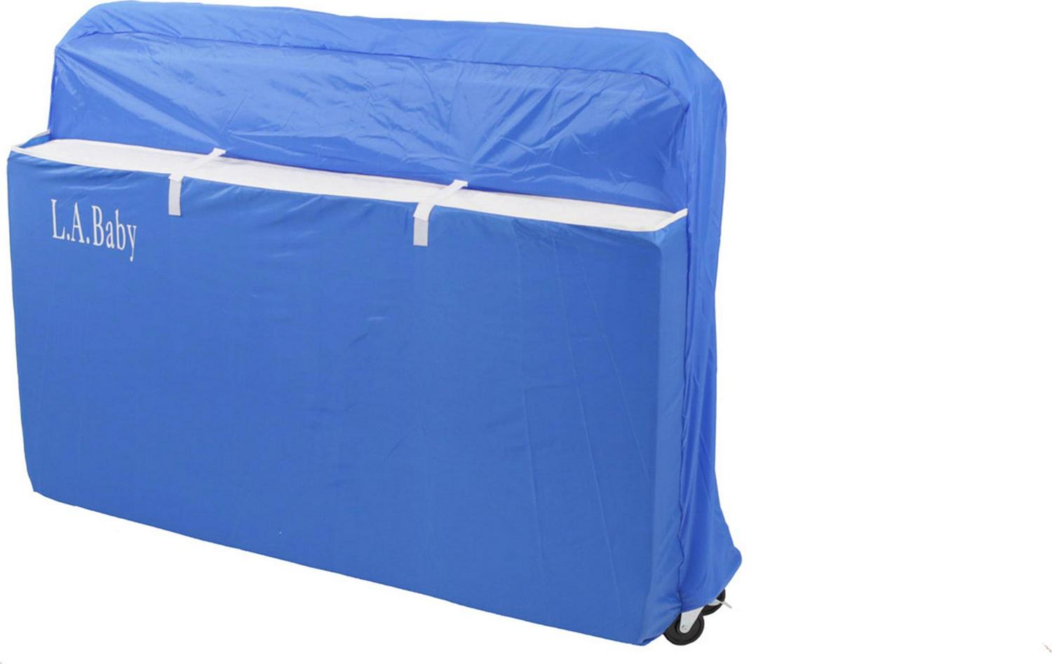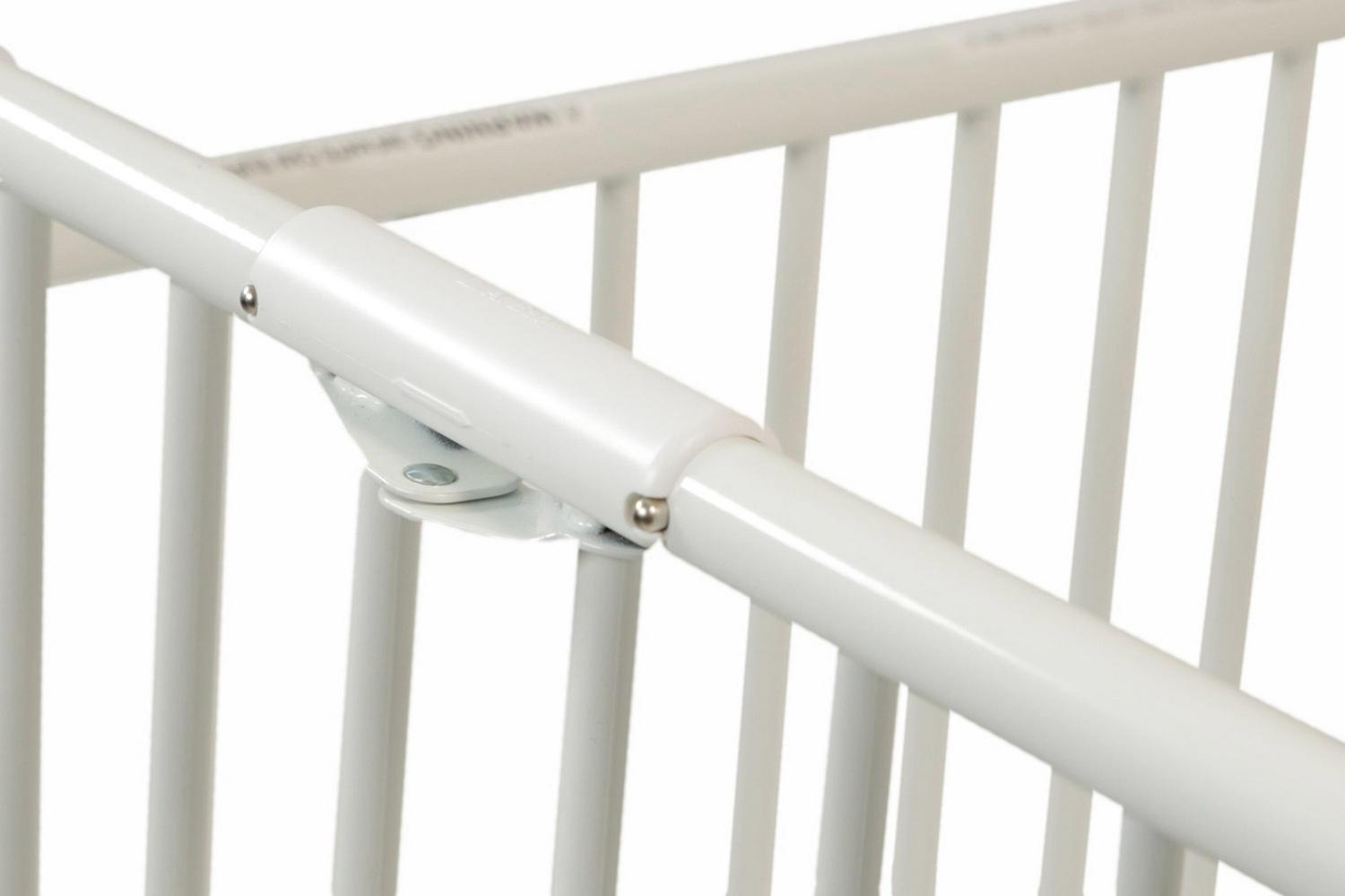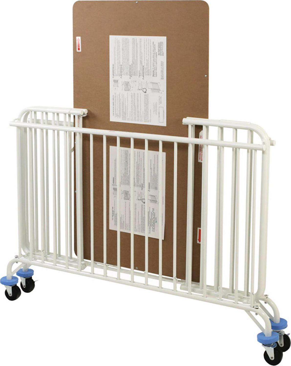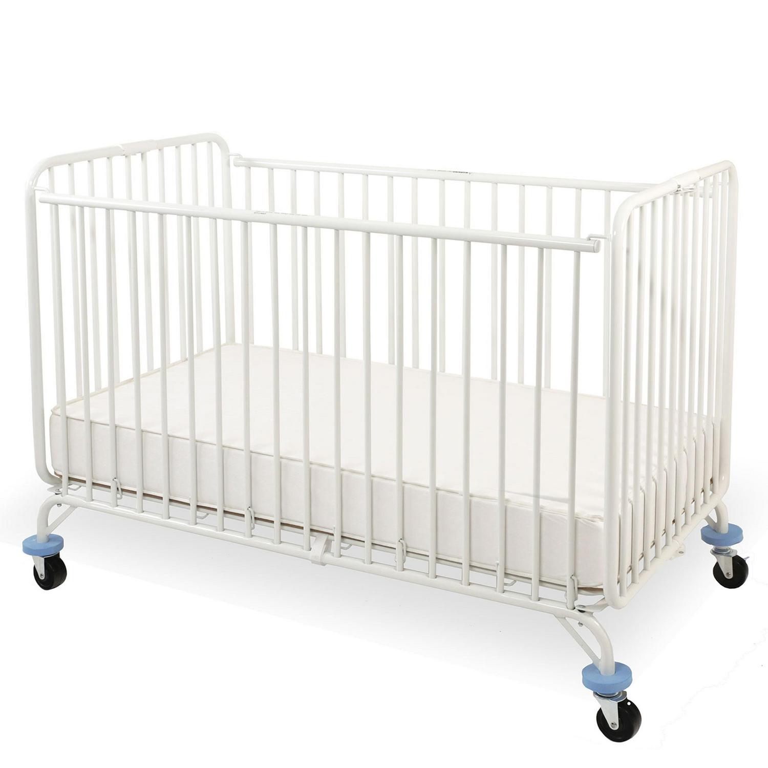Full Size Metal Holiday Folding Crib. Institutional quality folding (28 x52 ) full size metal folding crib that comes fully assembled and folds away for easy storage. Easy to clean and scratch resistant non-toxic powder coat finish in white. Accepts a 28 x 52 standard crib mattress which is sold separately and available from LA Baby. Braced leg construction assures lateral rigidity in transport. Features exclusive, “Lock-down,” safety floor system. Stationery side rails and one position mattress support for a safe environment for baby, Easy to roll room-to-room, when folded, on heavy duty casters. Foam bumpers are included to protect doorways and other furniture. Meets the Mandatory CPSC 16 CFR 1219 regulations for full size cribs and also meets ASTM 2710 commercial crib regulations to withstand the rigors of a day care or other commercial environment. Instructions in English and Spanish included. Optional nylon storage cover is available.