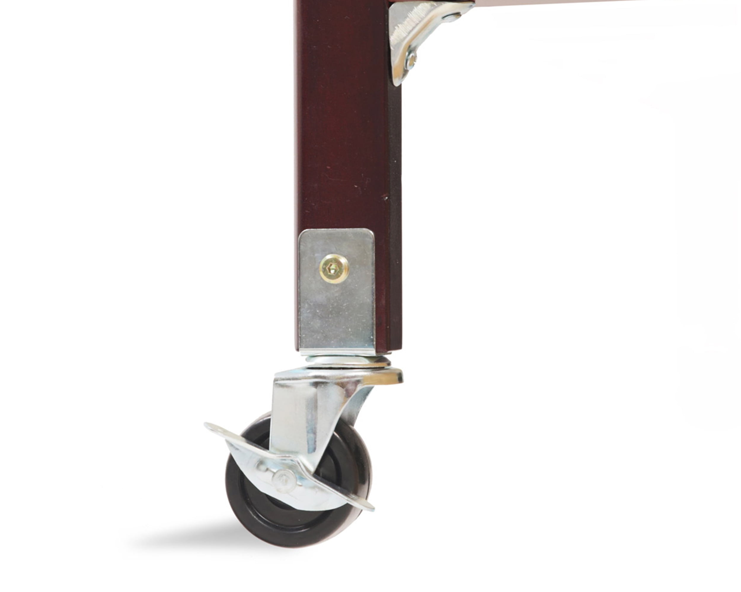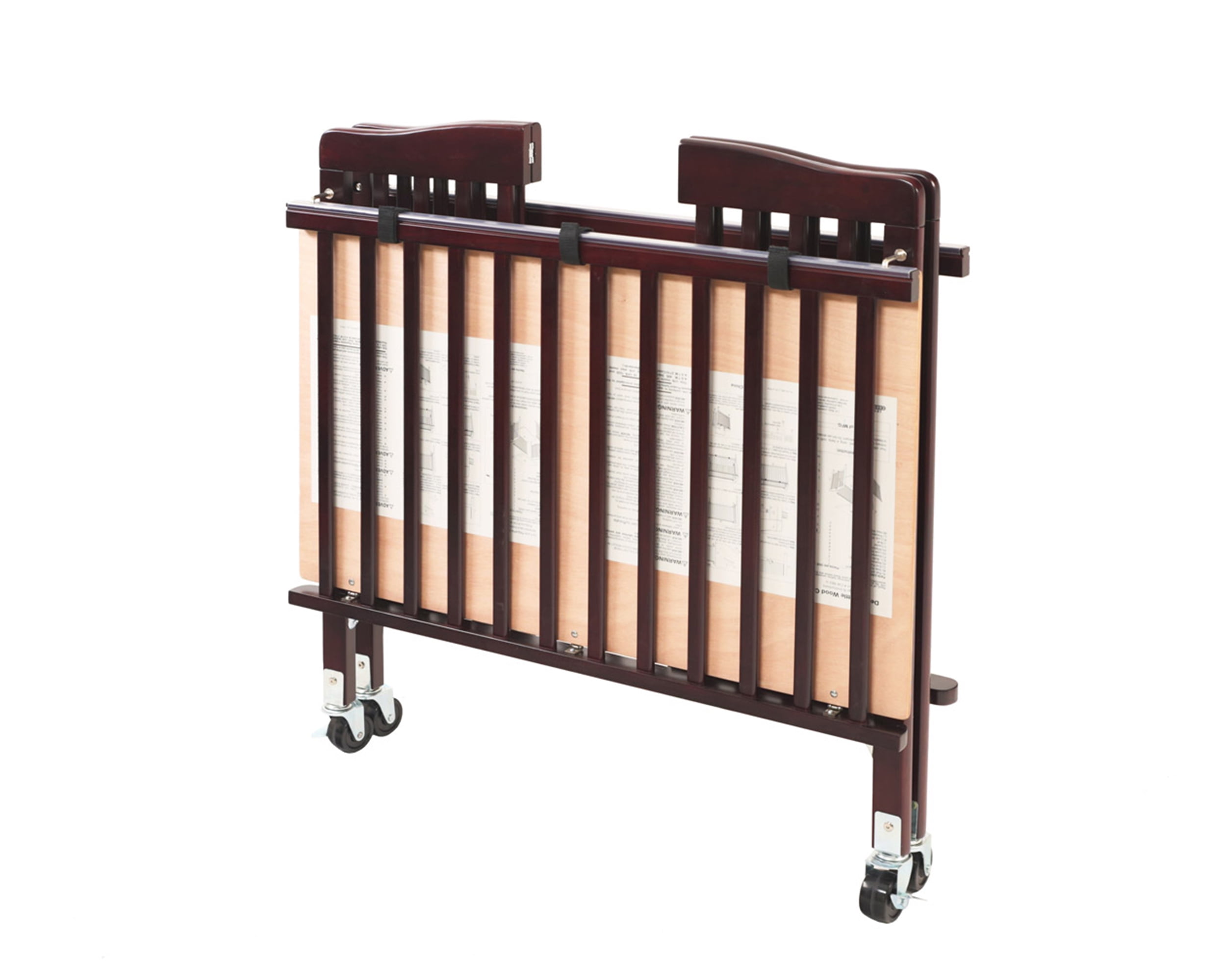 The Little Wood Crib-Mini/Portable Folding Wood Crib-Cherry. Compact folding wood crib that uses brass butterfly hinges and requires only a one time assembly with included tool. Stationery side rails, a one position mattress support, solid hardwood construction and in a beautiful cherry finish, can handle whatever abuse can be dished out to it. Arched end panels add elegance to your day care, hotel room or home and when nap time is over the crib is easily folded for storage. The heavy duty casters make it easy to move from room to room or to get it to its storage space. Designed and built with the rigors of commercial use in mind, but also perfect for use where space is at a premium. Meets the Mandatory CPSC 16 CFR 1220 regulations for non-full size cribs . Plastic teething rails installed on both fixed side rails. Includes a deluxe 24″ x 38″ x 3” thick foam mattress that is compliant with Federal Flammability standard 16 CFR 1633. Heavy duty ball bearing casters, two of which lock, are attached to the legs by a Chicago bolt system through the leg post instead of the leg bottom. This is not only a stronger system but also eliminates the danger of exposed bolt threads. Optional nylon storage cover is available. Bilingual instructions in English and Spanish.