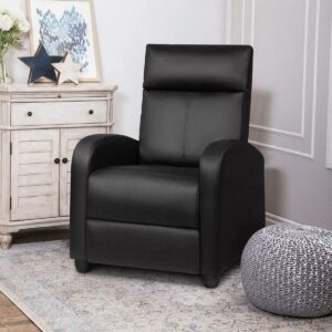 Lacoo Single Recliner Thick Padded Push Back Recliner chair with Faux Leather, Black If you are looking for an attractive single sofa to go into your living room, bedroom, or even your recreational area, the Lacoo Recliner is the perfect and classic one for you, which nicely combines both elegance and durability. With a contemporary look, it is fully upholstered with high-quality PU leather and constructed by durable steel frame for a long-lasting use. Padded backrest, large-size seat cushion and curve-shaped armrests, are all designed to offer optimal comfort on the sensory of feeling. Featuring with a push-back mechanism, this sofa can be easily adjust into several positions, customized to meet your different needs. With a variety of color and material options, this Lacoo Recliner is the perfect piece of furniture to complete your living room decor.