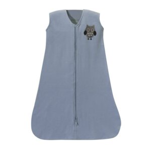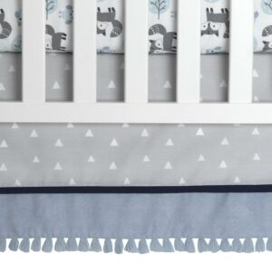 Fill your little ones sleep space with an adorable furry elephant, fox, and owl. This four piece bedding set includes one quilt, one fitted crib sheet, one dust ruffle and one cozy sleep sack. The quilt is expertly stitched on a patchwork of tactile fabrications and embroideries along with arrows, dotted chevrons, stripes, and triangles. The 100% cotton fitted crib sheet has an array of gray foxes, owls, and trees. It fits a 28″ x 52″ crib mattress and is fully elasticized for a secure fit. Gray with white triangles decorates the top portion of the dust ruffle and slate blue is at the bottom with coordinating tassel trim. Recommended for safe sleep is the Snuggle Sleeper in slate blue with an owl embroidery. Imported.