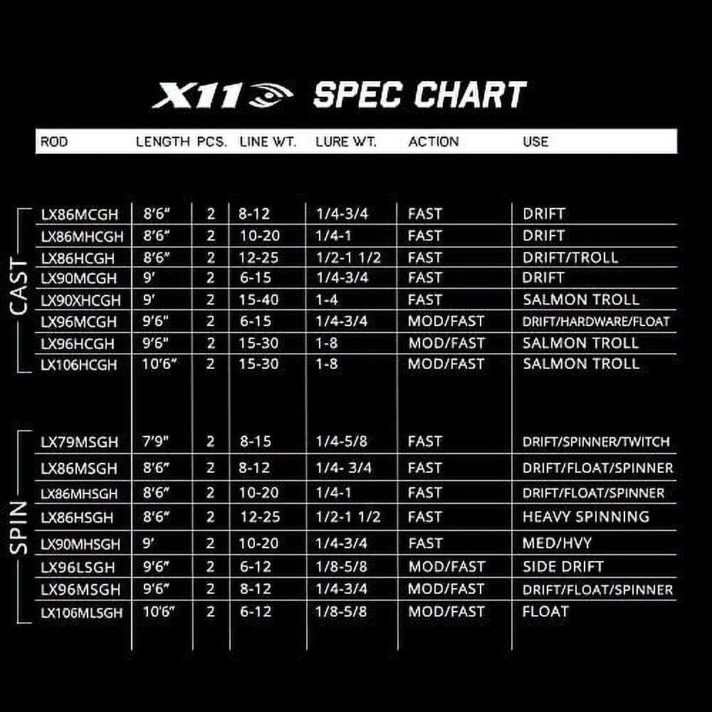 Lamiglas X-11 Salmon/Steelhead: Ideal action for trout, kokanee, and panfish Two-piece IM graphite blank Traditional cork grip Graphite reel seat Deep pressed guides with zirconia inserts One Year Limited Manufacturer Warranty