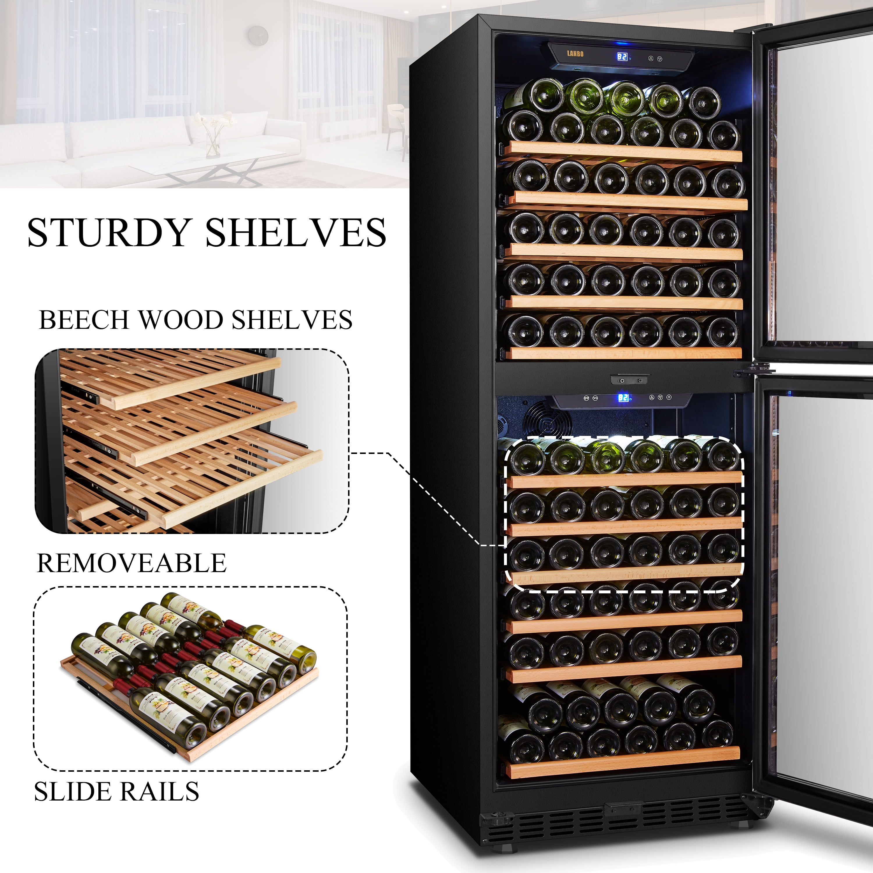 LW133DD with 11 beech wood shelves, Lanbo dual zone wine cooler has a stylish and modern dual door design is perfect compressor wine refrigerator to add in any place like restaurant, bar, business place or family room. Dual Temperature Zone: This Lanbo wine fridge controlled temperature with a range of 41 to 64°F in the both upper and lower zone which is ideal for red, white wine and sparklings. DIGITAL CONTROL: Each zone in this Lanbo compressor wine cooler is equipped with smart temperature controls for easy and intuitive temperature management, with a readout that can be displayed in Celsius or Fahrenheit. Dual Doors: Two tempered glass doors separate the units into two independent zones. When you open one door to select wines, it will not disturb temperature of another zone. Powerful Compressor: Built with a compressor cooling system that is vibration-free and nearly silent, you can rely on this wine cooler fridge to protect the flavor and quality of your favorite vintages Versatile Installation: With a large front vent, this Lanbo dual zone wine cellar fridge can be installed as freestanding or built-in. Installation is easy and convenient, which only need to connect to power and place anywhere you like, no matter in kitchens, offices or other places. Safety Lock: Every separate zone equips a safety lock and a double-layer glass door that could keep different wines at proper temperature precisely and better. Elegant Design: All black compact case, silver stainless steel frame and brown outside glass all make it be a good-looking wine refrigerator, which could decorate your home or kitchen elegantly. Slide-out Shelve: Wooden shelves in wine compartment securely glide all the way out for easier loading and unloading. Gently Illumination: Behind the dual-pane glass door, white LED light gently illuminates bottles in an ultra-modern glow. Attractive Design: With its attractive style and user-friendly design, the compressor wine cooler refrigerator offers a great way to finish your kitchen or home bar. Finish Interior: The interior of this unit is a sophisticated black with pull-out wooden shelves on a roller assembly and a built-in fan with a charcoal filter. Please note that wants to load large bottles like Champagne or Pinot, 1 or 2 shelves should be removed. Unit Dimension and Weight: 23.4 in, 28.4 in, 64 in, 200.6 Lbs