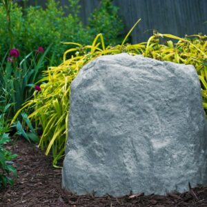 Enhance your yard s appeal with an EMSCO landscape rock! With its natural color, this artificial rock has a natural appearance that blends well with gardens, lawns, and landscapes. It s natural-looking exterior also has a realistic texture that will add a feel of authenticity to your lawn. With dimensions of 15.5″x 22″x 16″ (height x length x width), this plastic rock is easy to install and lightweight. Each rock has two stakes included to anchor the product securely to the ground. It is also lightweight, so you can pick it up and place it anywhere in your landscape. Each artificial rock is durable and resilient, as it is able to withstand extreme weather conditions. It has a high-density resin construction that displays a very sturdy and realistic-looking structure. Polymer-made, these rocks have two stakes included so that they are anchored to the ground and remain upright even against extreme thunderstorms and intense gushes of wind. This natural-looking rock can also be placed over wells, pipes, pump, sprinkler valves, and other fixtures to block them from sight, thus enhancing the aesthetic of the terrain. It can be used to cover up utilities in lawns, yards, or landscapes. It also accentuates the greens of lawns with its neutral surface shade. EMSCO has a complete line of boulders and stones available in their catalog. They offer rocks of various sizes, along with an assortment of detailed textured rocks. The list showcases a variety of colors, shapes, and sizes, so you can choose your preferred style to match your lawn and landscape needs. Decorate your landscape with only the best by using EMSCO Landscape Rocks!