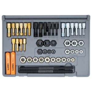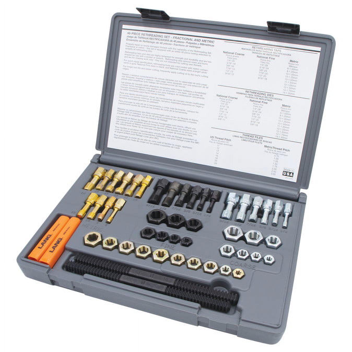 Contains: 7 SAE Coarse Dies, sizes: 1/4″-20, 5/16″-18, 3/8″-16, 7/16″-14, 1/2″-13, 9/16″-12, 5/8″-11 7 SAE Fine Dies, sizes: 1/4″-28, 5/16″-24, 3/8″-24, 7/16″-20, 1/2″-20, 9/16″-18, 5/8″-18 10 Metric Dies, sizes: M6-1.00, M8-1.25, M10-1.00, M10-1.25, M10-1.50, M11-1.50, M12-1.25, M12-1.50, M12-1.75, M14-1.50 6 SAE Coarse Taps, sizes: 1/4″-20, 5/16″-18, 3/8″-16, 7/16″-14, 1/2″-13, 9/16″-12 6 SAE Fine Taps, sizes: 1/4″-28, 5/16″-24, 3/8″-24, 7/16″-20, 1/2″-20, 9/16″-18 10 Metric Taps, sizes: M6-1.00, M8-1.25, M10-1.00, M10-1.25, M10-1.50, M11-1.50, M12-1.25, M12-1.50, M12-1.75, M14-1.50 One (1) SAE Rethread File, 8 sizes (threads per inch):11, 12, 13, 14, 16, 18, 20, 24 One (1) Metric Rethread File, 8 sizes (millimeters per thread): 0.75mm, 1.00mm, 1.25mm, 1.50mm, 1.75mm, 2.00mm, 2.50mm, 3.00mm Packaged in a plastic blow molded case for protection and easy use.