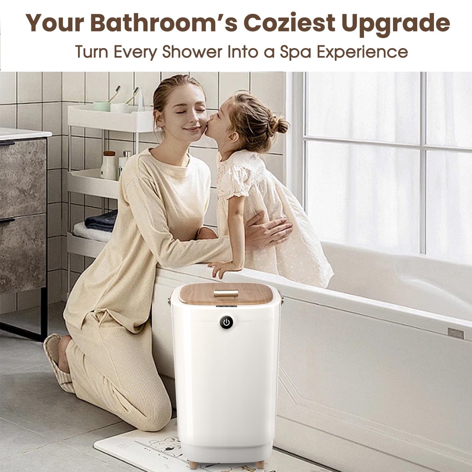 【WiFi App Control】This towel warmer can be controlled via WiFi, allowing you to set the startup time in advance. You can remotely control the towel warmer to ensure your towel stays warm when you need it. The preset time activation feature lets you enjoy a warm and comfortable towel in the morning or after a shower. 【Experience Super Fast Heating Up!】Featuring three heating modes (20 min, 40 min, 60 min), our towel warmer starts to warm up in just one minute and reaches 150 degrees Fahrenheit in ten minutes! Instantly enjoy rapid and comfortable warmth, adding more convenience and comfort to your life. 【Large Capacity】The generous 20L capacity easily holds two large 60″x80″ towels, pajamas, or bathrobes. No need to squeeze; the towels can stretch freely, allowing warmth and comfort to envelop you every moment. 【Easy to Move & Clean】The uniquely designed handle makes it easy to move the towel warmer, allowing for quick relocation wherever you need it. Additionally, the barrel lid can be easily removed for easy cleaning. Enjoy the warmth to the fullest and place the towel heater in the ideal position as you please! 【Versatile Use】Suitable for swimming pools, bathrooms, salons, hotels, spa centers, massage parlors, and perfect for babies, elderly, and pets. Our WiFi towel warmer creates an ideal warmth. We also provide high-quality customer service. If you encounter any issues with your product, please feel free to contact us anytime. Model: MJ02 Product Dimension:13.1 x 13.1 x 20.4 inches Item Weight:10.48 pounds Voltage: 110 V Power: 450W Mounting Type: standing Cable Length: 40inch