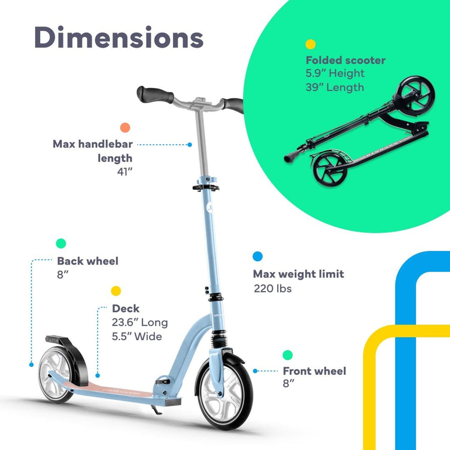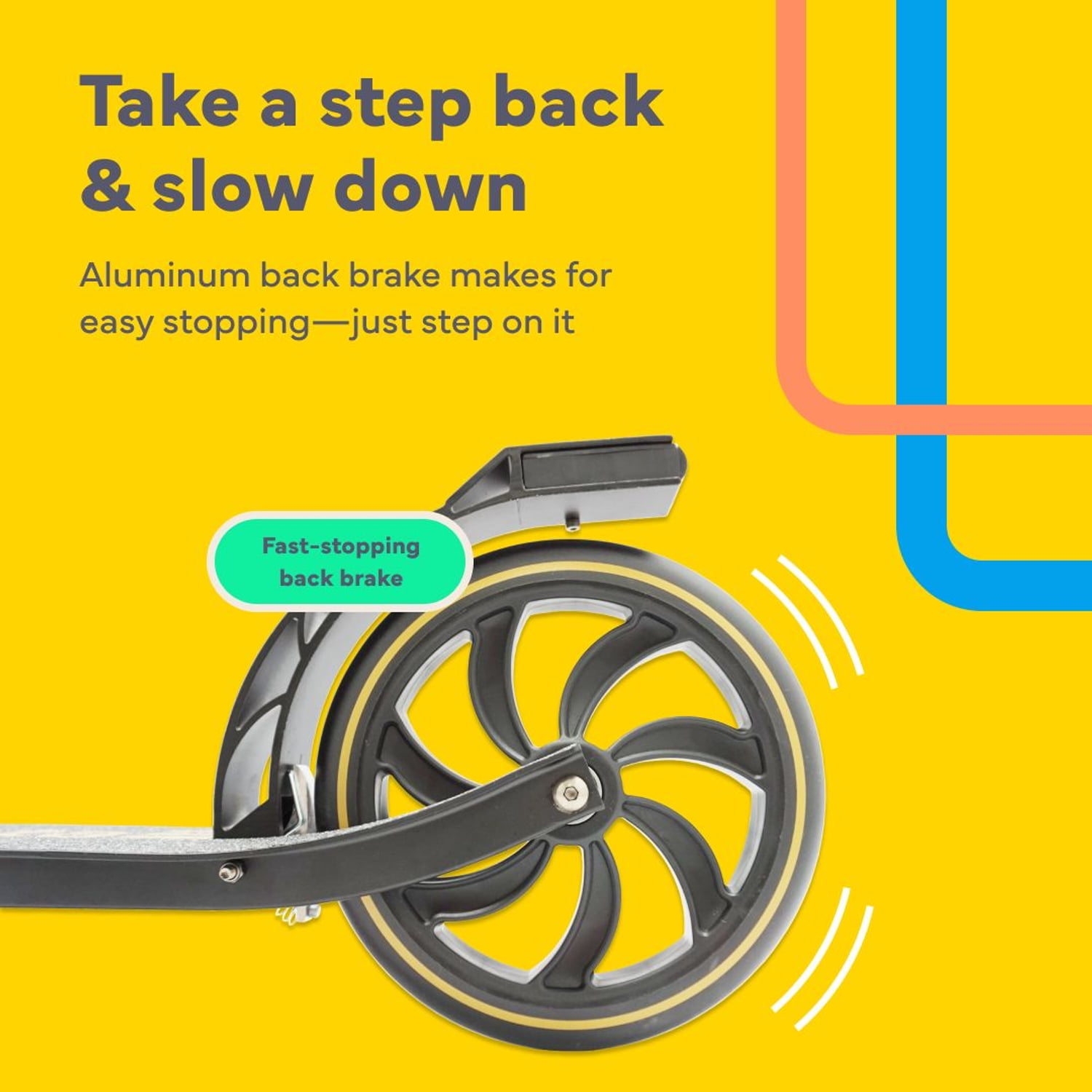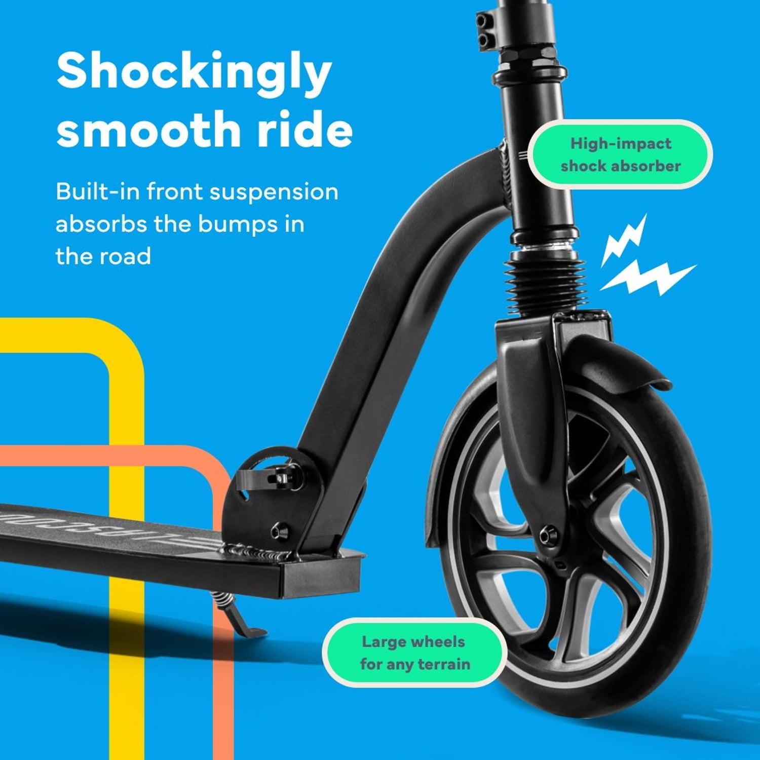 Item Description Skip walking, biking, or driving and provide yourself or your teen a more fun and enjoyable morning commute with the Lascoota Premium Teen Kick Scooter. Before you get scooting, choose your preferred height from the 3 handlebar adjustments for maximum comfort and a tailored fit. On the teenage kick scooter, you’ll stay safe and well. The heat-treated brake will ensure you come to a speedy, secure stop when you need it. The premium kick scooter’s hi-rebound wheels are tear-resistant. Don’t worry about ruining a tire on your joyride. As you journey over rugged surfaces, the front suspension absorbs shock to provide a smooth, refreshing ride. With an easy-to-fold design, pick up and carry the premium, portable scooter when you get to where you’re going. Fold up by pressing the folding button and swiftly sling the lightweight kick scooter over your shoulder with the convenient carry strap. Your teen will love gathering up friends and strolling to a nearby playground after school. Give your teenager the ability to easily hang out, kick back, and relax with the Lascoota Premium Teen Kick Scooter.