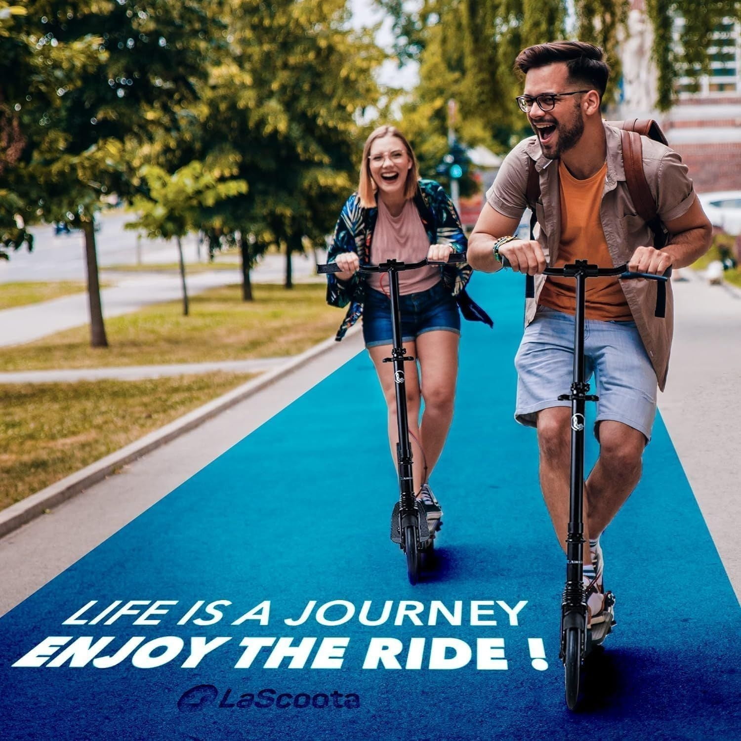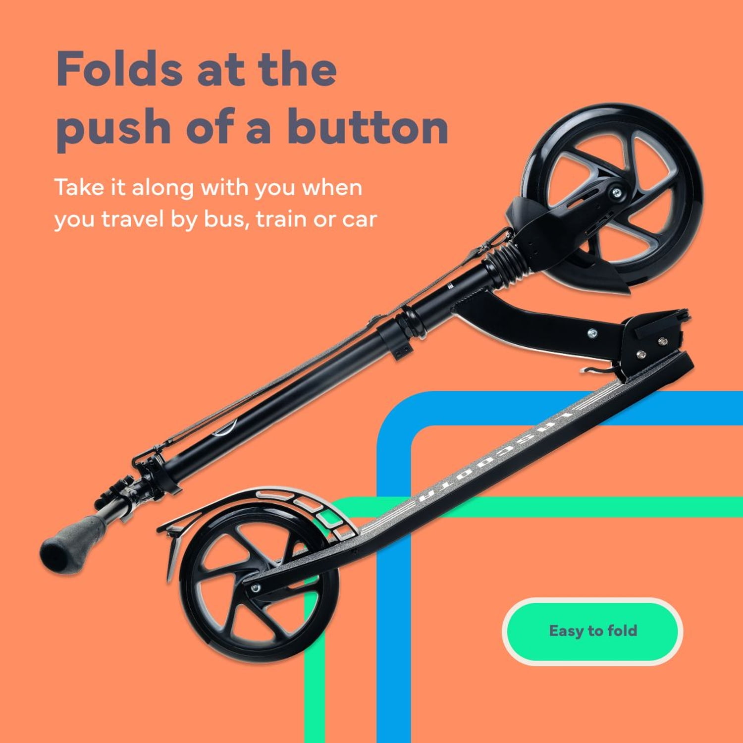 This adult kick scooter is suitable for those looking for a fun, convenient ride. You can use it to commute to work or cruise the streets with your kids, since it fits both business and pleasure activities. Featuring LATTA suspension technology, this scooter for big boys offers a smooth ride. Low vibration and high-impact shock absorption combine with wear-resistant wheels to minimize bumps. Extra-wide, non-slip deck provides great stability for riders while the heat-treated brakes yield optimized and long-lasting braking power for an optimal driving experience This big wheel scooters for adults includes a patented push button folding mechanism and a carrying strap. Portable and easy to store, the LaScoota’s adult scooter is suitable for people on the go. Designed to accommodate most heights, the handlebar is adjustable to 3 height options (35”, 37” and 39”). This ensures you can ride with comfort and ease.