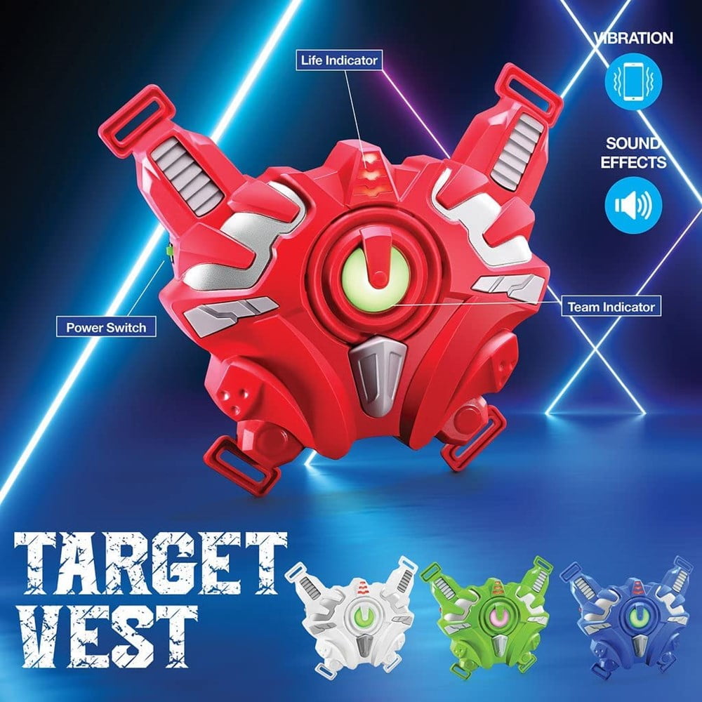 Laser Gun Toy Has Tons Of Useful Features and Great Sound and 4 Color of Lights Blue, Red, Green, White, Which It Can Be Played 4 Teams together Laser Tag Set With Vests Comes With 4 Gun Types: Pistol: With 12 Bullets, To Reduce 1-Point life value if it hits – Shotgun: with 6 bullets, to reduce 2-point life-value if it hits – Machine gun; with 6 bullets, to reduce 2- point life-value if it hits Rocket launcher: with 1 missile, to reduce 3-point life-value if it hits Laser tag game features realistic vibrations every time you shoot or get shot – strikes distance of approximately 130 Feet Laser Tag Guns For Kids Safe By All USA Regulations – Requires 28 AA batteries (Not included) – You can add multiple players by purchasing another sets – Great Gift for Birthday and Holidays for Boys & Girls.
