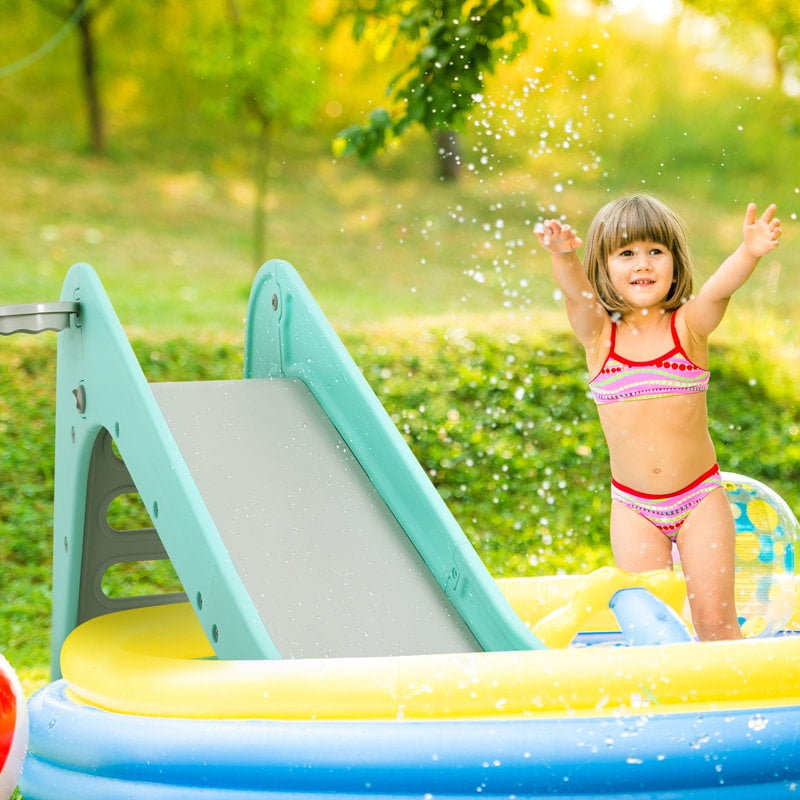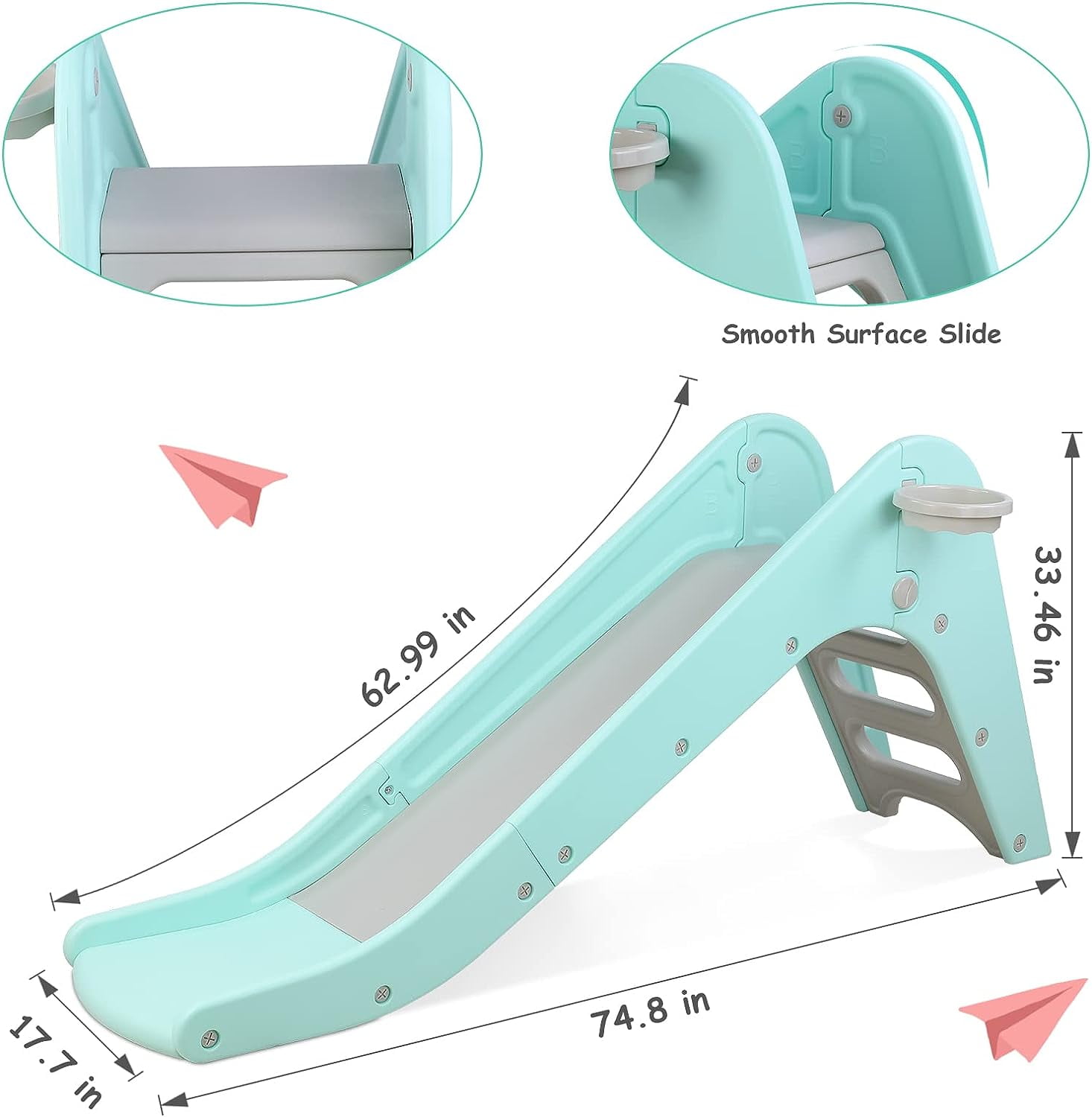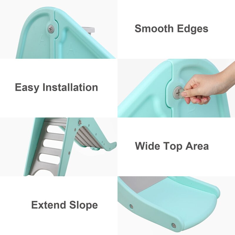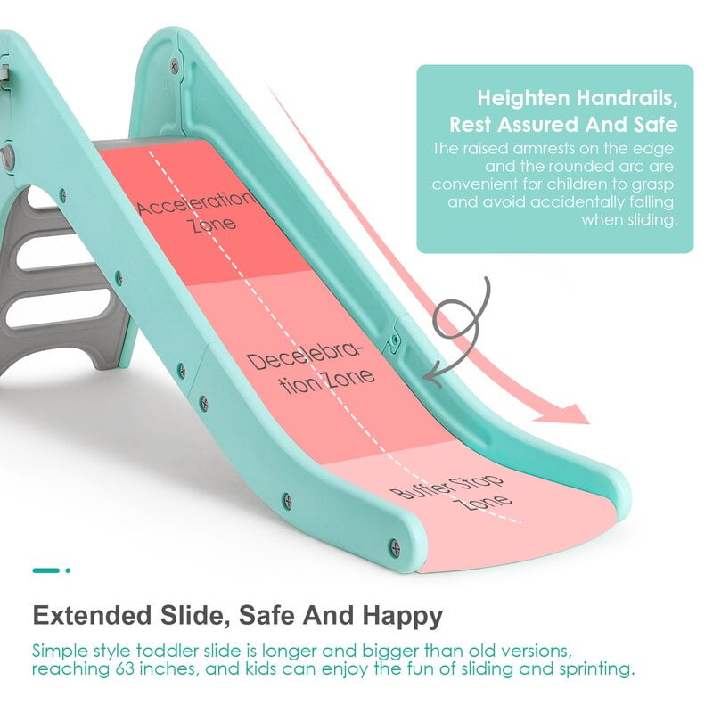 LAZY BUDDY toddler slide is made of quality HDPE materials, smooth, safe and durable, letting your children spend happy years with LAZY BUDDY slide. LAZY BUDDY plastic children’s slide has wider and longer slides that provide more comfortable playing space and the buffer zones for children to slide down safely. The baby slide adopts triangular structure to ensure the stability of the slide. LAZY BUDDY slide with a basketball hoop is an excellent toy for children. Children can enjoy sliding, basketball shooting, jumping, climbing, running and other activities, strengthen their athletic ability. LAZY BUDDY kids outdoor swimming pool slide is a nice gift for boys and girls ages 2-7,