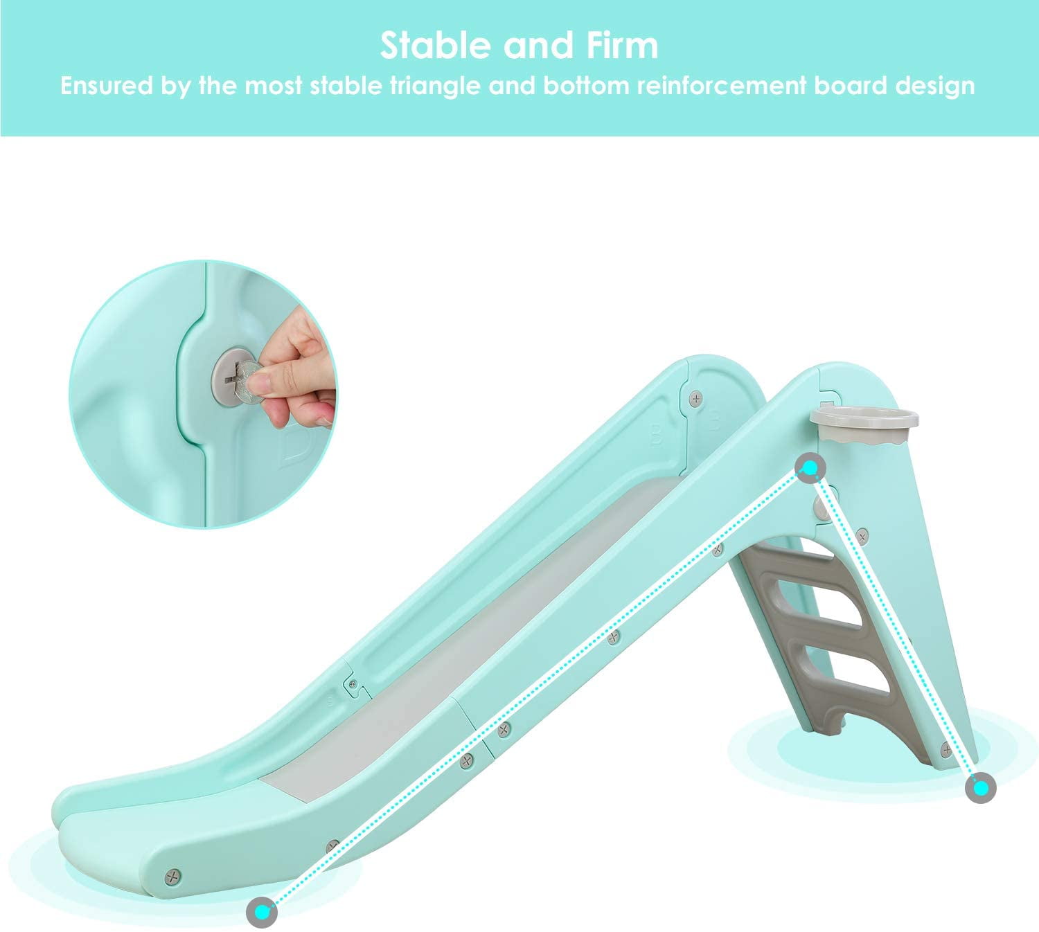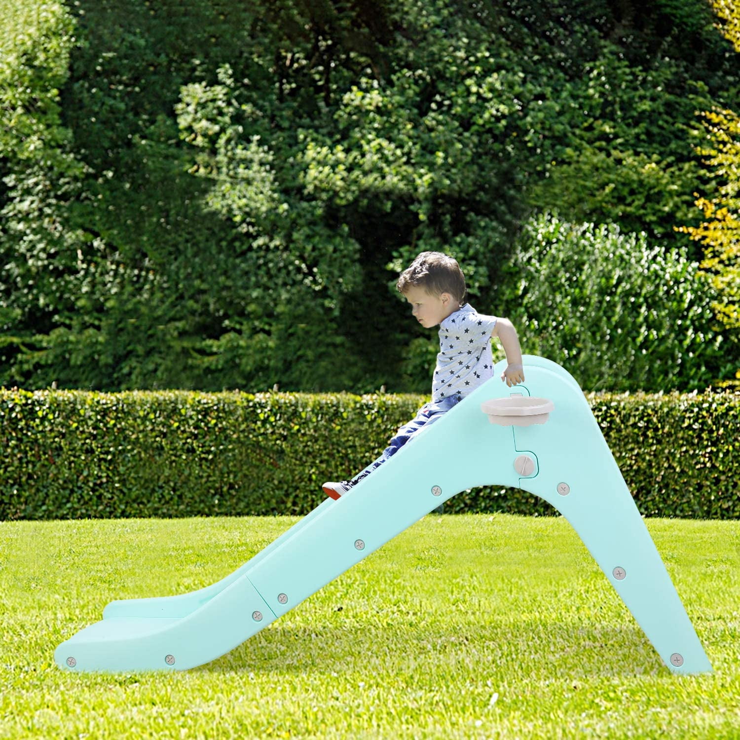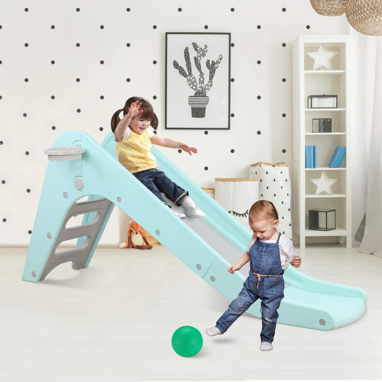 LAZY BUDDY toddler slide is made of quality HDPE materials, smooth, safe and durable, letting your children spend happy years with LAZY BUDDY slide. LAZY BUDDY plastic children’s slide has wider and longer slides that provide more comfortable playing space and the buffer zones for children to slide down safely. The baby slide adopts triangular structure to ensure the stability of the slide. LAZY BUDDY slide with a basketball hoop is an excellent toy for children. Children can enjoy sliding, basketball shooting, jumping, climbing, running and other activities, strengthen their athletic ability. LAZY BUDDY kids outdoor swimming pool slide is a nice gift for boys and girls ages 2-7,