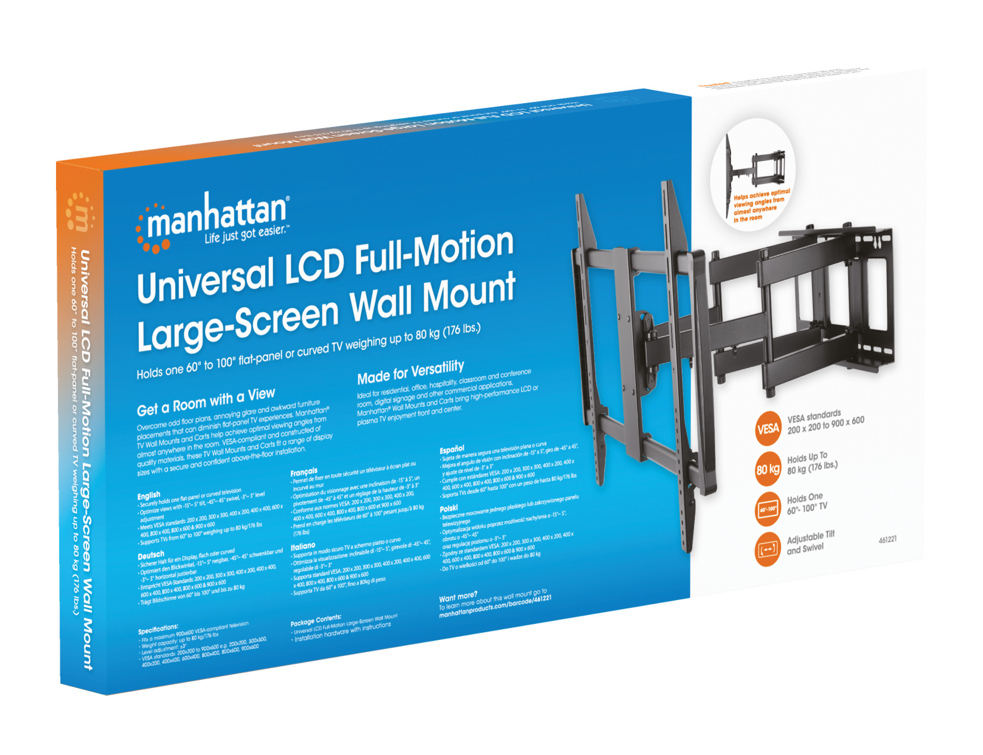 Sturdy and Secure TV Mounting: The Manhattan Universal LCD Full-Motion Large-Screen Wall Mount is crafted from heavy-duty steel, ensuring your massive 100″ TV is safely mounted. Its robust construction guarantees peace of mind, whether in your cozy living room or bustling commercial space. Optimal Viewing Experience: Achieve the perfect viewing angle from anywhere in the room with this wall mount’s versatile adjustments. Tilt your TV from -15° to 5°, swivel it ±45°, and fine-tune the level by ±3° to enjoy the best picture quality, no matter where you sit. Flexible and Extendable Design: With the ability to extend your TV up to 24.6 inches from the wall, this mount provides exceptional flexibility. Whether you’re watching a movie in the living room or presenting in a conference room, your TV will always be positioned just right. Effortless Installation and Versatility: Designed for both home and commercial use, the Manhattan wall mount meets VESA standards from 200×200 to 900×600. It supports TVs ranging from 60″ to 100″ and weighing up to 176 lbs. Enjoy a hassle-free installation process and a lifetime warranty for ultimate satisfaction and reliability.