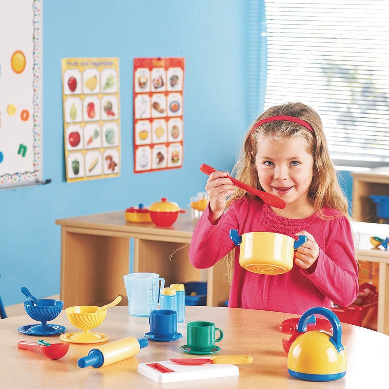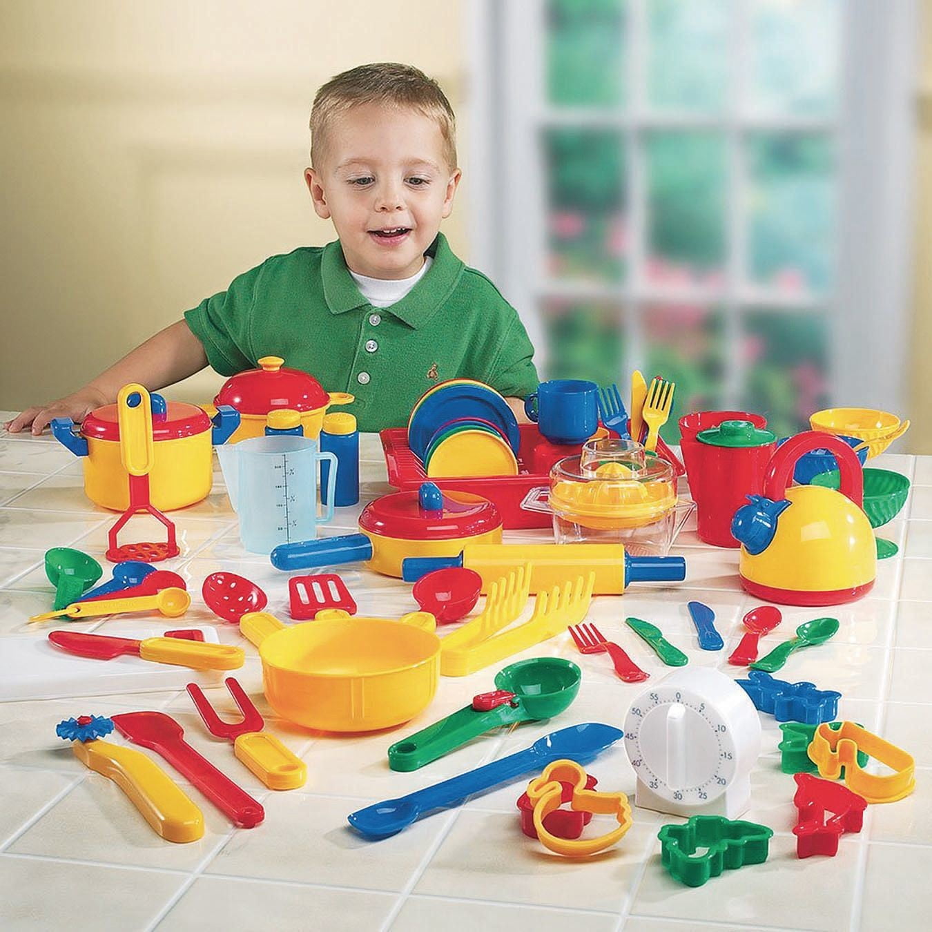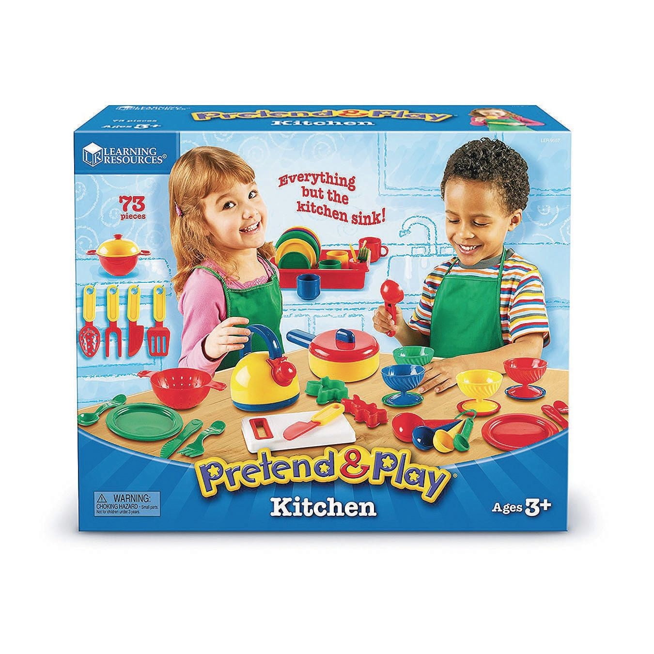 Learning Resources Pretend and Play Kitchen Set: Provide a truly gourmet play experience Little chefs can prepare and serve all their favorites with this super-sized set of pots, pans, utensils and dishes Bake cookies, prepare a dessert or plan a tea party This Learning Resources play kitchen set includes a dishpan especially for pretend washing up Dishpan measures 9.125″ x 7.5″ x 2″ Age range: 3 years and up