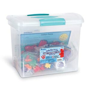 This versatile set is brimming with bears! Develop early math skills with a variety of colorful bear manipulatives, including 96 Three Bear Family Counters in six rainbow colors, six rainbow-colored sorting bowls, 2″ color cube, number cube, 16 pattern cards, 12 double-sided activity cards and bear game spinner. Packaged in a convenient plastic storage tub with carrying handle. Storage tub colors may vary.