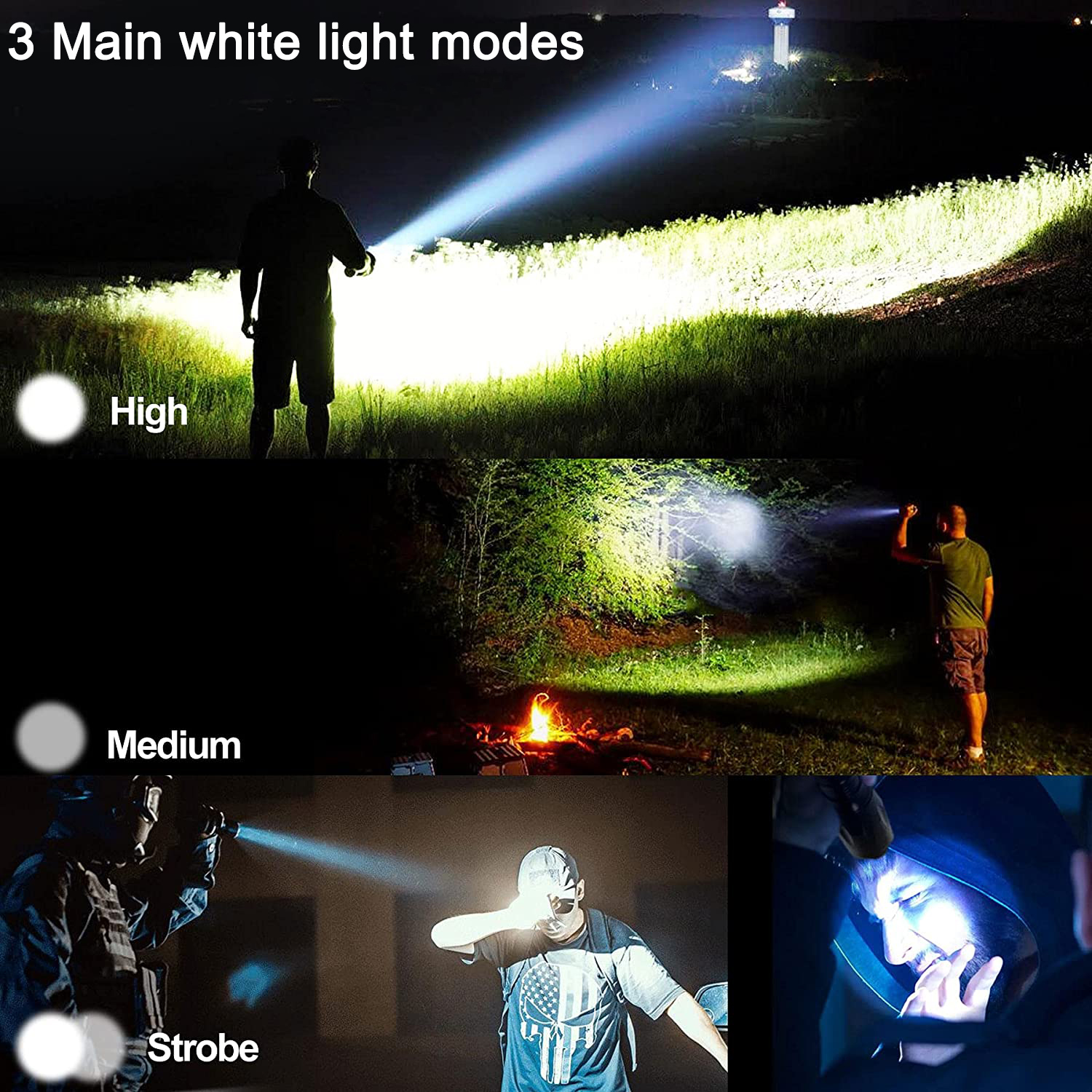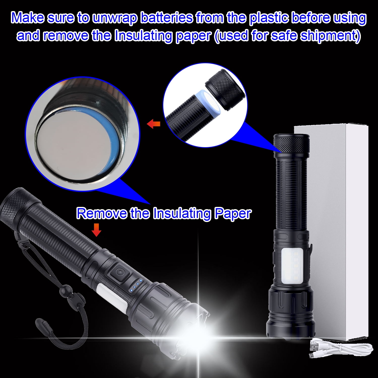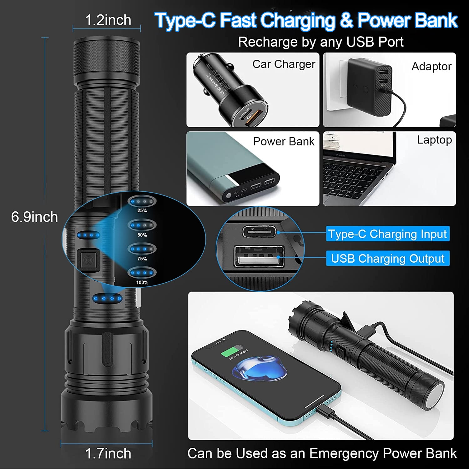 【Super Bright Flashlight & Long Running Time】 The Vastfire powerful high lumens 10000 flashlight is matched with high efficiency, high output and high power HP50.2 LED chip to provide up to 1650 feet of strong light and can light up an entire football field. Equipped with true 4500mAh rechargeable 21700 battery(Other 5000mAh and above batteries are just a joke), don’t worry about power problems. After our test, the high powered flashlight can be run up to 12 hours in low light mode. 【Tail Strong Magnetic Flashlight & COB Side Light】 The strong magnetic function is build in the tail of the LED flashlight, which can be adsorbed on the surface of iron metal at will, liberating hands anytime and anywhere. COB sidelight is another option for your large-area lighting at night. And can be used as maintenance, work lights or home emergency backup lights. 【Zoomable & 7 Light Modes & One Key Turn off】 Push/pull the head to adjust the focus, camping flashlight can create brilliant large-area floodlight or perfectly spotlight, and features 7 light modes: High/Low/Strobe/COB White High Light/COB White Low Light/COB Red Light/COB Strobe. Double-click the switch button to enter the COB side light mode. This handheld flashlight can be directly turn off at any mode via long press the power button 2-3s. No need to turn through all modes. 【Type-C Fast Charging & Power Bank】 Rechargeable LED flashlight build-in type c usb charging port, only need 4 hours to get the fully charged. Equipped with Type-C USB cable, can be charged with any USB port. The flashlight has 4 charging power indicator: 100% -75% -75% -50% -25%, it shows how much energy you could use. Banral flashlight can be act as emergency power bank to charge your camera, phone, laptop, etc during the travel. 【IPX7 Waterproof & Shockproof & Durable】 IPX7 waterproof Heavy duty flashlight uses a super hard aluminum alloy body and an impact-resistant design, and can withstand a 10-foot drop. The tactical flashlight is suitable for extreme weather in rain and snow etc. This led flashlight suitable for camping, running, hiking, climbing, hunting, fishing and other outdoor activities. Surprise function(Additional UV Light function) 🔦This UV flashlight has a 395nm UV lamp bead, which can help you find animal blood, urine, scorpions, etc. in the wild. Great for camping. 🔦Note that :the UV function can only be used in the dark.