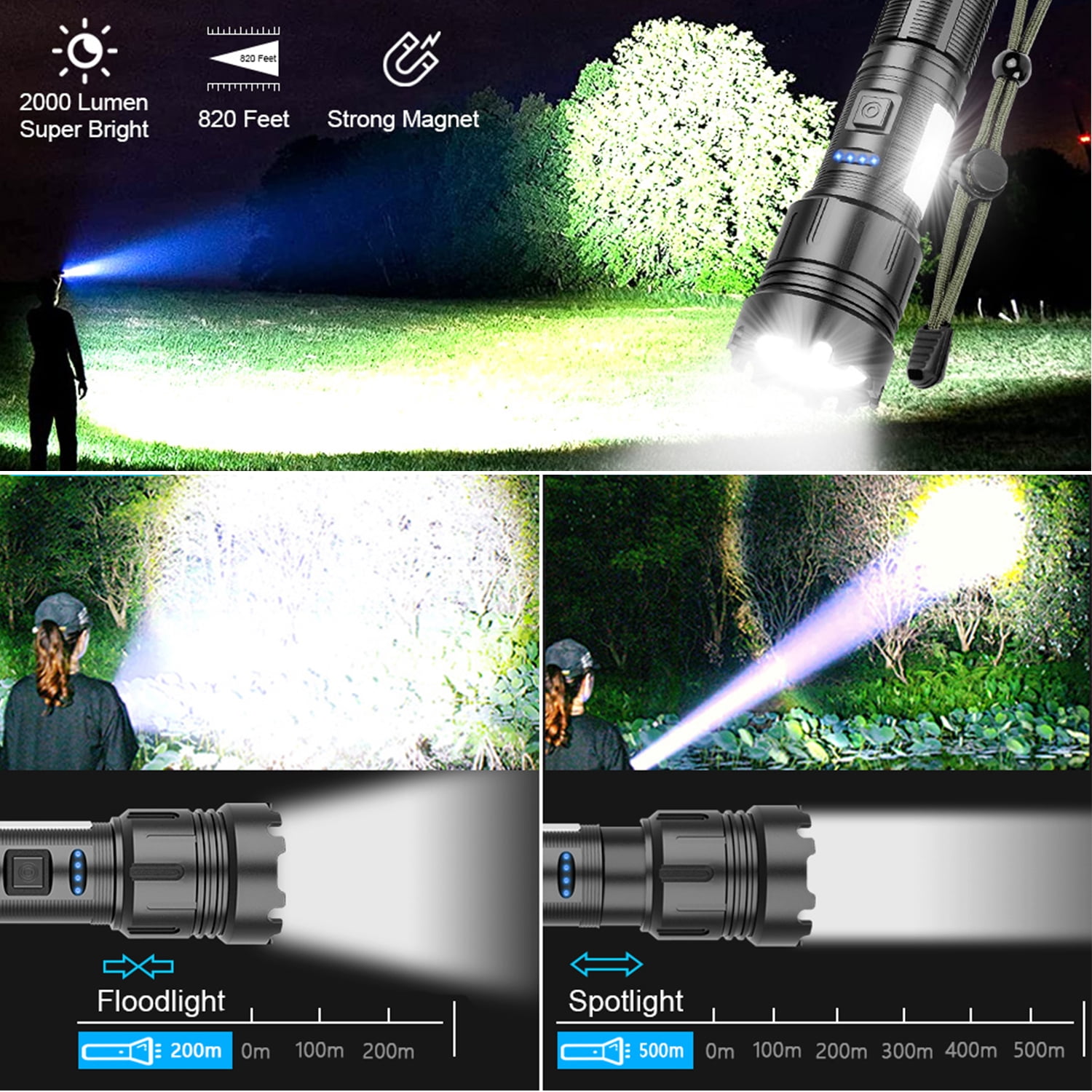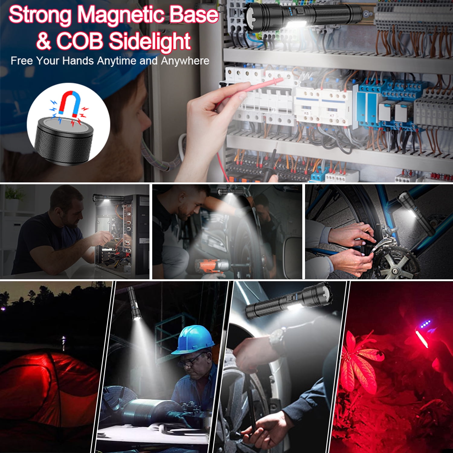 LED Magnetic Flashlight High Lumens 10000 Rechargeable, Super Bright Small Tactical Flashlights with COB Sidelight Work Light Zoomable Handheld Torch Lamp for Emergency, Camping
