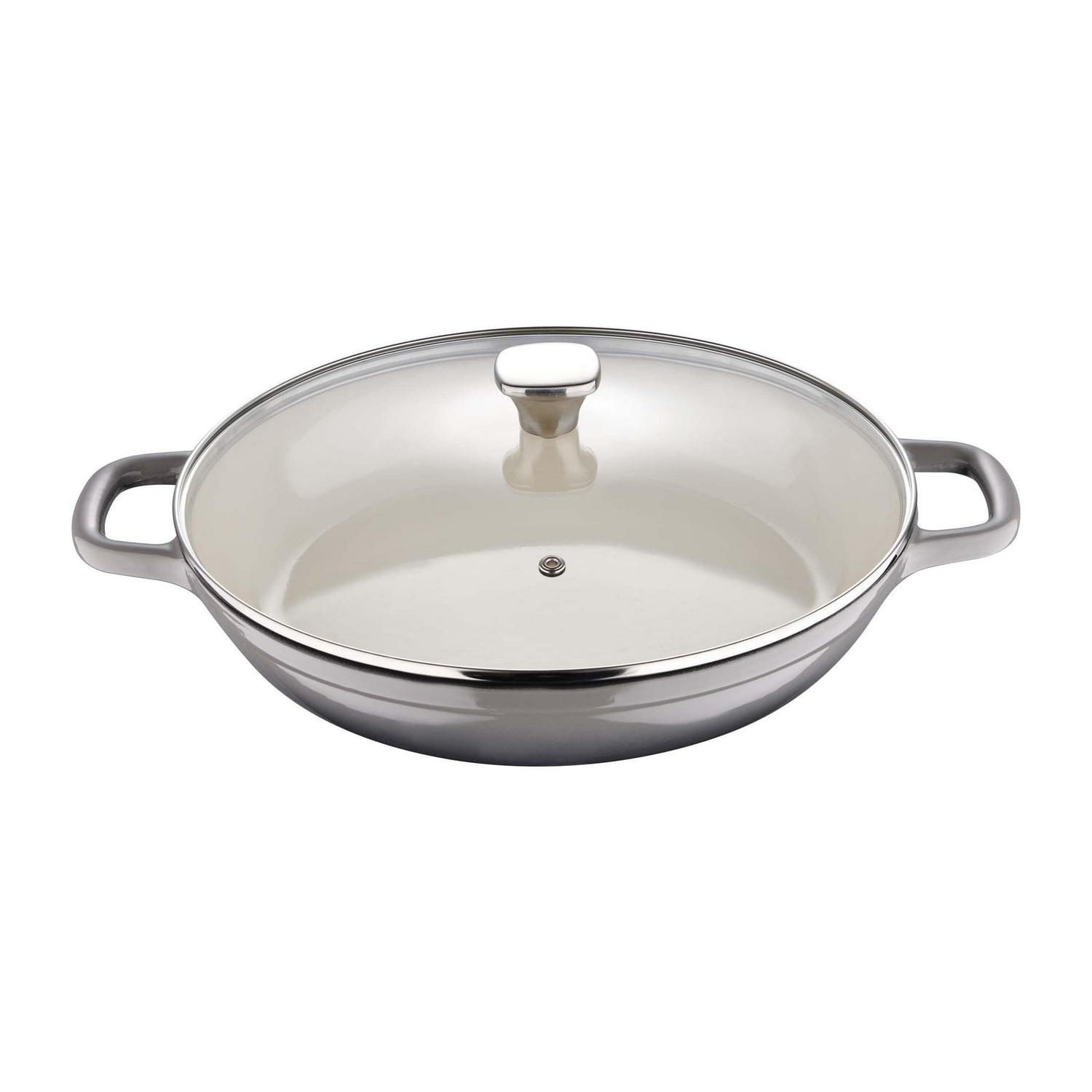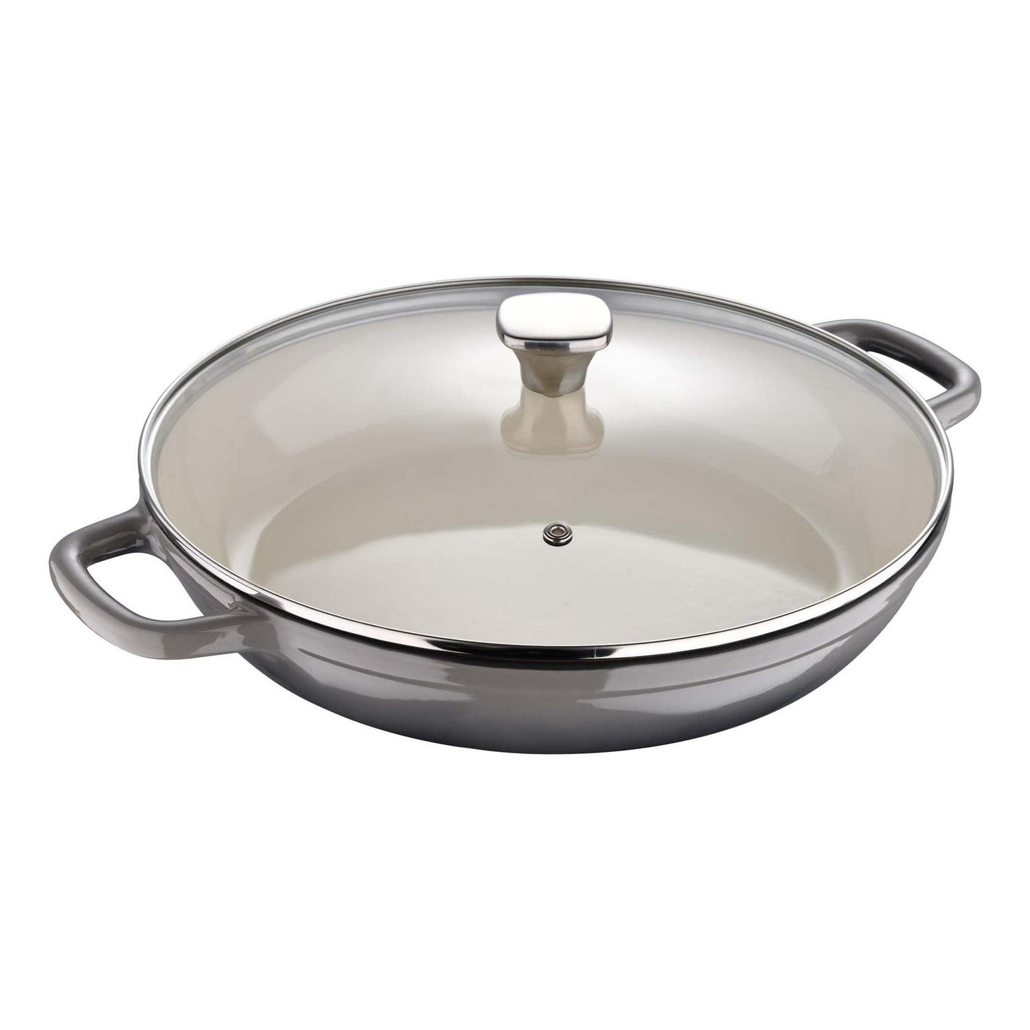 The enamel cast iron braiser from MasterPro has been designed to meet the culinary goals of every cook. This versatile pan can braise ribs, roast poultry, slow-cook gravies, fry chicken, bake dessert, and everything in between. The transparent glass lid and light-colored enameled interior allows for easy monitoring of the cooking process, so your results are always perfect. Cook up a storm in the kitchen then take the braiser to the table for a beautiful meal presentation.