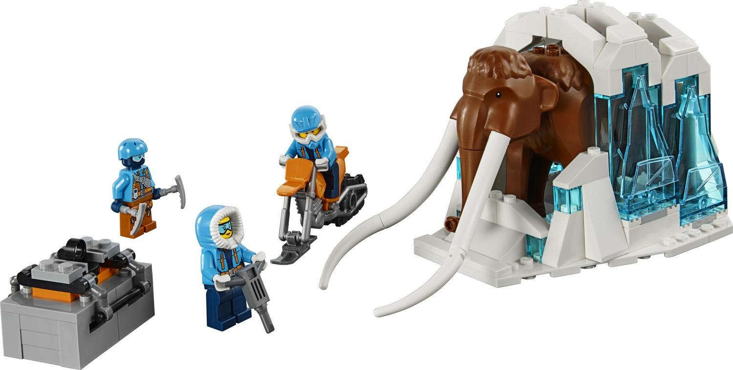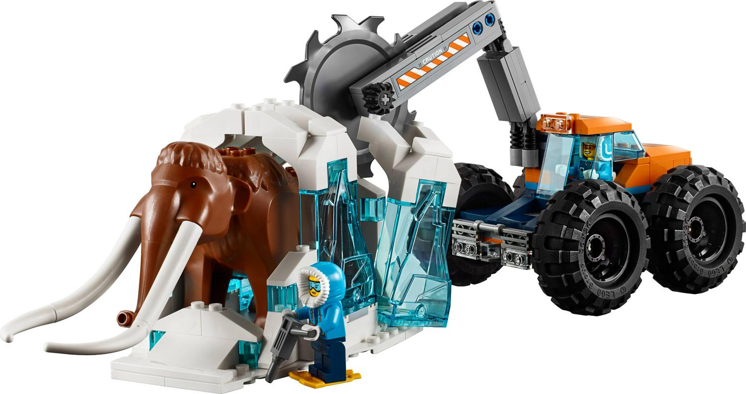 – Features a crane vehicle, a large hauling platform, a saw vehicle, a snow bike and a frozen mammoth figure
