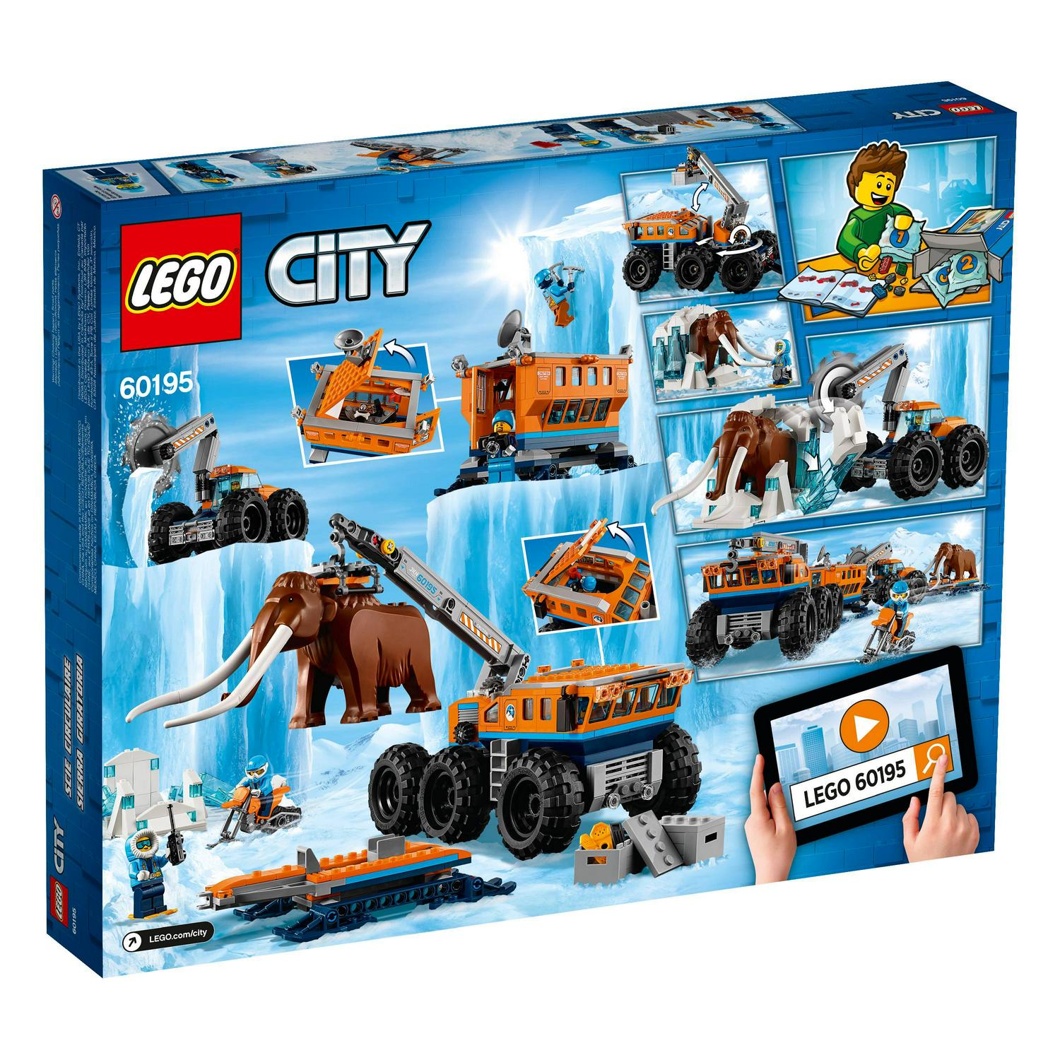 Investigate the wild winterlands with the LEGO City 60195 Arctic Mobile Exploration Base! This fun toy features a crane with posable arm, hook, platform and a trailer, plus a mobile lab unit with radar dish and opening door. Also includes a mobile saw vehicle with posable arm and rotating blade, plus a snow bike and a large ice fossil to hold the prehistoric Mammoth. This Arctic Expedition set includes 6 LEGO explorer minifigures and a Wooly Mammoth toy.