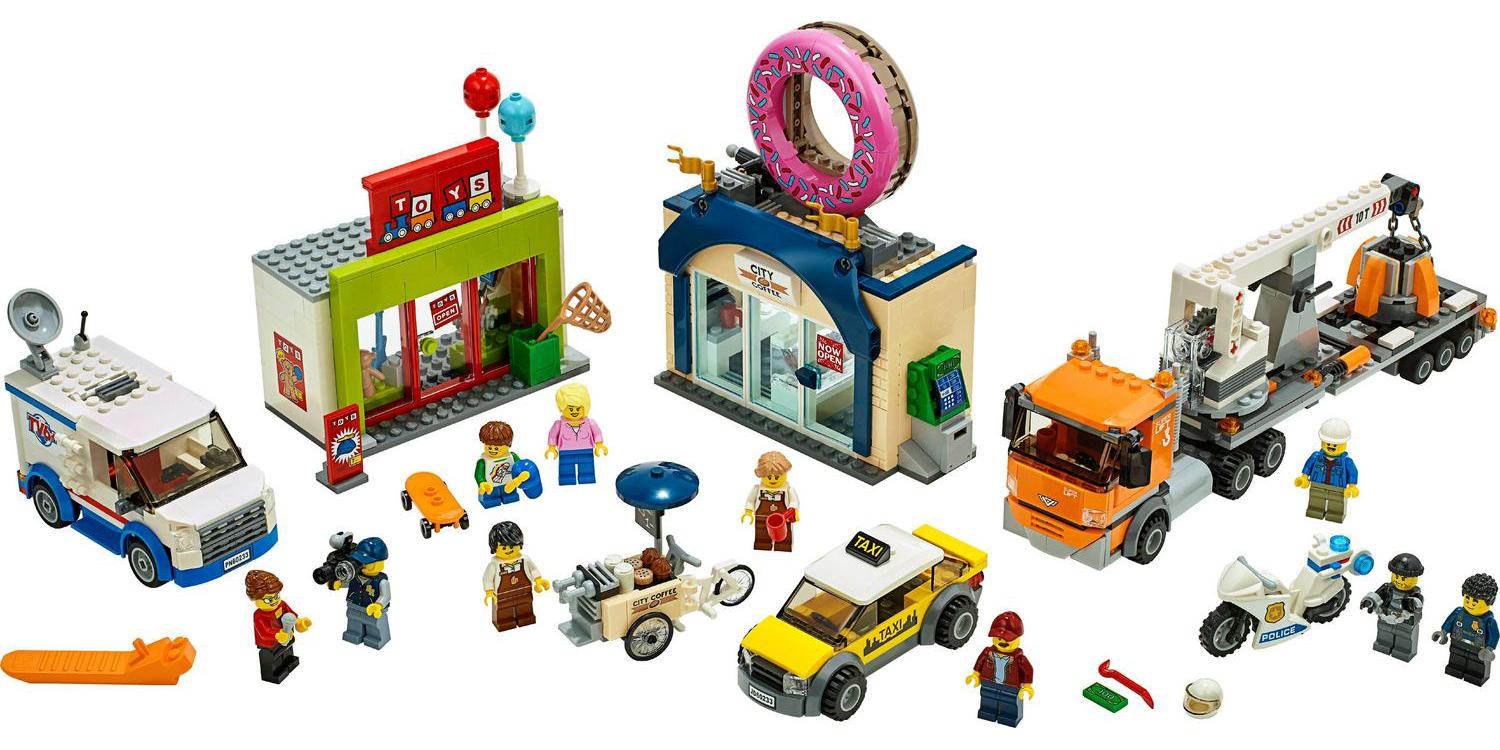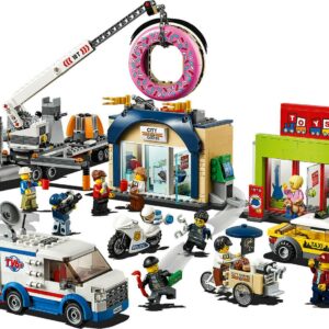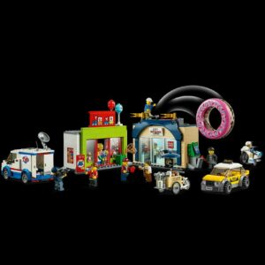 – This construction toy features a donut shop with coffee machine, opening door, trigger function to release the giant donut on top of the building and an ATM on the side, plus a toy shop with balloons and shelves for toys