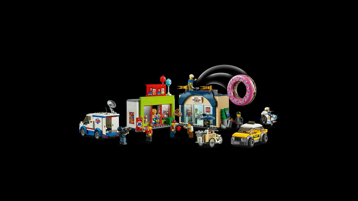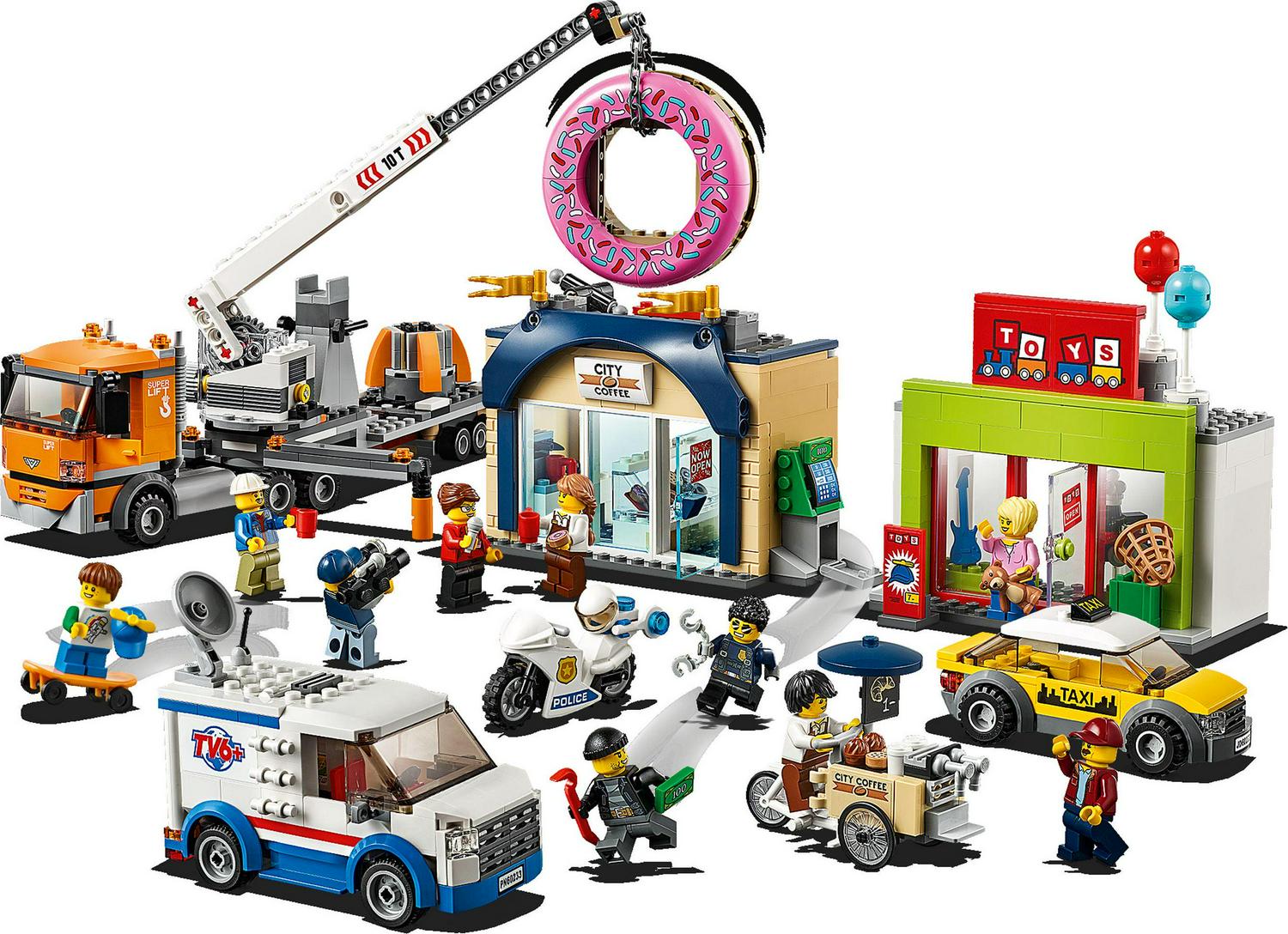 – Includes 10 LEGO City minifigures: police officer Duke Detain, a crook, toy store owner, 2 baristas, truck driver, reporter, cameraman, taxi driver and a child
