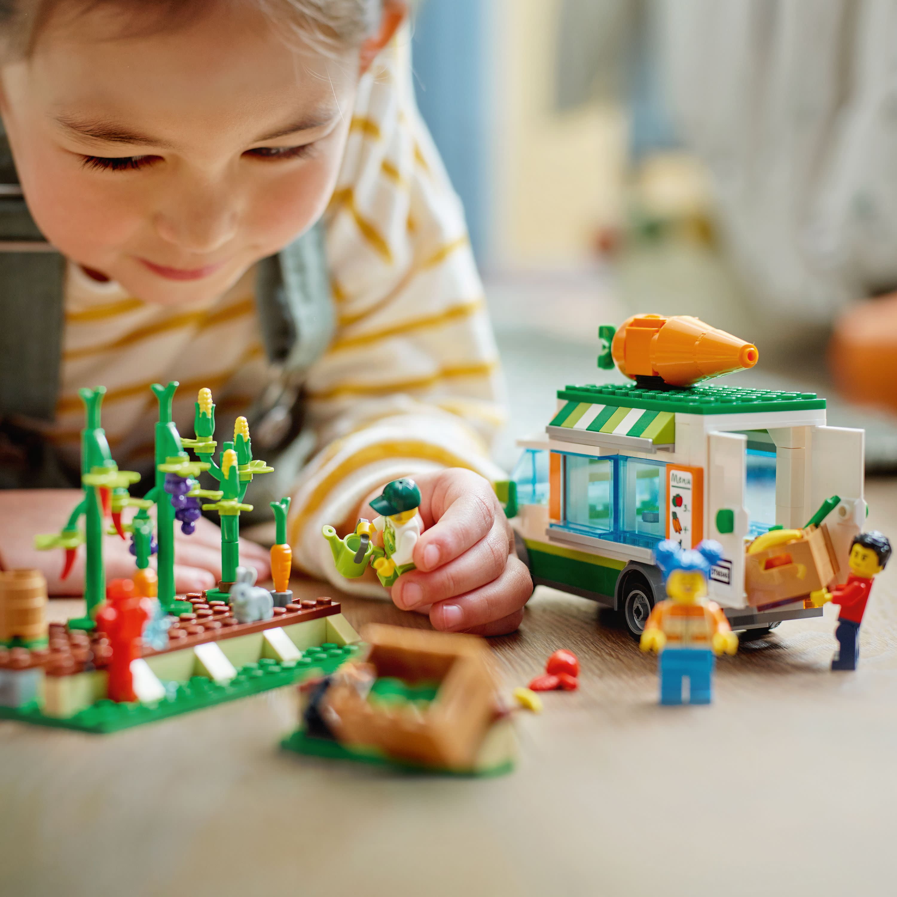 Children with a passion for shop play will love the LEGO City Farmers Market Van (60345), packed with inspiring details and functions for hours of imaginative play All kids need to build a mobile farm shop and veggie patch, with lots of play-inspiring features, plus 3 minifigures, including a LEGO City TV character, and a rabbit figure The Farmers Market Van comes with a serving window, opening side doors, rear doors and a minifigure cab, while the veggie patch features a fun carrot-growing function The Farmers Market Van playset can be given as a holiday, birthday or any-other-day gift for boys and girls aged 5 and up Dimensions When built, the LEGO City Farmers Market Van measures over 4 inches (10 cm) high, 10 inches (25 cm) long and 6.5 inches (17 cm) wide
