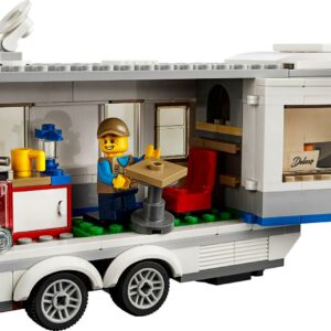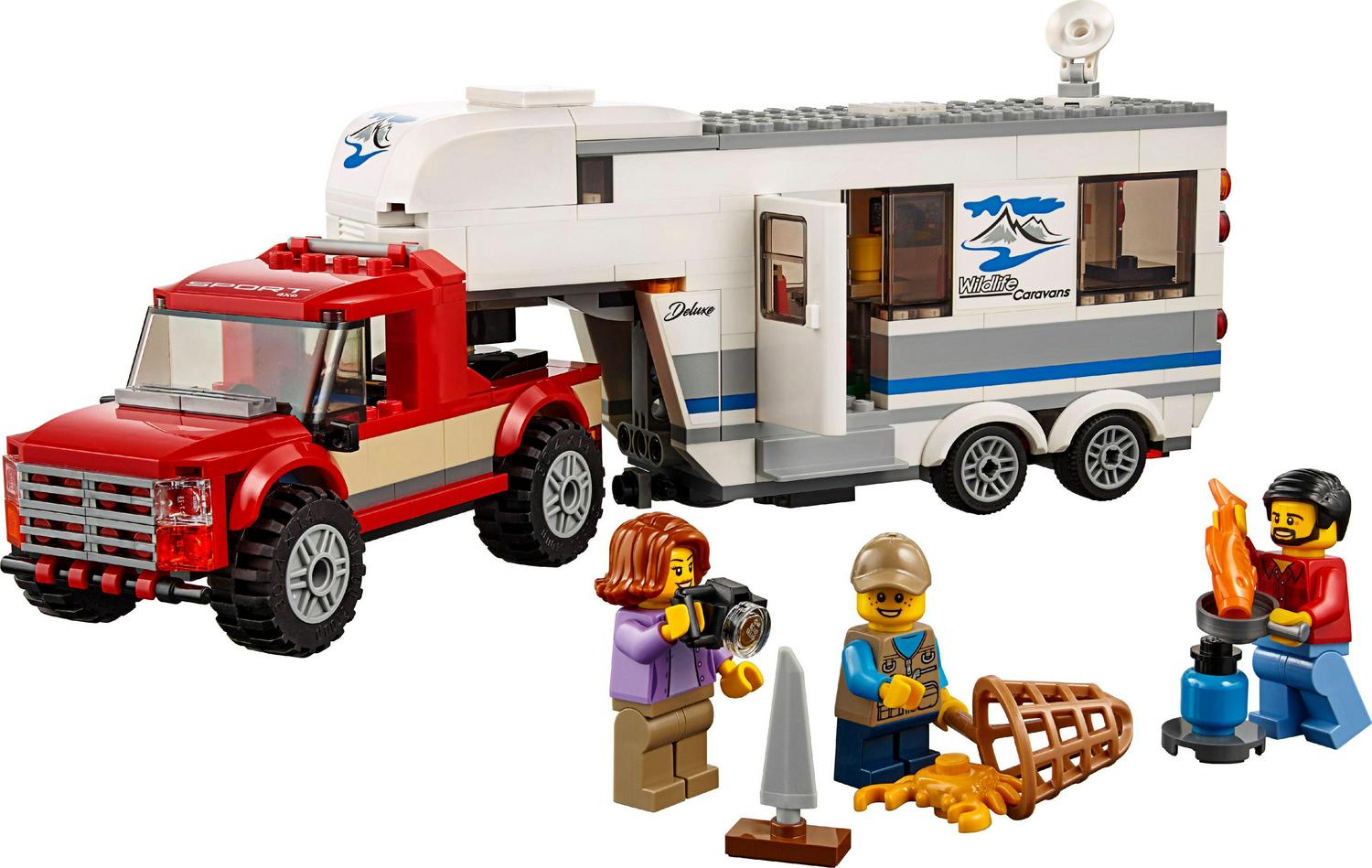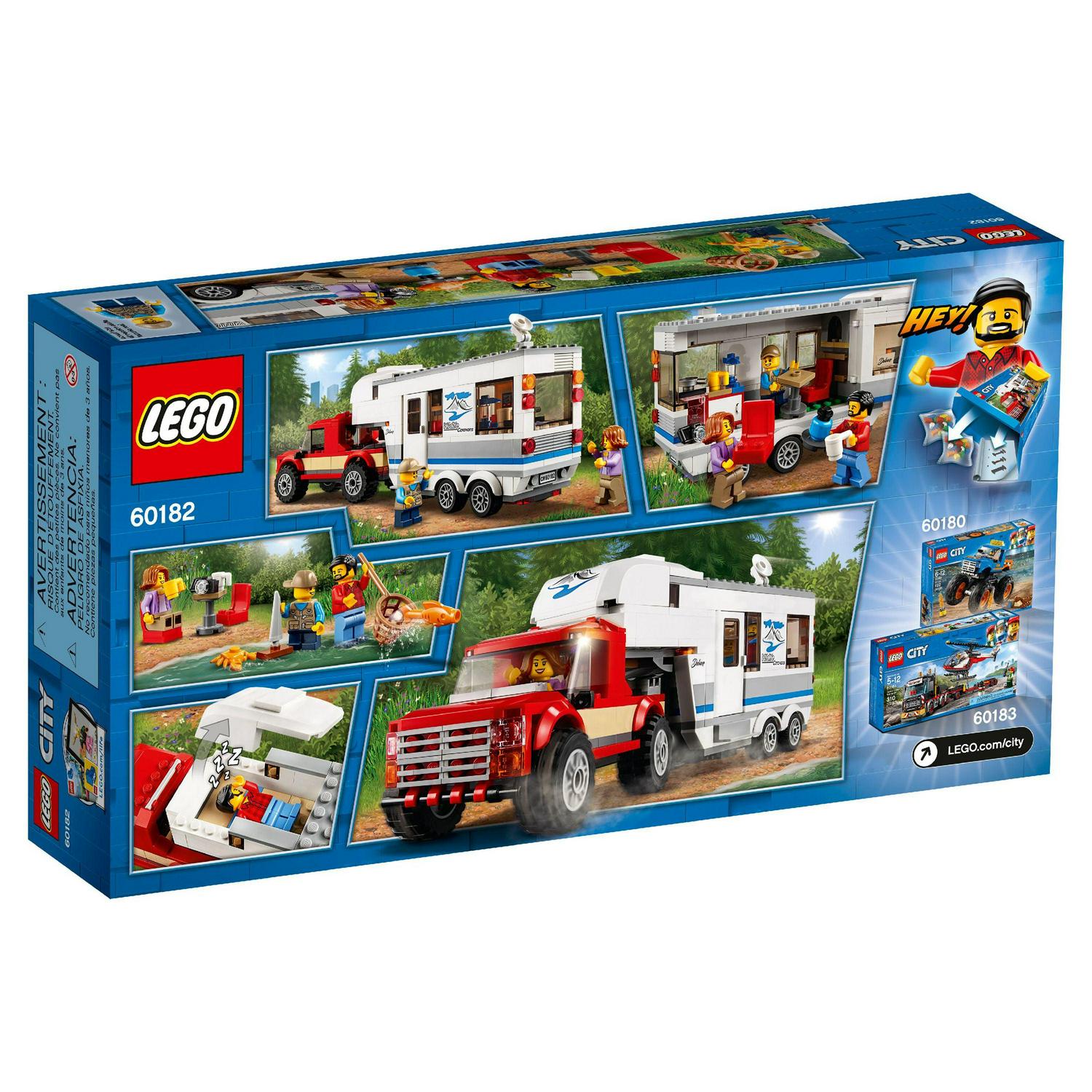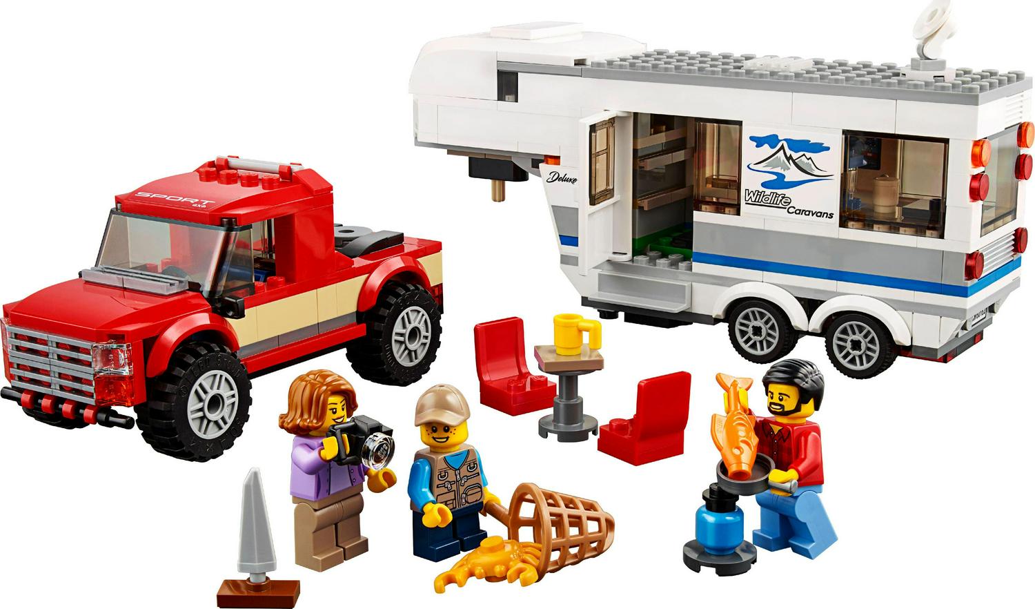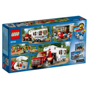 Head out into nature with the family in the LEGO City 60182 Pickup & Caravan, featuring a big caravan trailer with opening side, door, removable front roof to access the bedroom, removable furniture and a separate support leg to stand alone, plus a toy pickup truck with removable cab roof and bed with caravan model hitch. This pickup and trailer toy playset includes 3 minifigures and a crab figure.