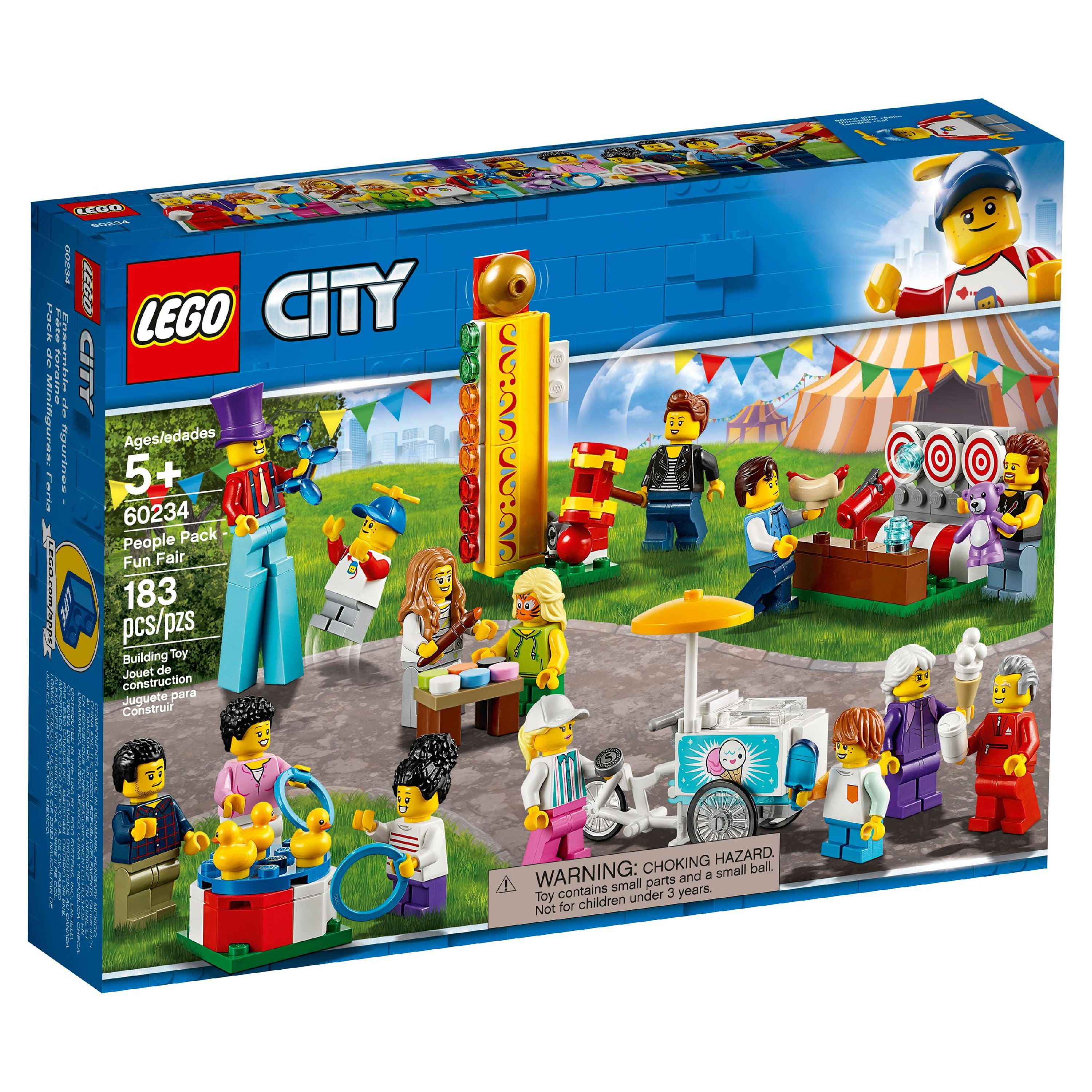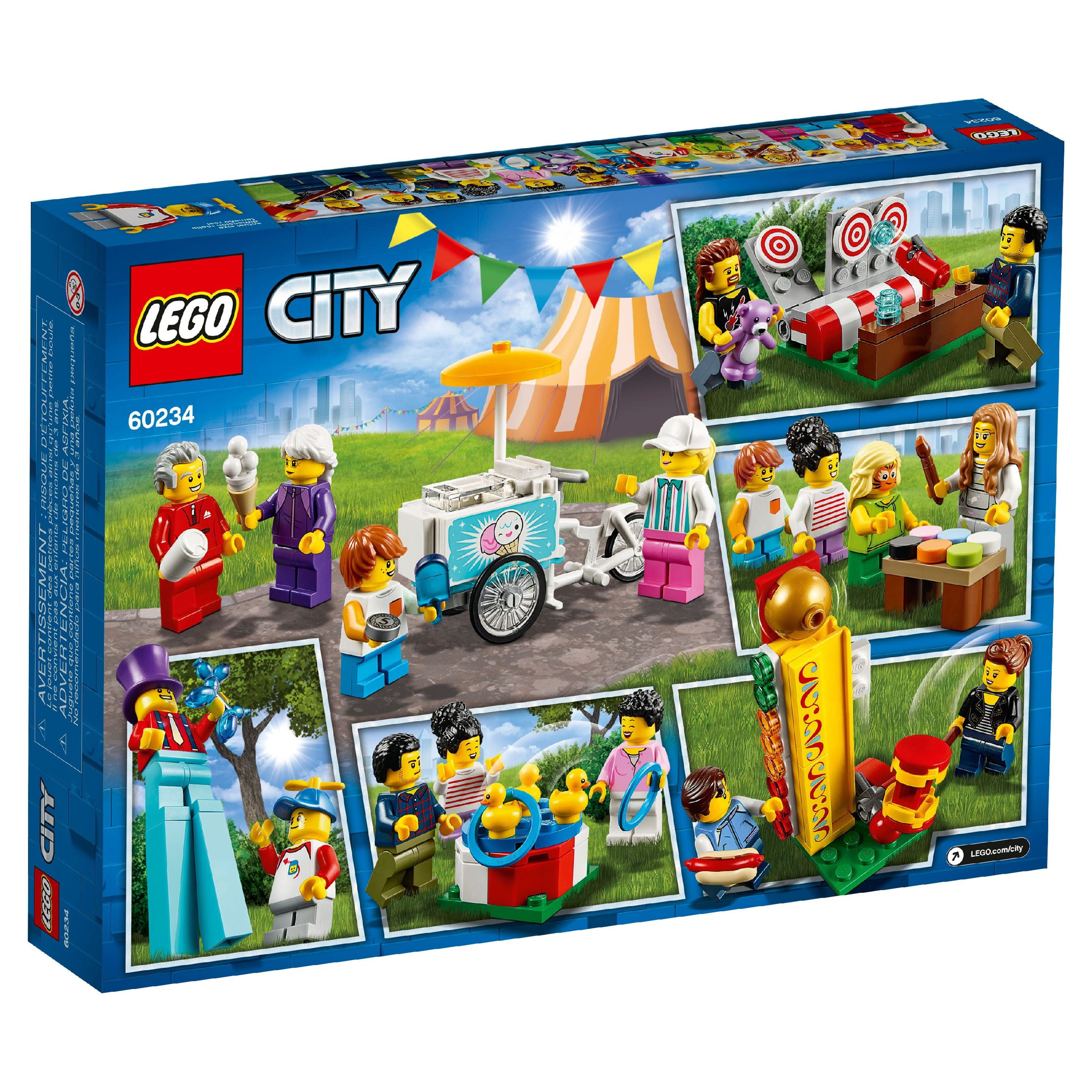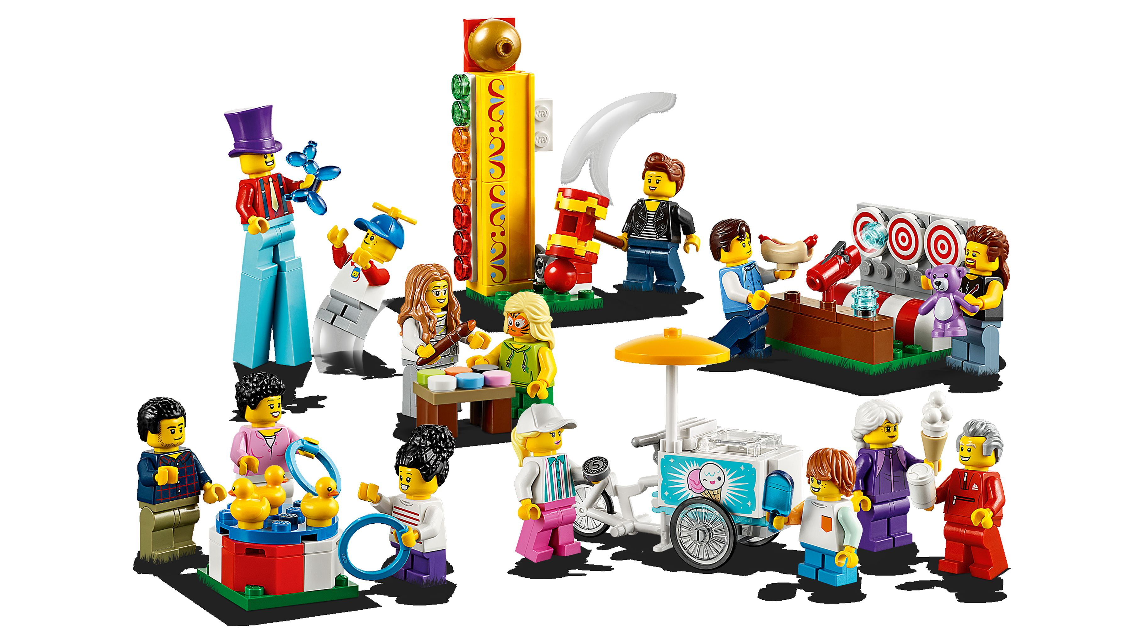 Includes 14 LEGO City minifigures: a stilt walker, 2 boys, 2 girls, 2 teenagers, grandpa, grandma, mom, dad, face painter, ice cream vendor and a fun fair stand worker Accessory elements include 2 rings, 3 new rubber ducks, a new whirly hat, ice cream cone, popsicle, paintbrush, 6 paint pots, teddy bear prize, 3 studs, balloon animal, hot dog and a buildable mallet Ice cream cargo bike measures over 2” (6cm) high, 2” (7cm) long and 1” (4cm) wide Shooting gallery game measures over 1” (4cm) high, 1” (5cm) wide and 1” (4cm) deep Duck pool ring toss game measures over 1” (3cm) wide and 1” (3cm) deep Strength test measures over 3” (8cm) high, 1” (3cm) wide and 1” (3cm) deep