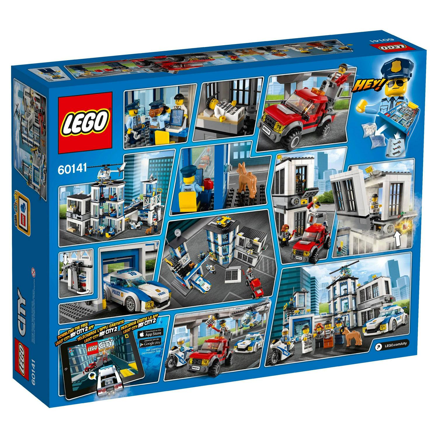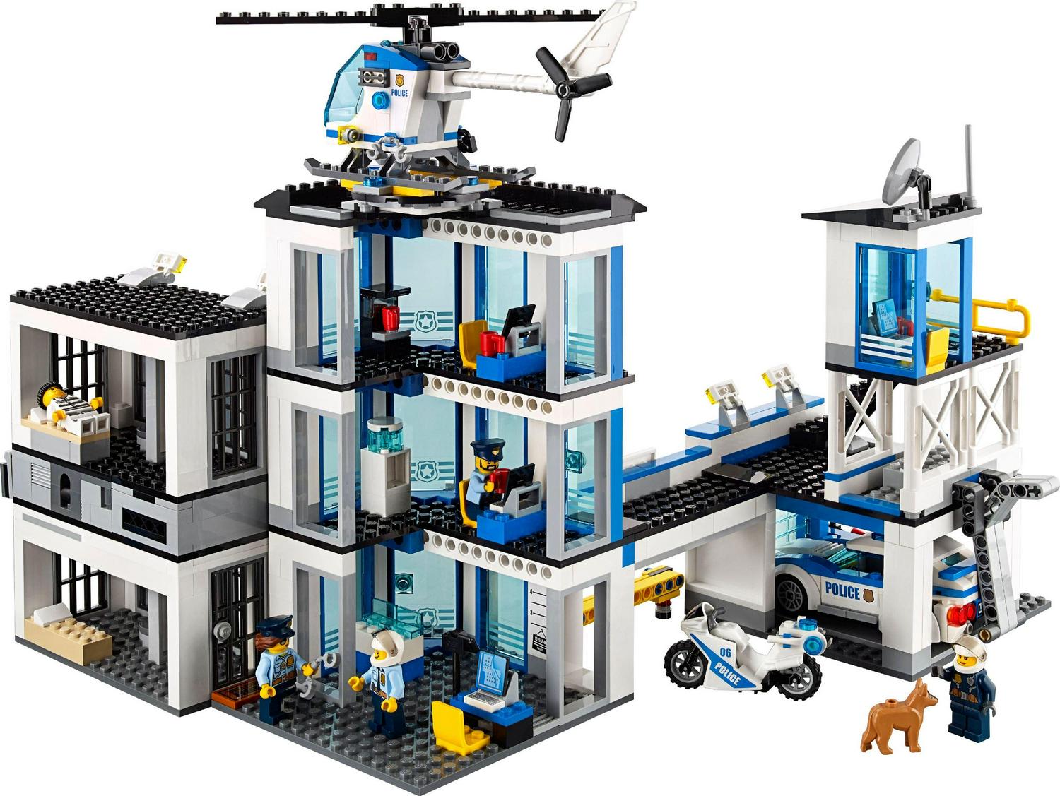 Be part of the action with the LEGO City police as they try to keep the crooks in jail, featuring a three-level Police Station loaded with accessory elements, a jail cell with exploding wall function, watchtower, garage and offices, helicopter, police pursuit car and police motorbike, plus the crooks truck with rotating, extendable cherry picker. Includes seven minifigures plus a police dog figure.