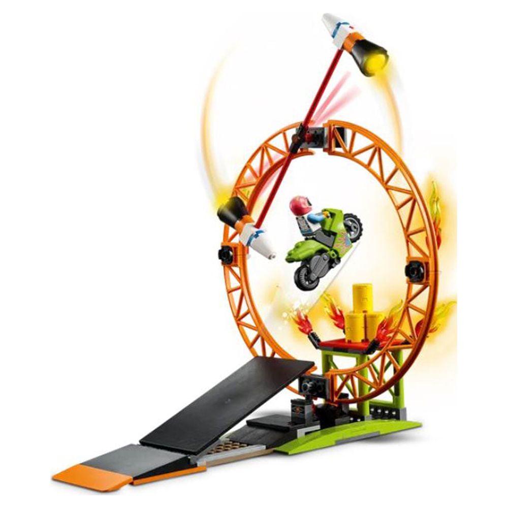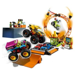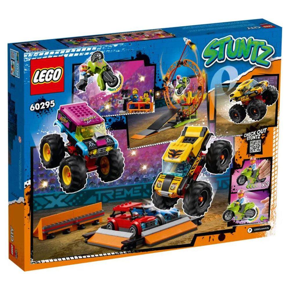 The LEGO City Stunt Show Arena (60295) playset comes with a flywheel-powered motorcycle and props for spectacular stunt action. Kids can launch the toy stunt bike through a ring of fire, perform backflips and stunts with 2 cool monster trucks and easily reconfigure the stunt modules for different performances. It comes with 6 minifigures, including 3 LEGO City TV characters. A build-and-play experience for kids aged 6 and up. The Stunt Show Arena set includes a printed building guide and Instructions Plus. Part of the free LEGO Building Instructions app for smartphones and tablets, this interactive guide with zoom and rotate viewing tools really does make LEGO building child s play. Make kids the stars of the show! LEGO City Stuntz sets put kids at the heart of the action, with flywheel-powered bikes, cool vehicles, realistic structures and fun characters that inspire imaginative role play. Combine sets from the action-packed LEGO City Stuntz universe for even more fun and excitement!