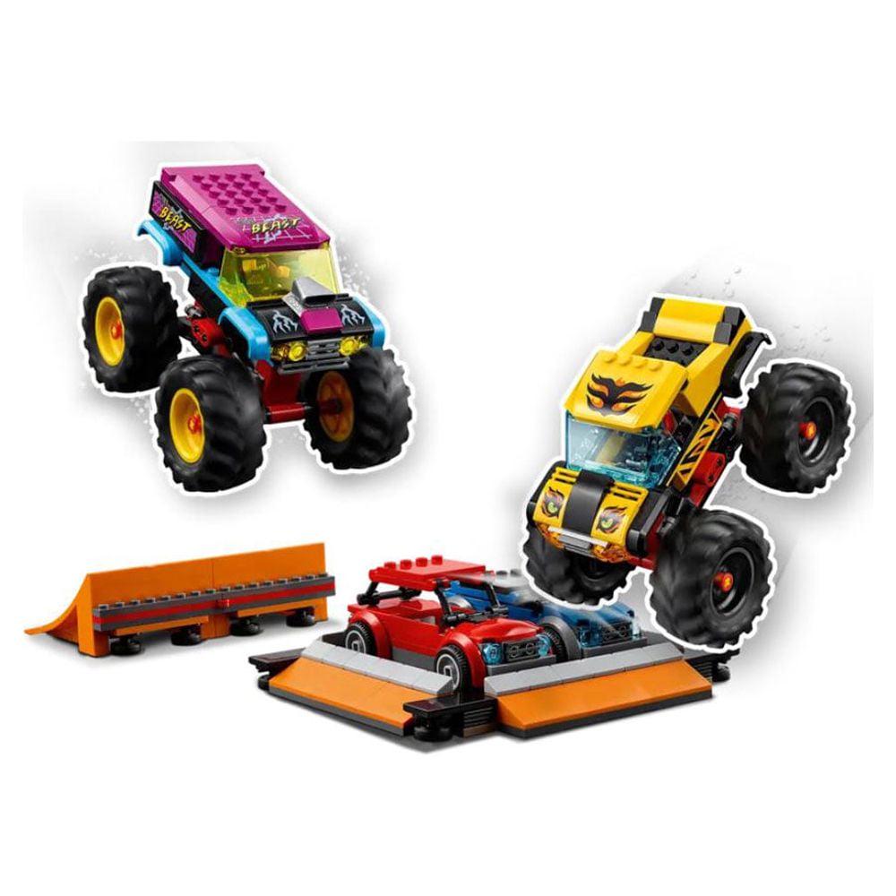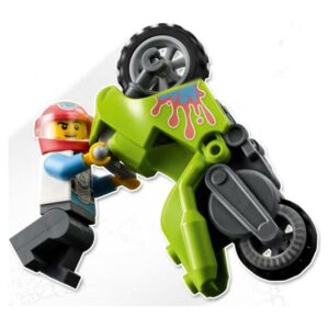 – Kids stage awesome displays and competitions featuring a flywheel-powered stunt bike and 2 car-crushing monster trucks. Combine this set with others from the LEGO City Stuntz range for even more fun!