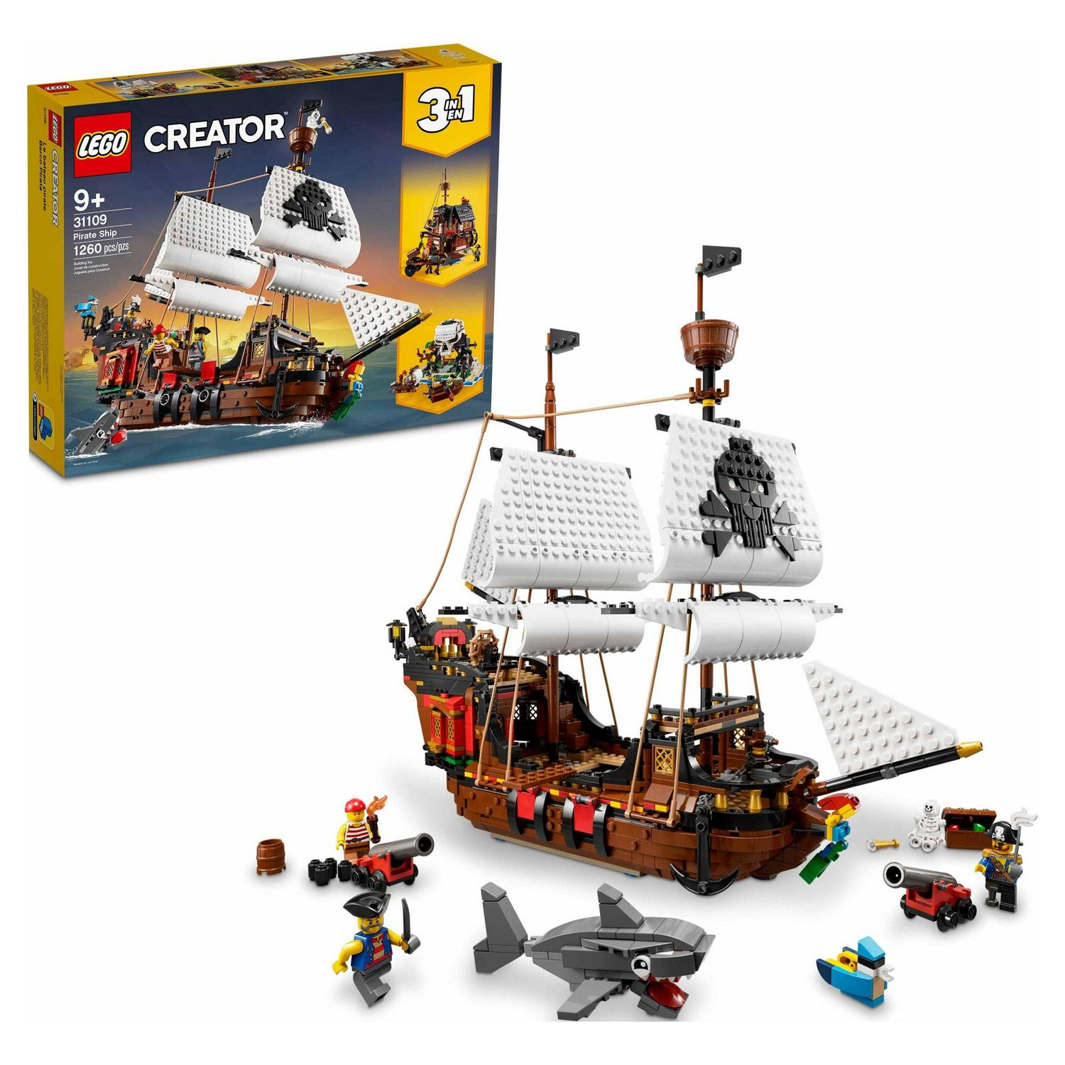 LEGO Creator 3 in 1 Pirate Ship Building Set, Kids can Rebuild the Pirate Ship into an Inn or Skull Island, Features 4 Minifigures and Shark Toy, Makes a Great Gift for Kids Ages 9+ Years Old, 31109