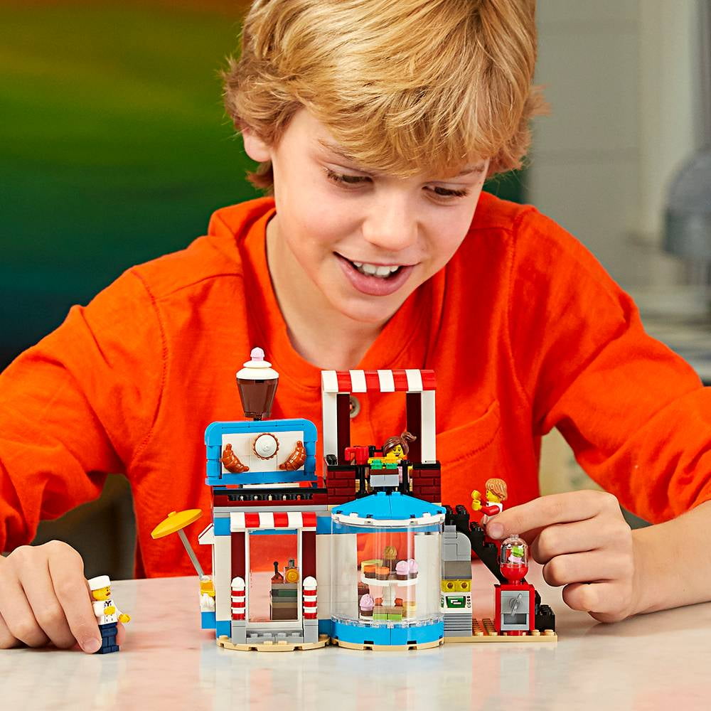 Includes 3 minifigures: a shopkeeper and 2 customers Features a buildable LEGO® cake shop with a colorful facade, large bay window, rotating cake stand, 3 red-and-white striped awnings, roof terrace with seating area, cake-and-pastry-decorated cake sign, ATM, plus a vending stand, gumball machine, and flower and cupcake decorations Prepare appetizing cupcakes and pastries and display them in the large bay window Serve customers with treats and beverages at the vending stand Take the stairway to the seated roof terrace Easily swap the window, door and other modular sections to customize the cake shop with the LEGO® Creator modular system Continue the adventure with this 3in1 model Rebuild the cake shop and take a break at a relaxing Pool House or open a cozy Food Corner Café Cake shop measures over 6” (16cm) high, 8” (22cm) wide and 4” (11cm) deep Pool House measures over 5” (13cm) high, 6” (16cm) wide and 4” (12cm) deep Food Corner Café measures over 3” (8cm) high, 9” (23cm) wide and 3” (10cm) deep